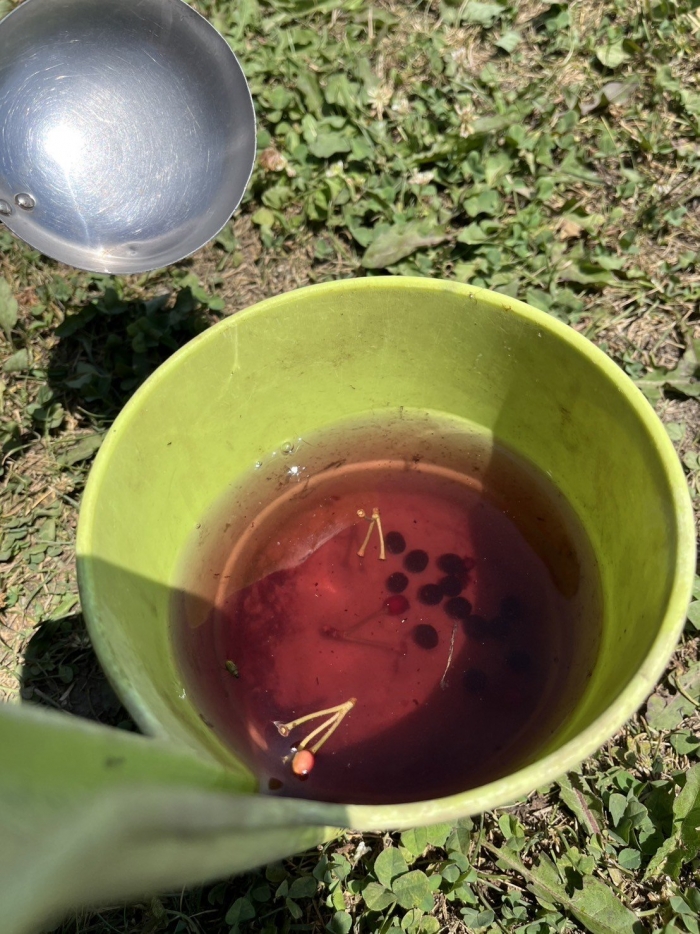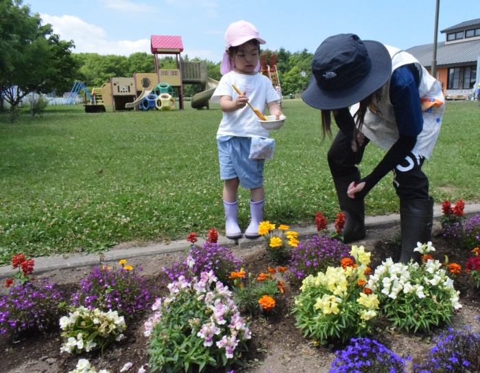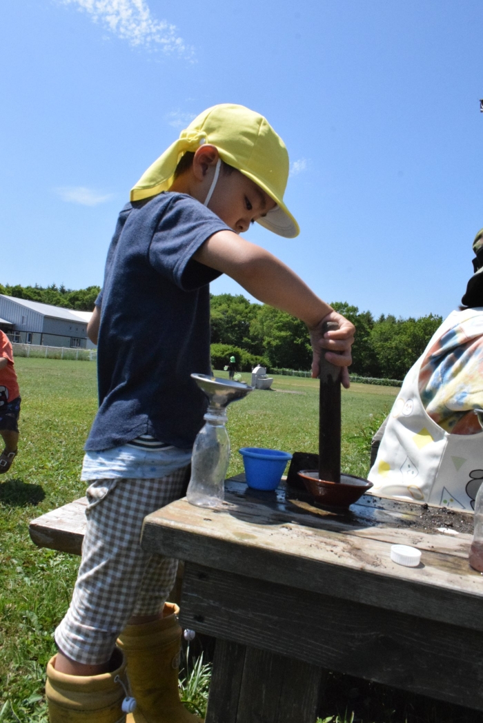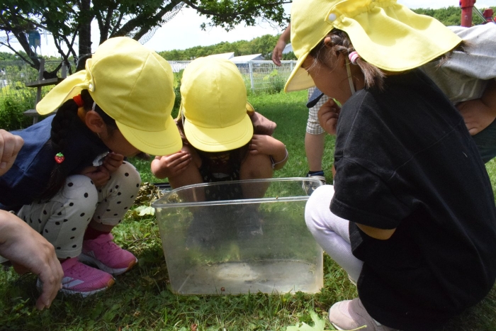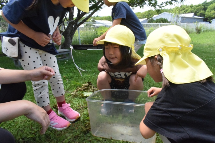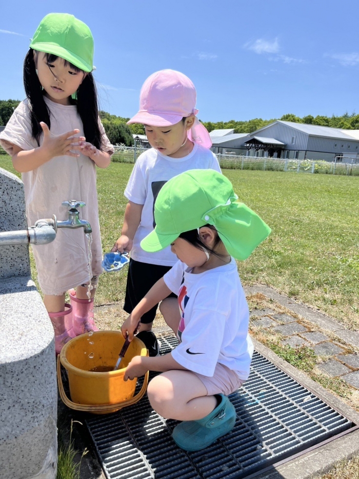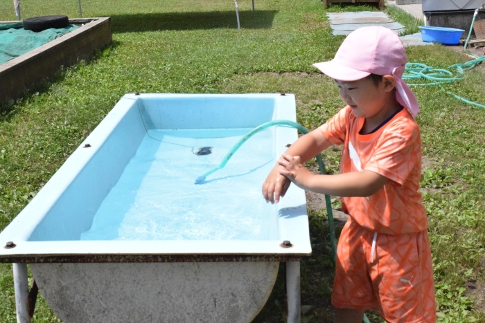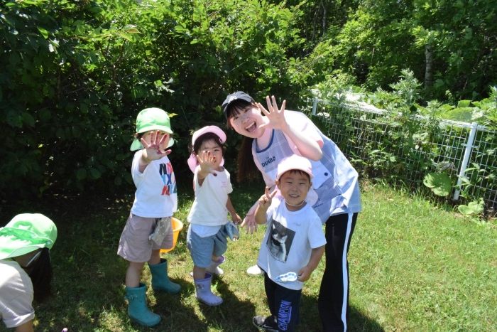 今日は昨日に比べるとだいぶ涼しくて過ごしやすかったですね。園開放日のお友達も外に出てきてくれて一緒に遊ぶことができました。花壇の花や,さくらの実をつぶして色水作りをしたりするお友達もいました。きれいなあかむらさき色になった色水を大切にしていましたよ。もも組さんはお部屋で飼っていた毛虫を逃がしてあげていたようです。毛虫に驚いてしまった園開放日のお友達もいたようです。写真のみご紹介しますね。