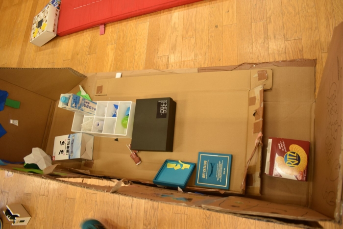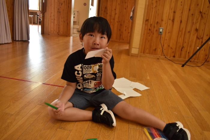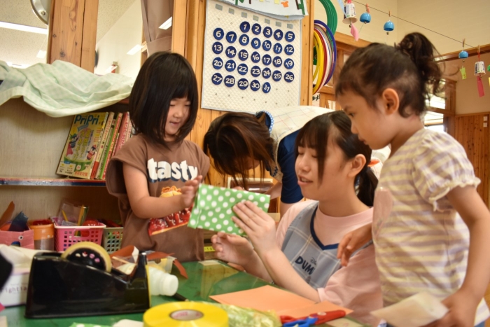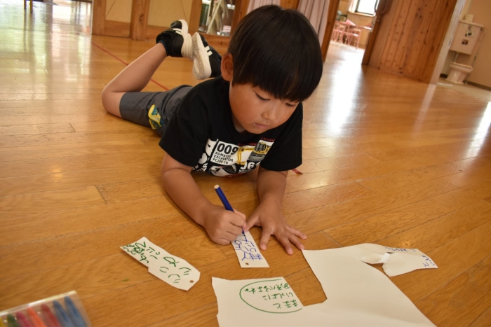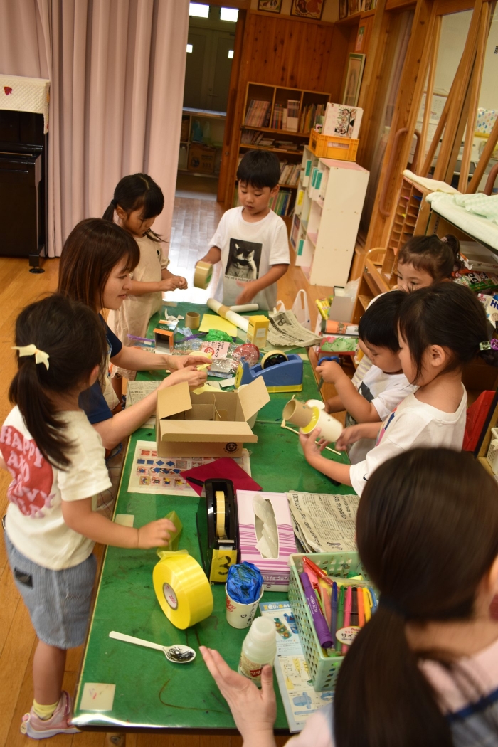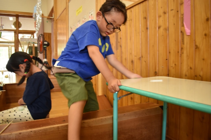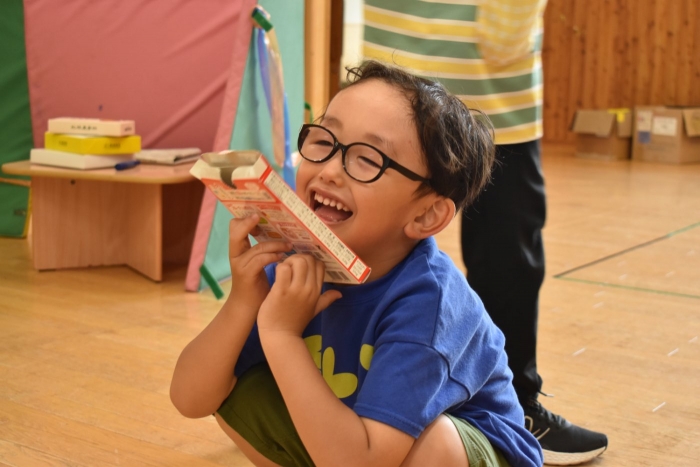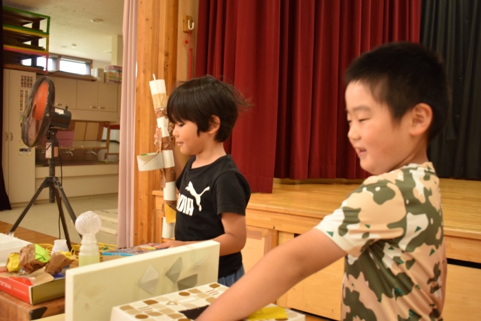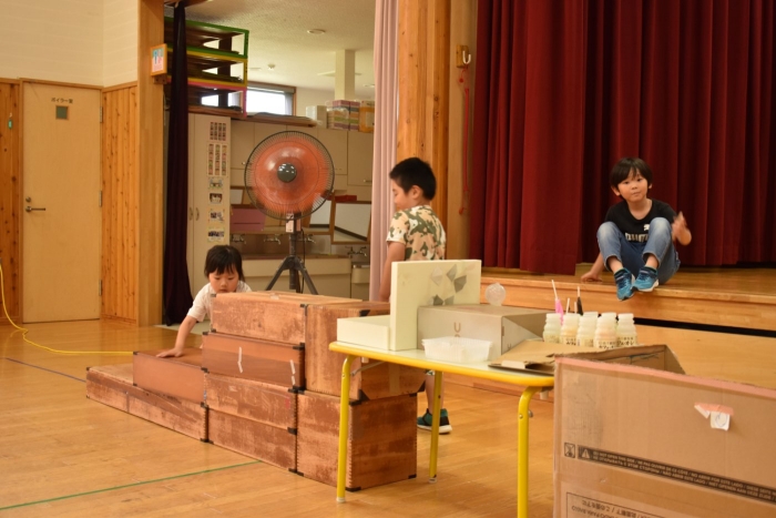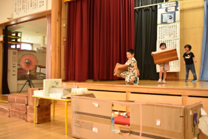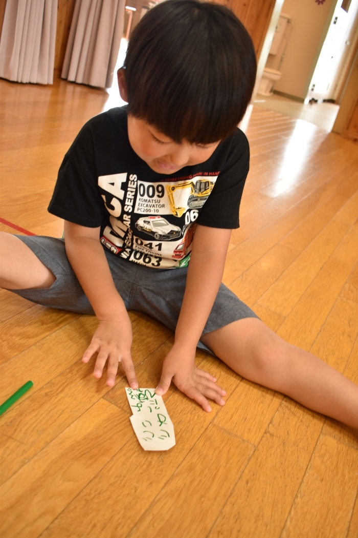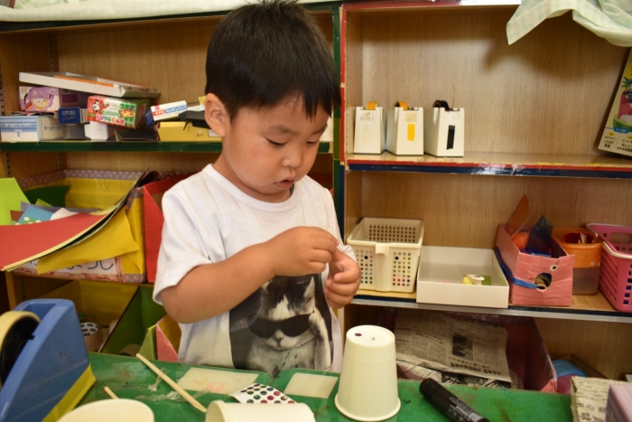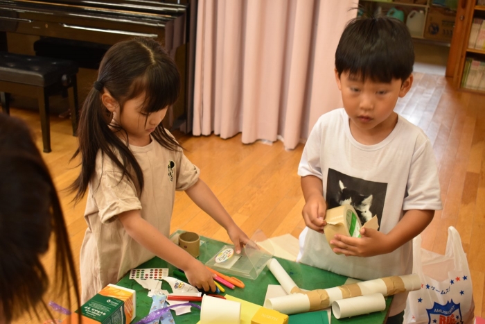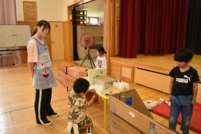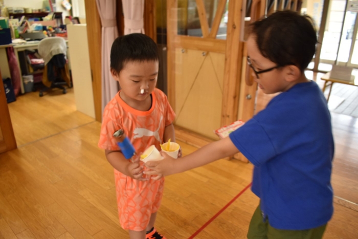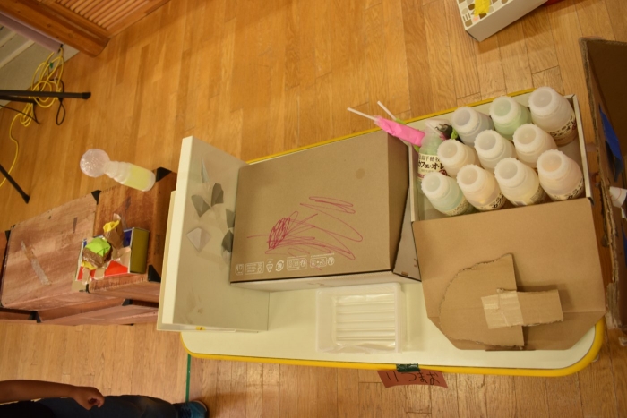 朝はお祭りごっこの開店準備をしているお友達。どんな感じのお店をイメージしているのでしょうか。お友達と必要なものをせっせと運んでいます。お部屋で作っていた商品も並べて…。