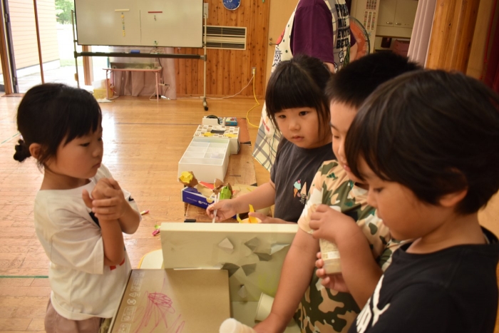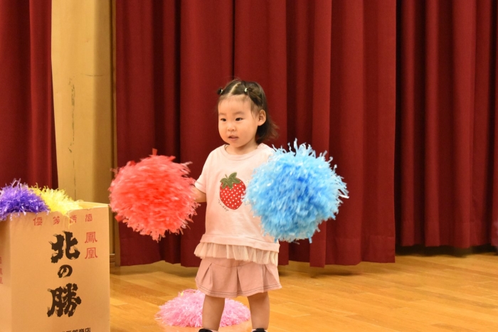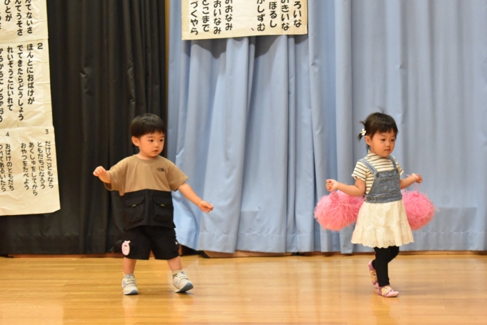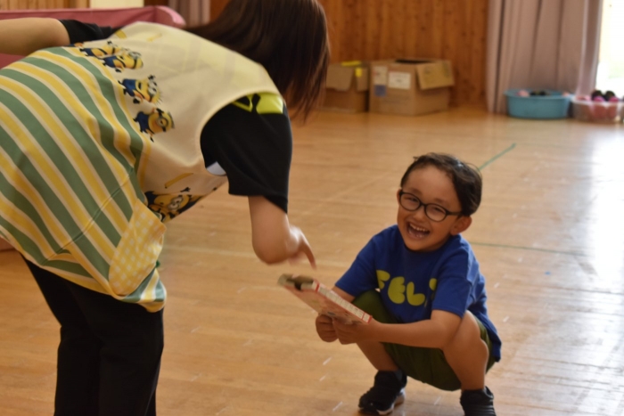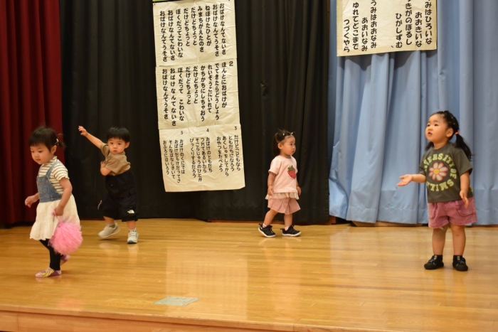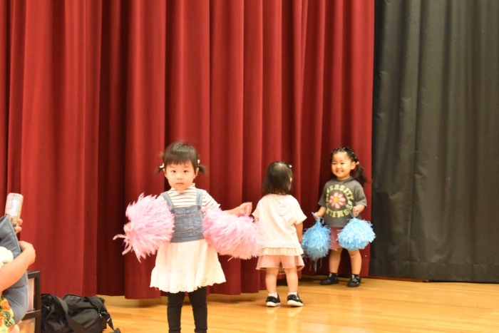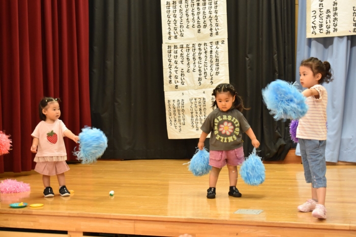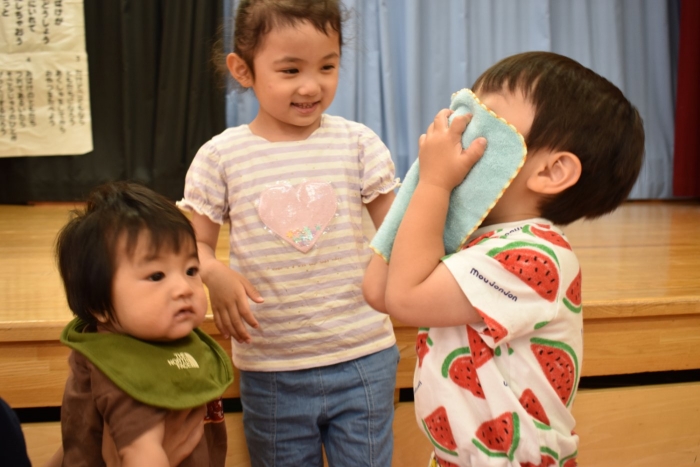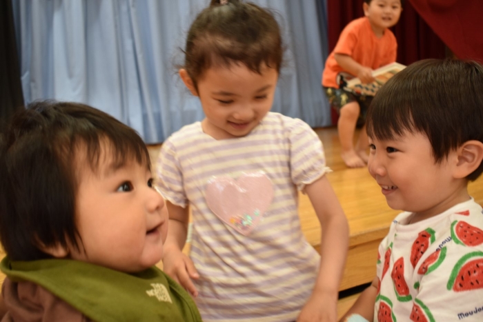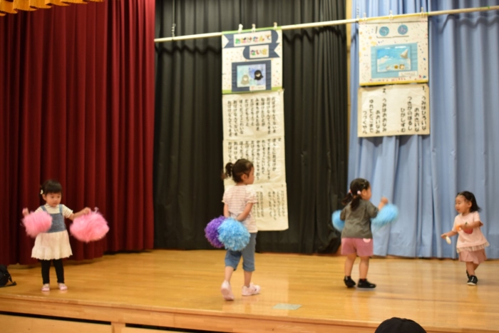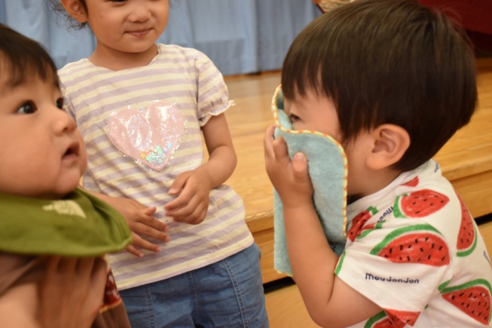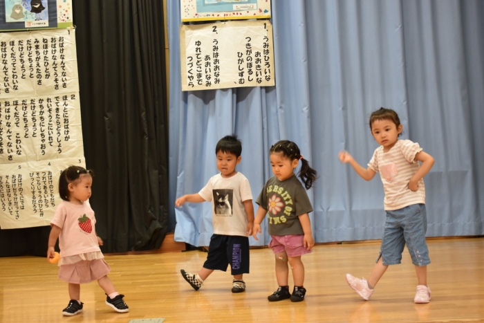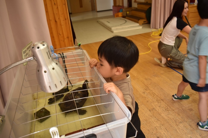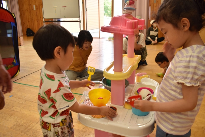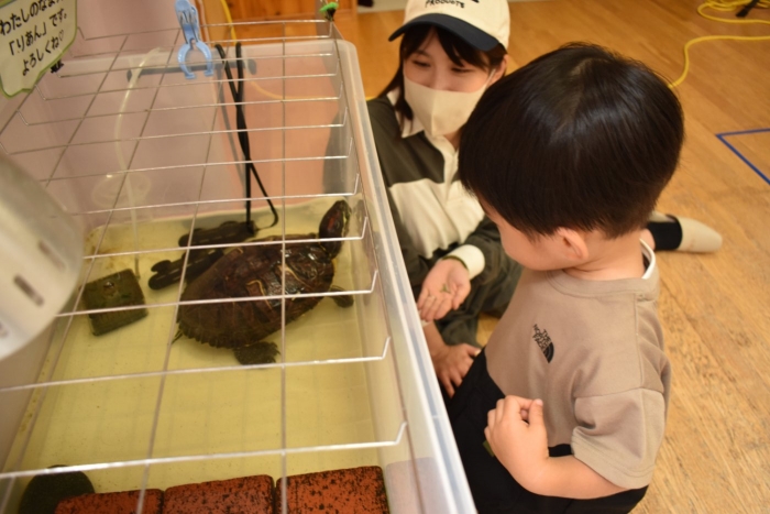 今日の園開放日は9名のお友達が遊びに来てくれました。今日初めて遊びに来てくれたお友達もいましたよ。幼稚園の子どもたちは外遊びに行きましたが園開放日のお友達と遊びたくて,一緒にプレイルームで遊ぶ子もいました。おままごと遊びや,お遊戯曲をかけてステージでダンスする子,亀のりあんちゃんや,お部屋に海の生き物を観察に行く子… お母さんやお友達と一緒に幼稚園で楽しく遊べたかな?