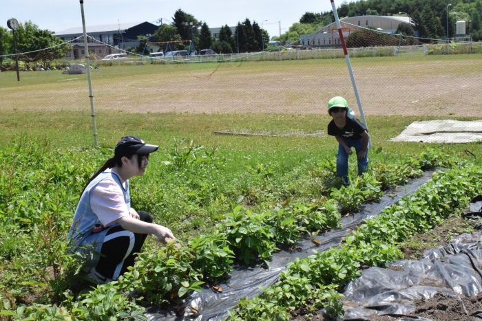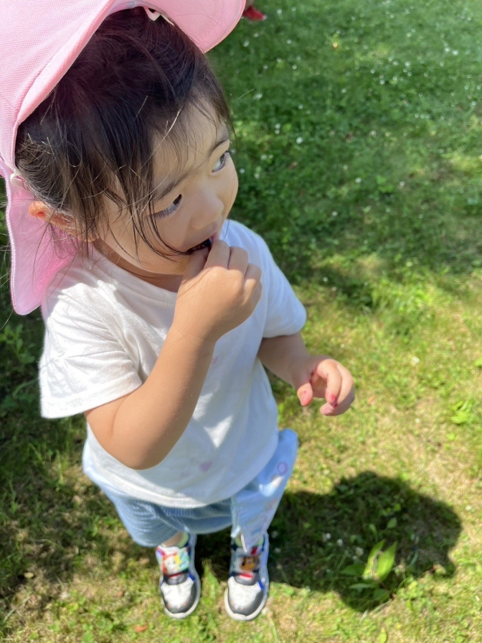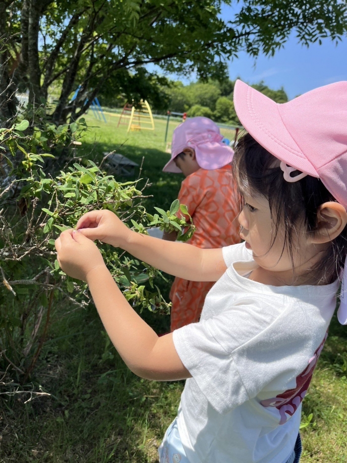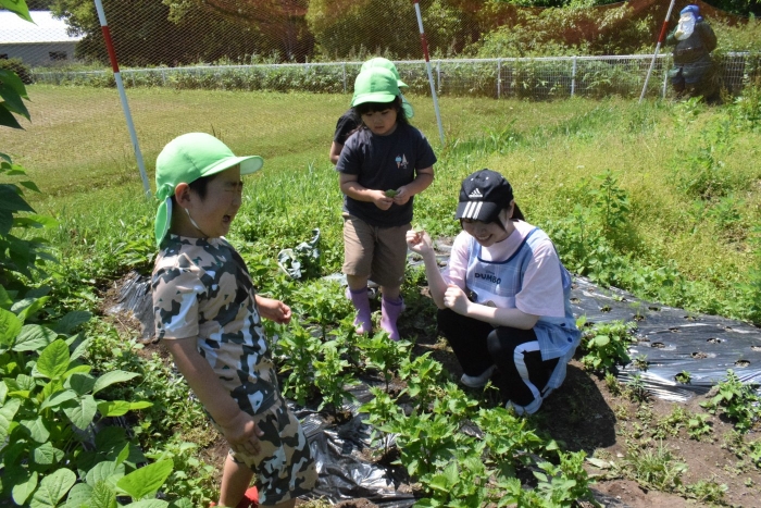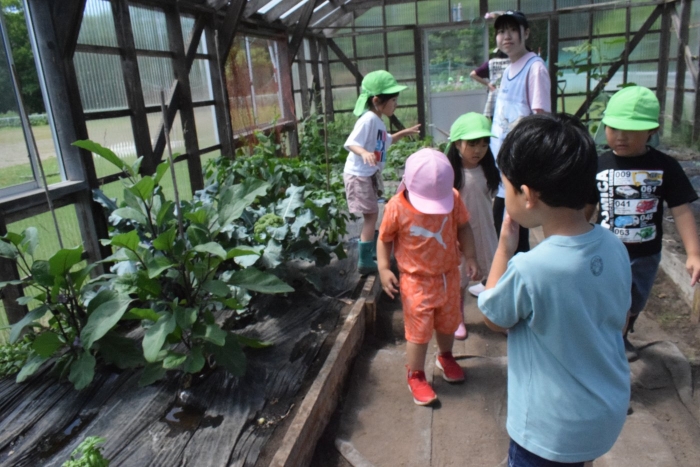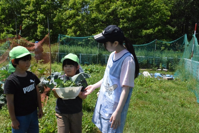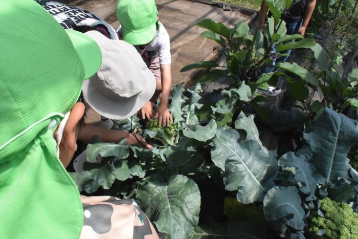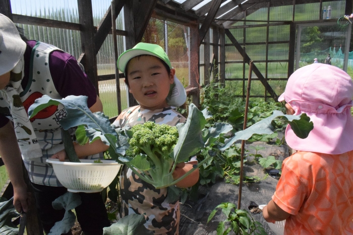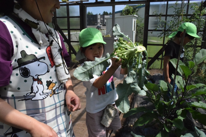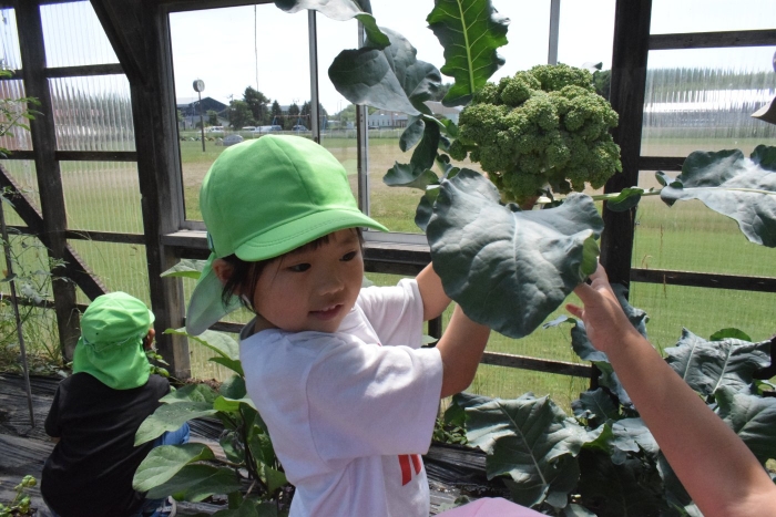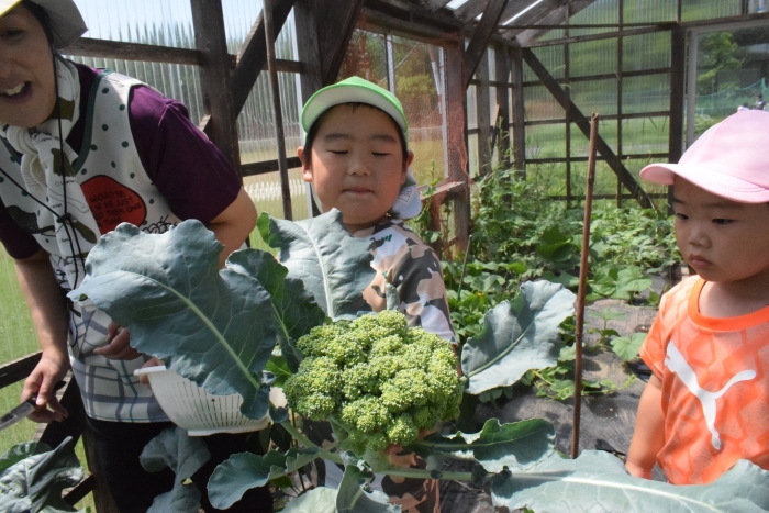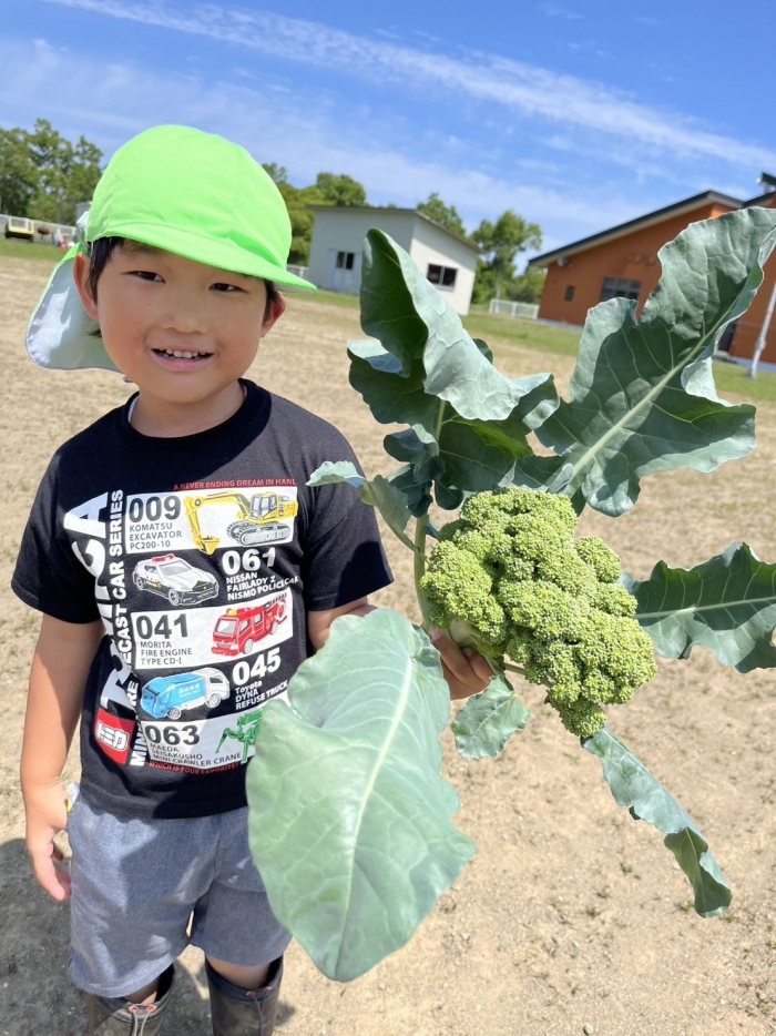 そして今日はハウスで大きなブロッコリーを2房収穫しました。お店で売っているものよりだいぶ大きなもので先生たちもびっくりしました。収穫はうれしそうでしたが,実はブロッコリーはそんなに好きじゃないんだよな~というお友達も多かったです笑 自分たちで収穫したブロッコリーだと食べられるかな?今度みんなで食べてみたいと思います。今日はレタス,きゅうり,しそ,バジルを料理してもらって給食の時にいただきました。