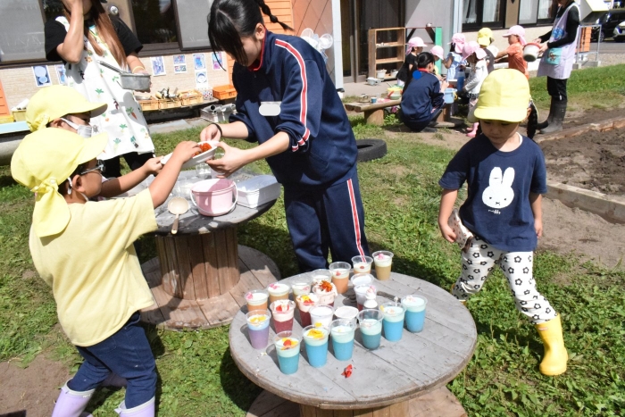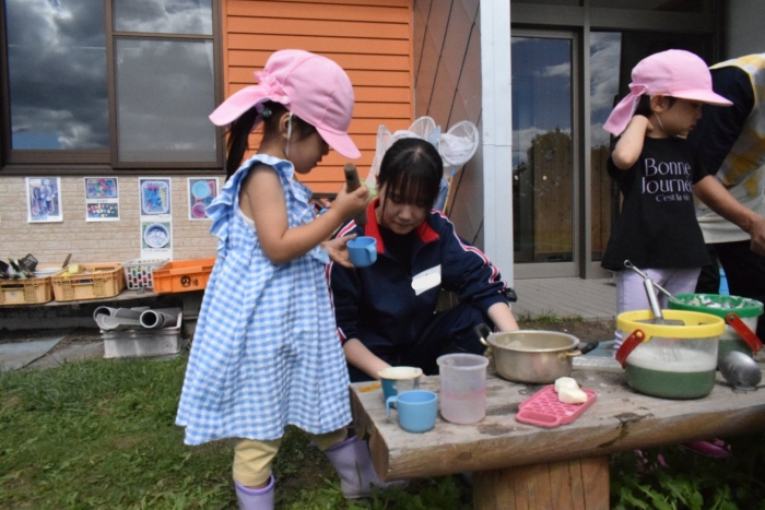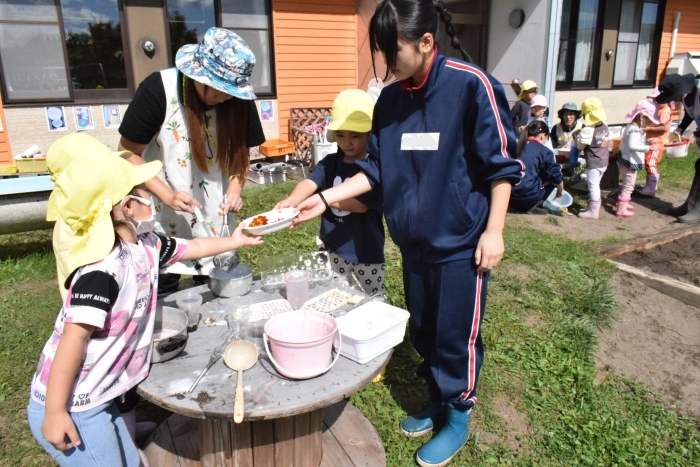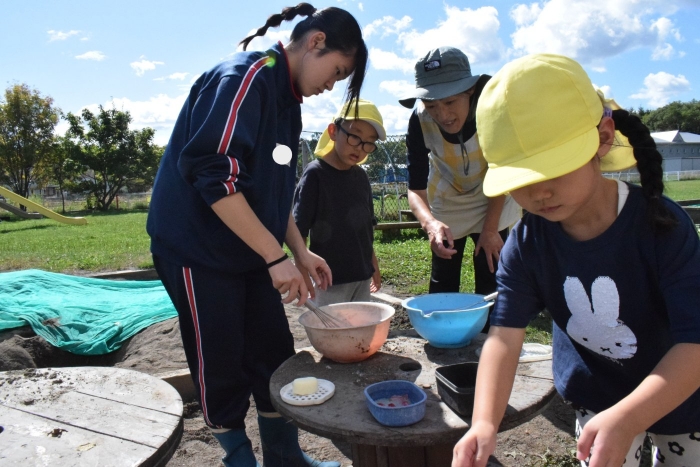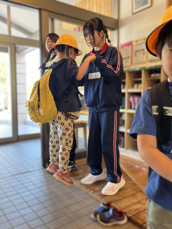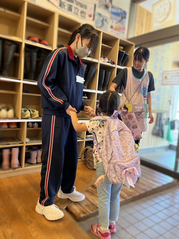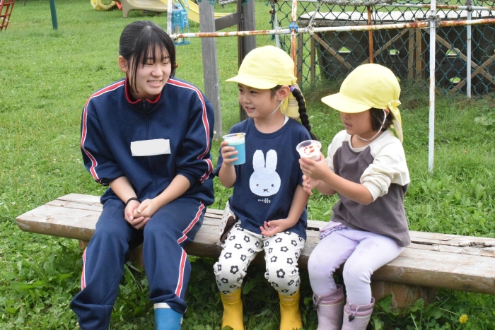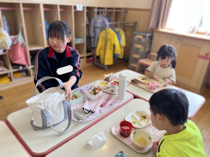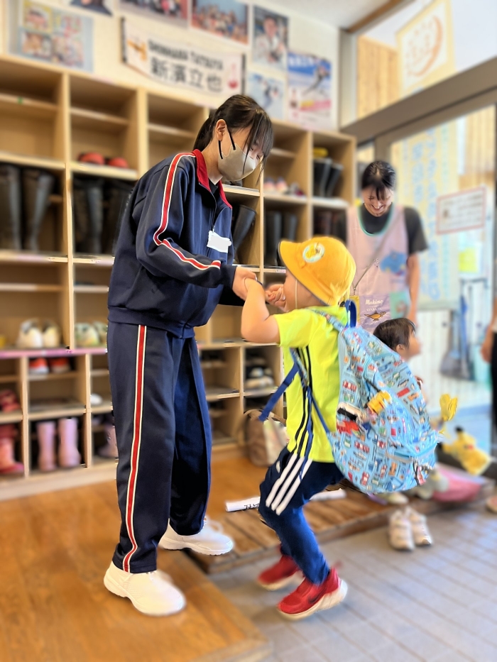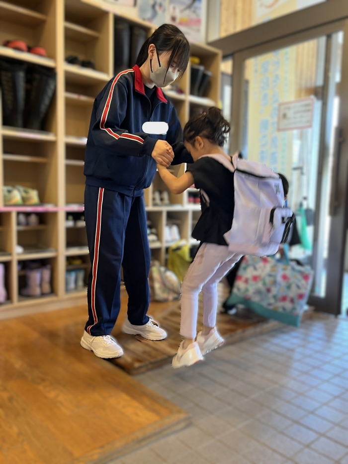 今日は新しく1名のお姉さん先生が職業体験に加わりました。園児たちも中学生先生との触れ合いを今日も楽しみにしていました。今日,さくら組は小学校に交流に出かけるため,うめ組ともも組での戸外遊びに,お姉さん先生2名も一緒に関わってもらいました。戸外遊びでは昨日から始まった石鹸での泡づくりの遊びがちょっと進化していったようです。
