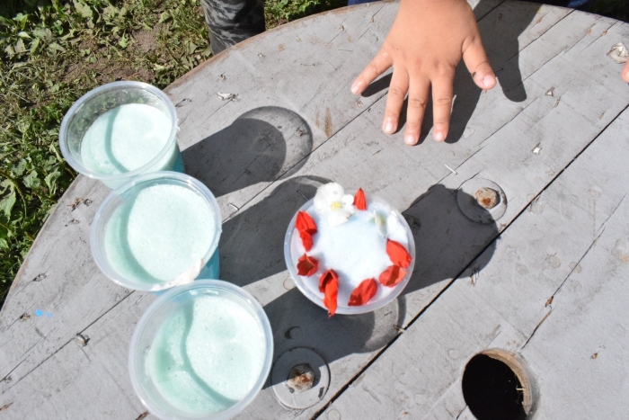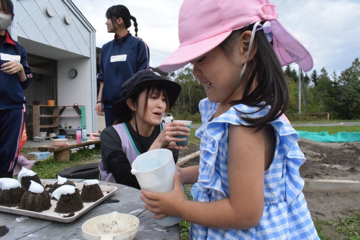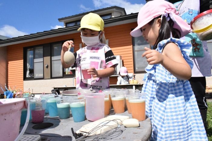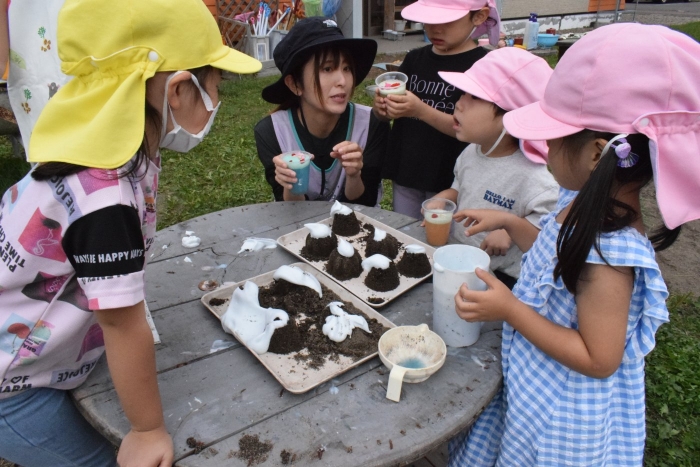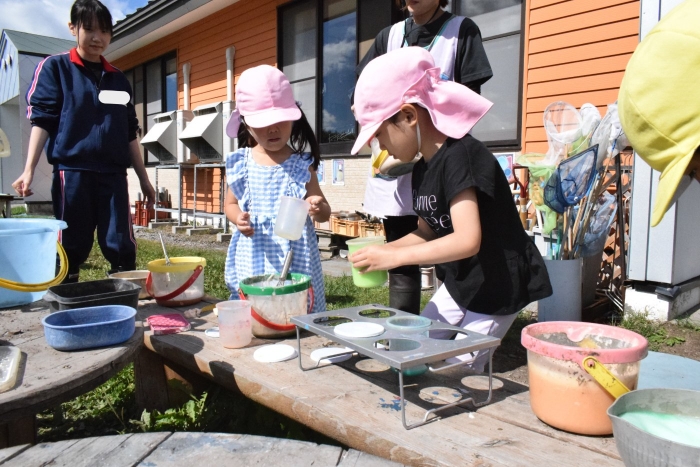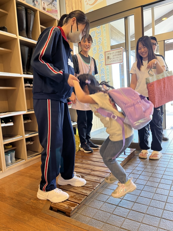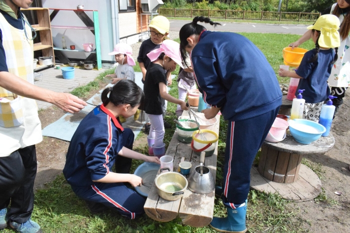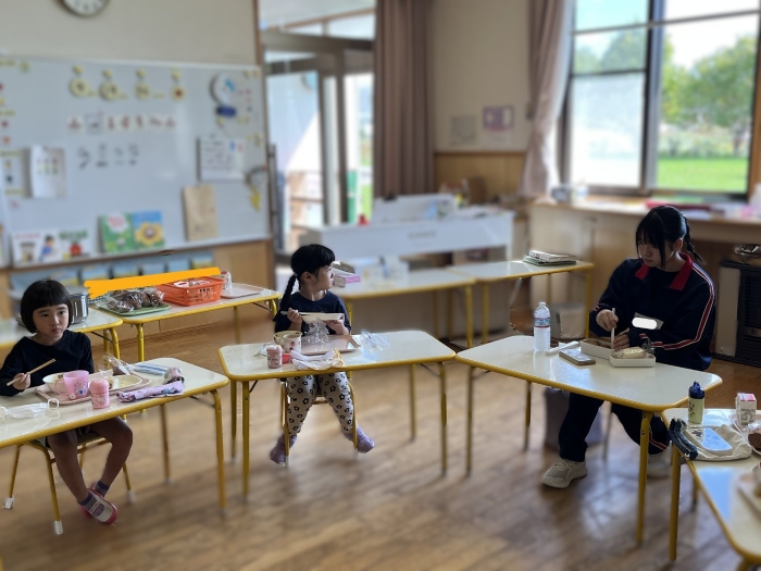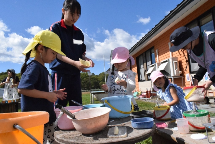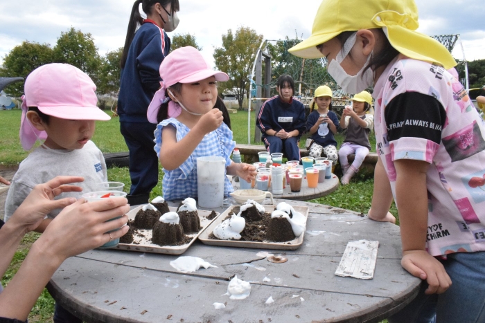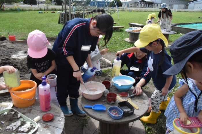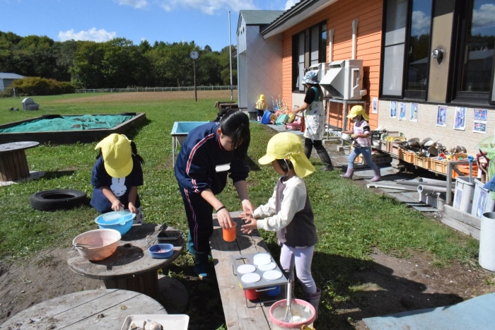 今日は新しく1名のお姉さん先生が職業体験に加わりました。園児たちも中学生先生との触れ合いを今日も楽しみにしていました。今日,さくら組は小学校に交流に出かけるため,うめ組ともも組での戸外遊びに,お姉さん先生2名も一緒に関わってもらいました。戸外遊びでは昨日から始まった石鹸での泡づくりの遊びがちょっと進化していったようです。