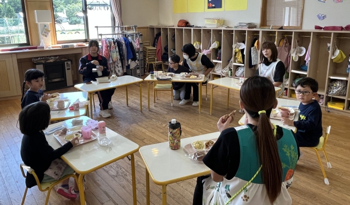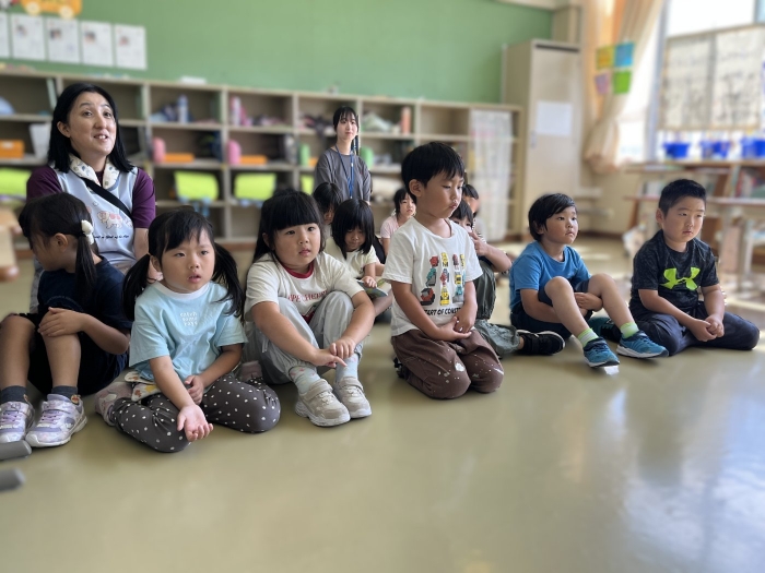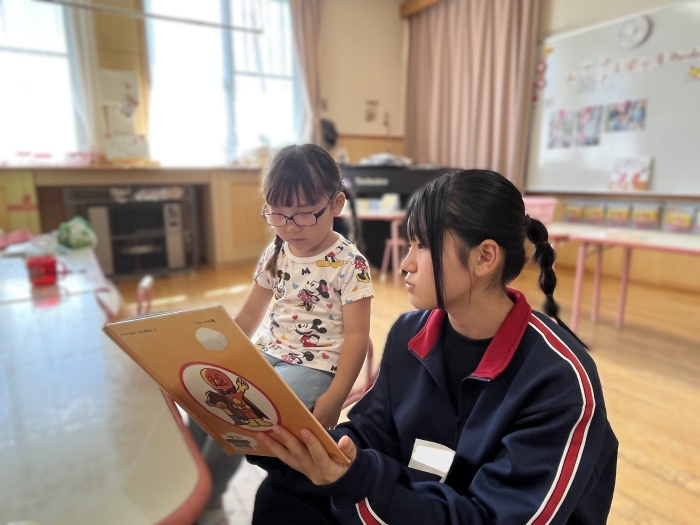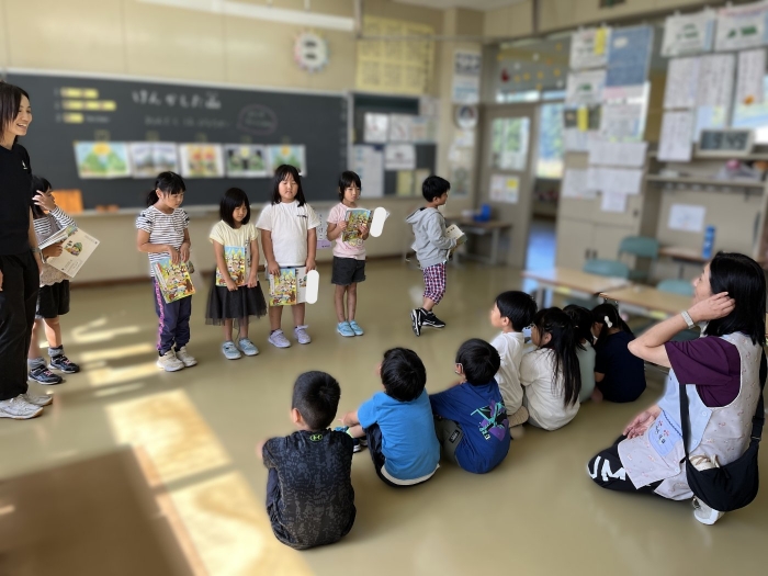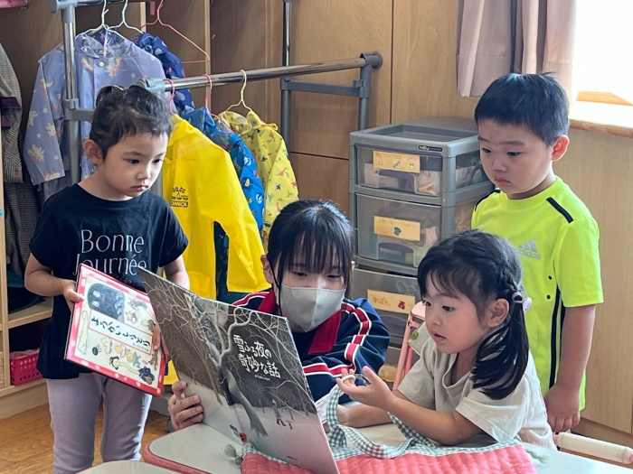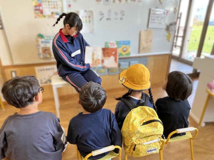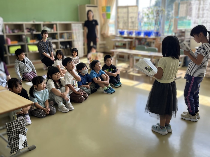 野付小学校1年生のお友達がさくら組さんに国語の音読を発表してくれることになり,招待してくれました。「けんかした山」というお話を,5名の1年生が読み聞かせしてくれました。5名で順番にお話を読み進める様子をさくら組のお友達は真剣に見ていました。1年生が上手に読みあげる様子を純粋に「すごいね」「じょうずだね」と感心しながら見ていたようです。