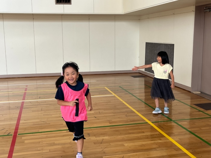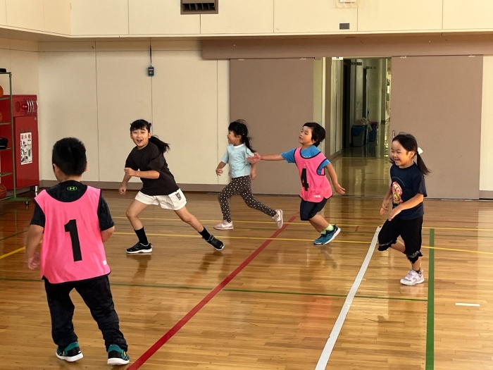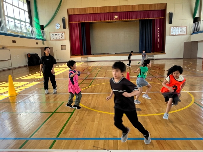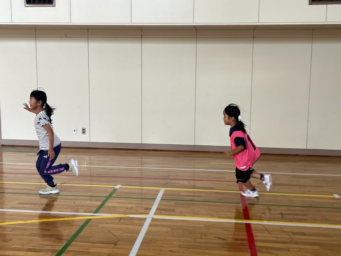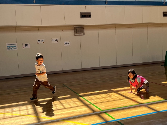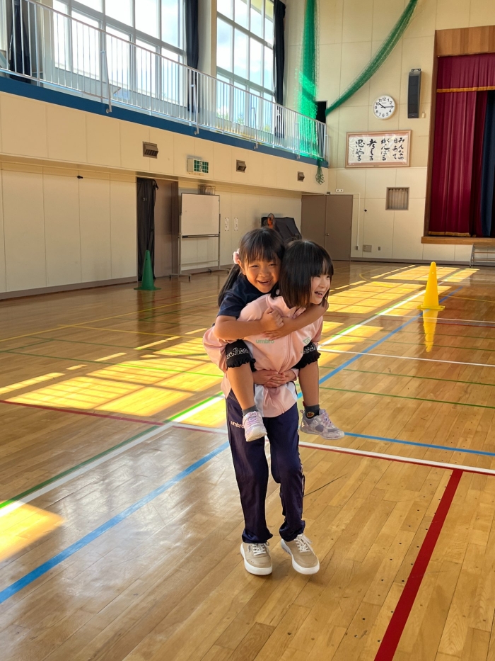音読発表会のあとは,中休み交流。1年生が体育館に案内してくれて,「氷鬼」をして交流しました。ビブスを着ているのが鬼です。その後は3年生も合流し,「かたき」を一緒に行うことになりました。