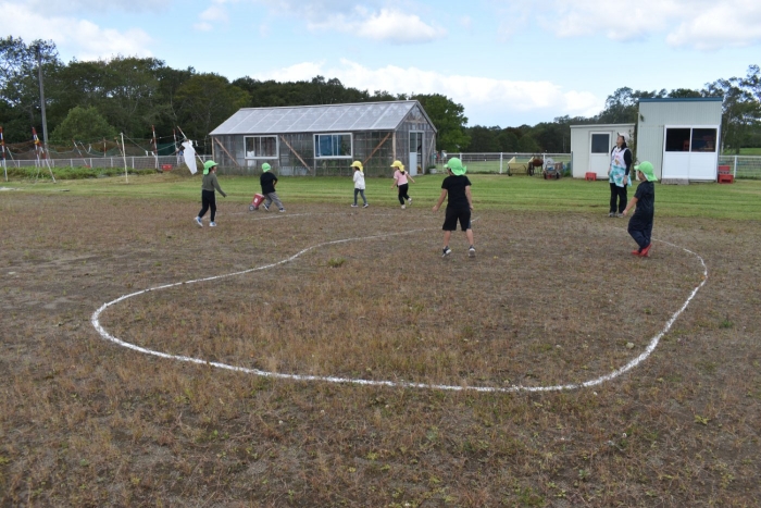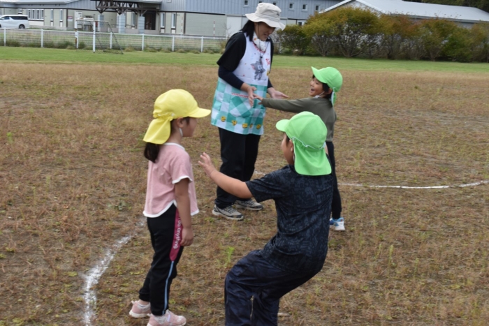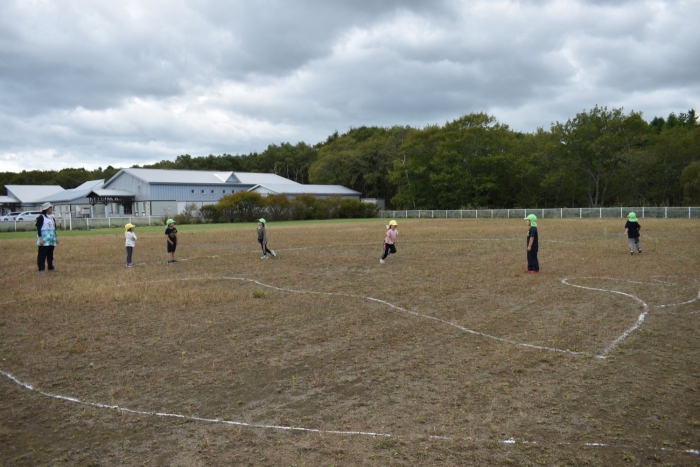 先日,小学校1年生との中休み交流の時に,小学生と一緒に氷鬼をして遊んできたさくら組さん。今日は氷鬼をまた早速やってみようということになり,グランドで遊びが始まりました。