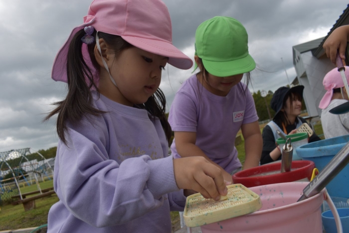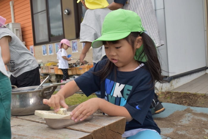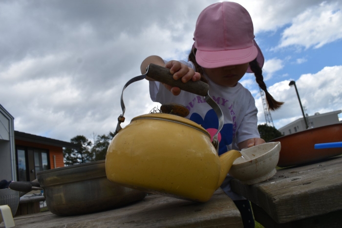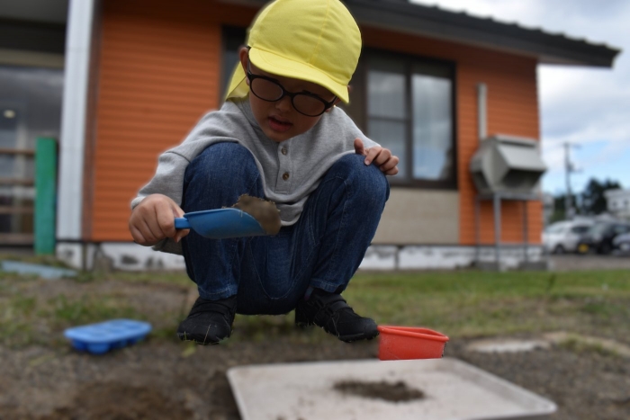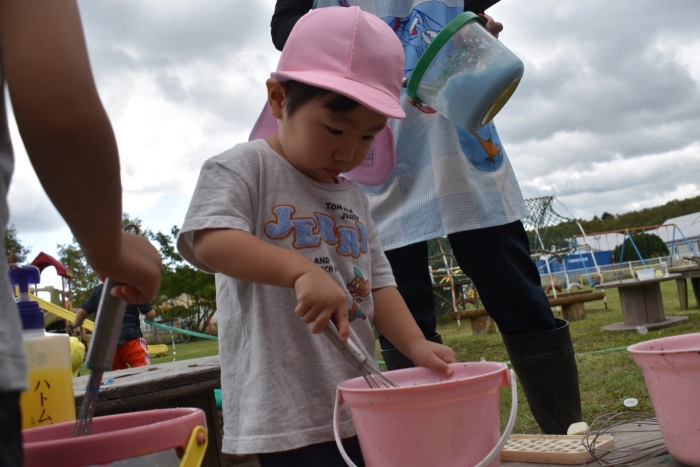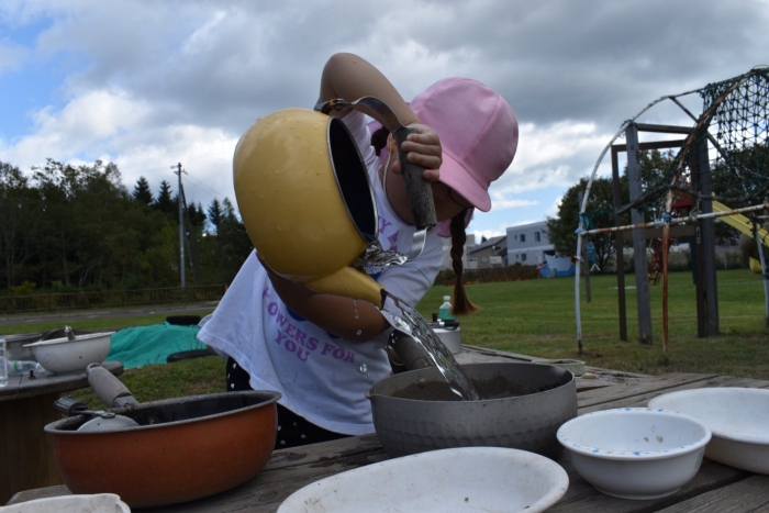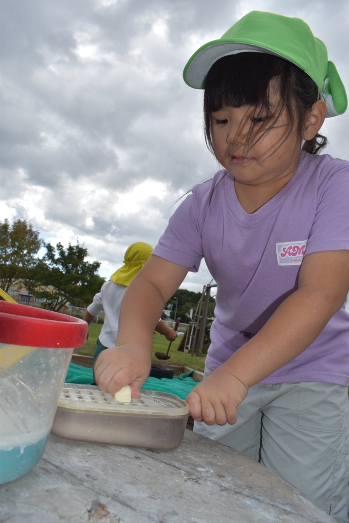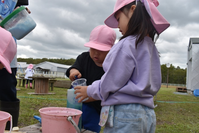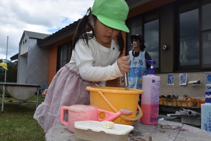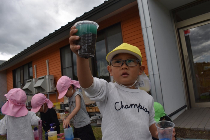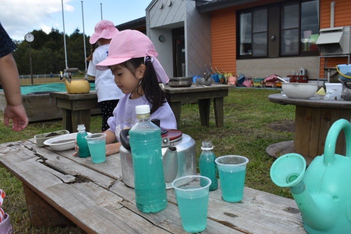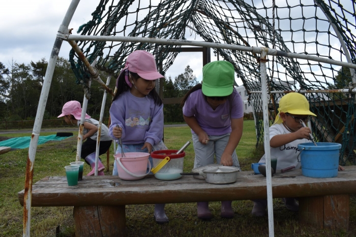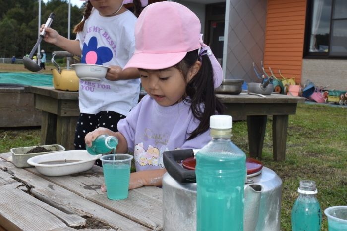 園庭での色水づくり,泡づくり、お料理づくりの様子は・・・