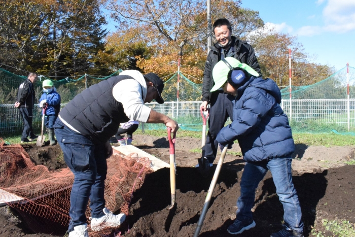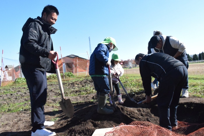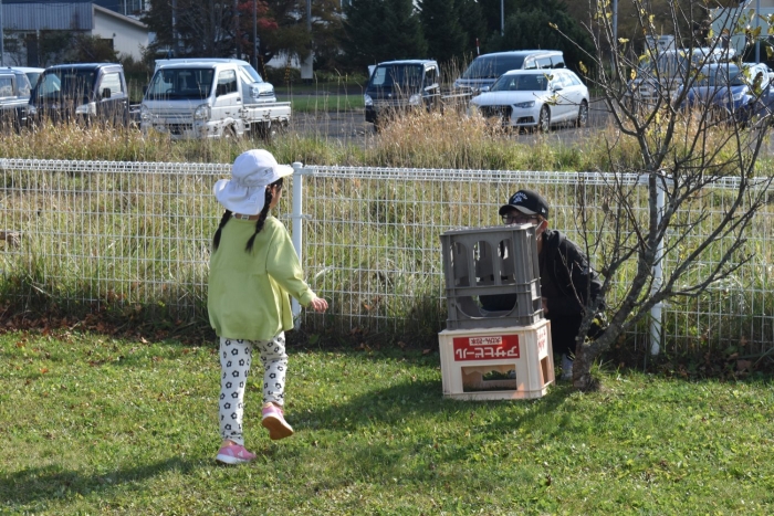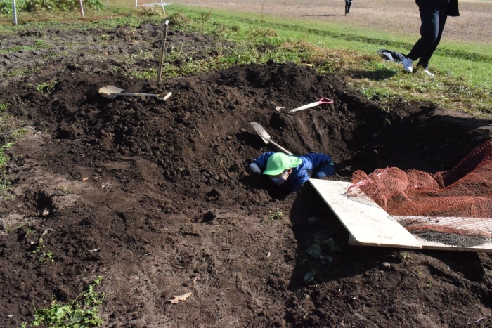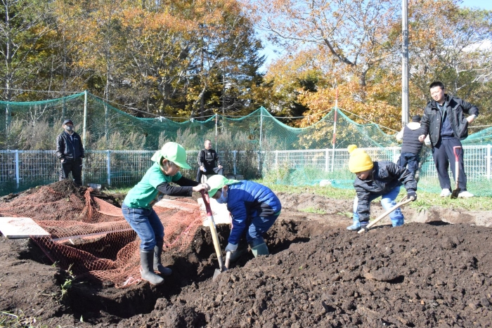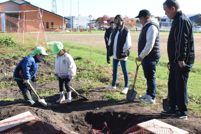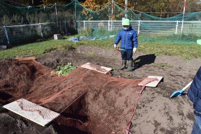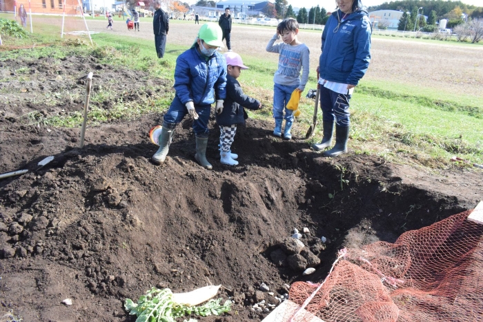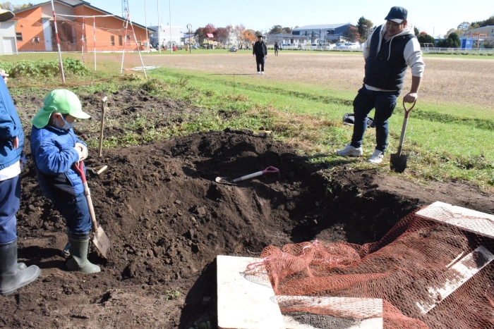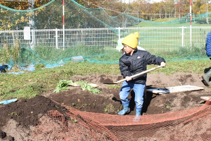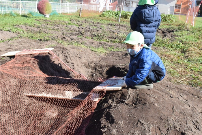 昨日,完成した鹿の罠。鹿は夜の間にやってくるため,夕べ,パトロール?をしたお友達がいました。そのお友達によると,幼稚園の近くには8頭ほどの鹿の群れがいたとのこと。畑の方は大丈夫かな・・・?畑の大根に被害はありませんでしたが,鹿の罠の板がずれて,周囲には鹿の糞と足跡が・・・。罠にはかかってはいませんでしたが,罠の周りを鹿が警戒しながら通ったようです。もし,8頭の鹿がやってきたのであれば,この罠の大きさでは足りない・・・ということになり,今日はさらに穴を大きく掘って修正することになったようです。