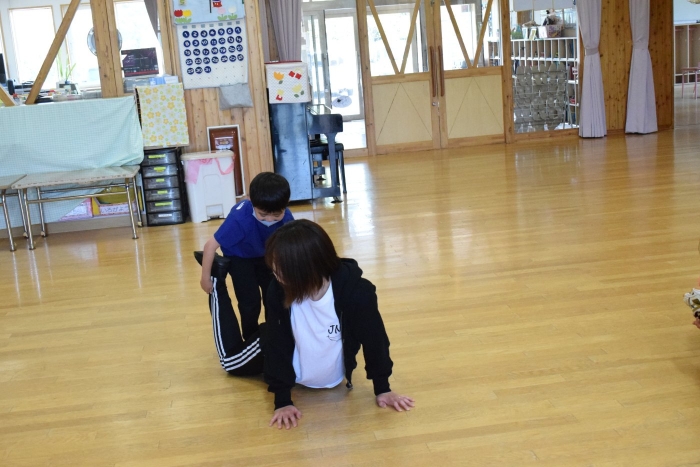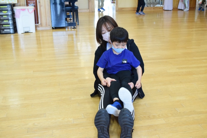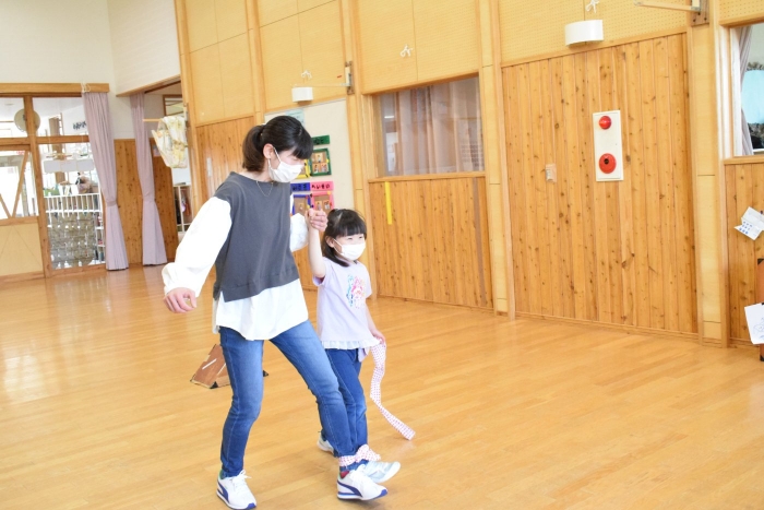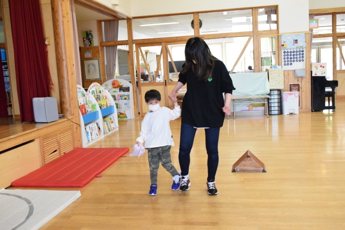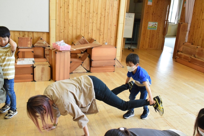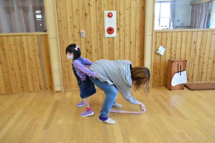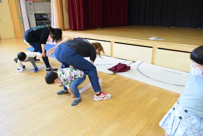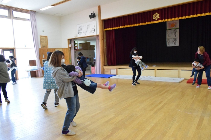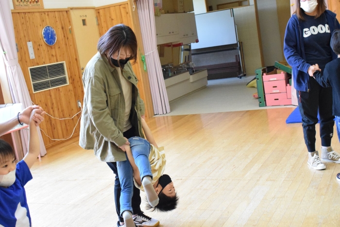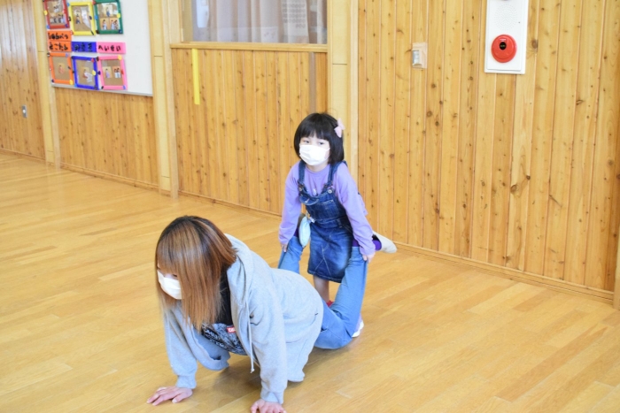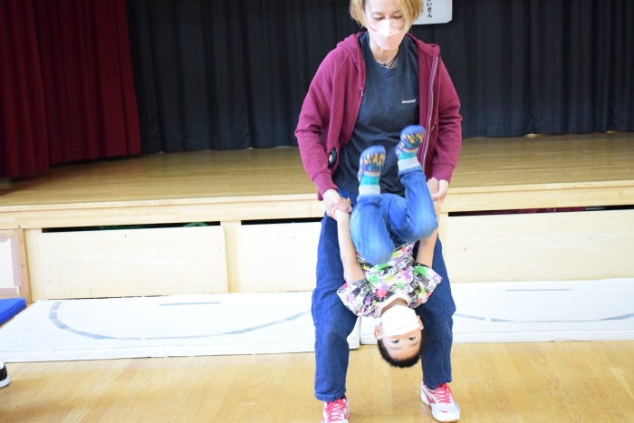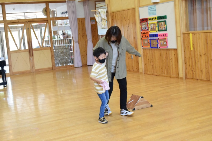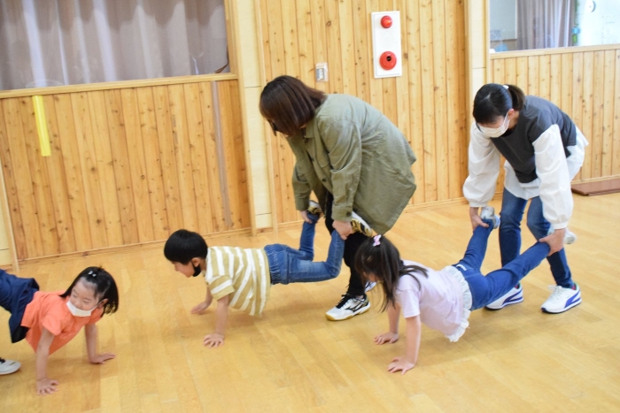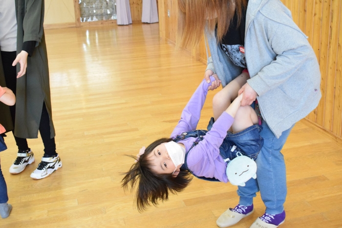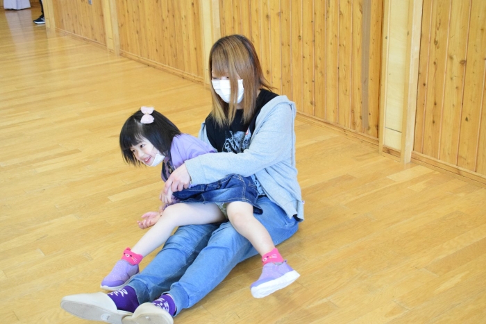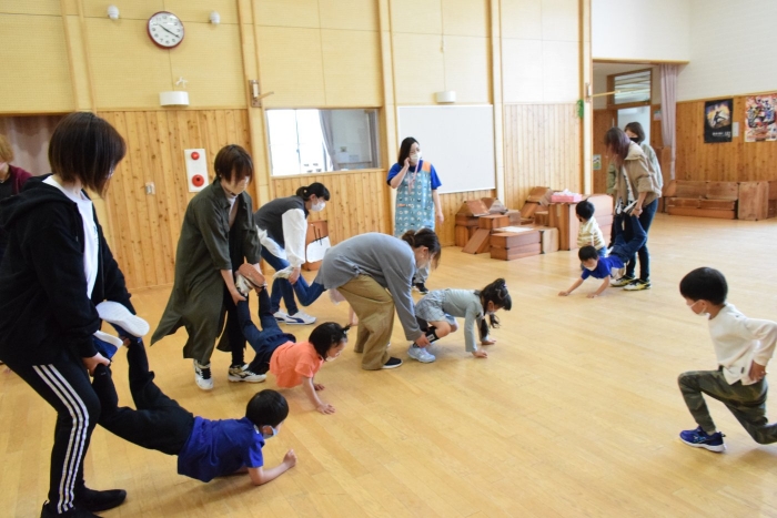 親子活動では「バスに乗って♬」「タオル取りゲーム」「手押し車」「二人三脚」「ペンギン歩き」「でんぐり返し」などハードな運動もあったりして、お母さんたちはハアハア言っていたようですがお子さんと十分にスキンシップをとったりして体を動かす楽しさも感じていただけたのではないでしょうか。