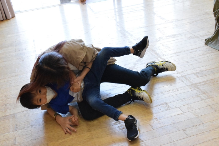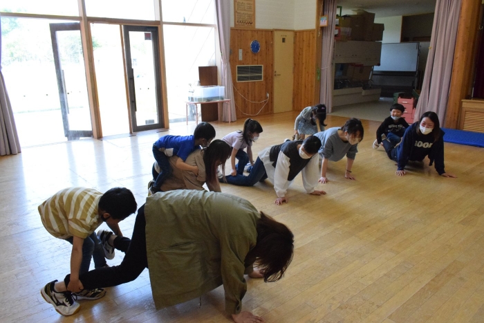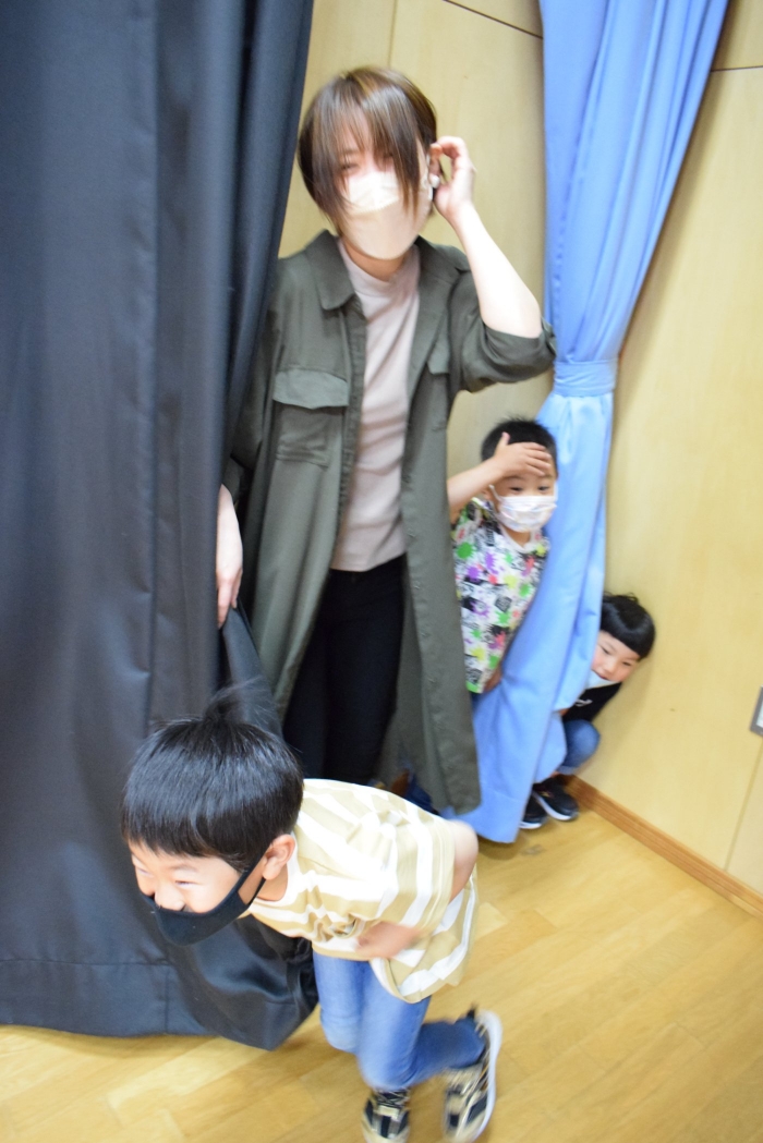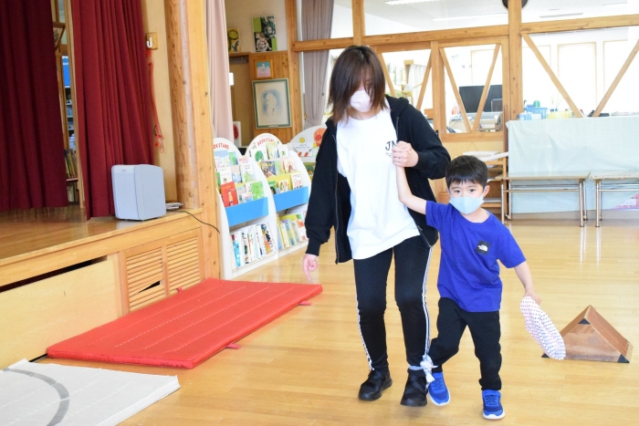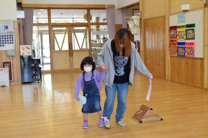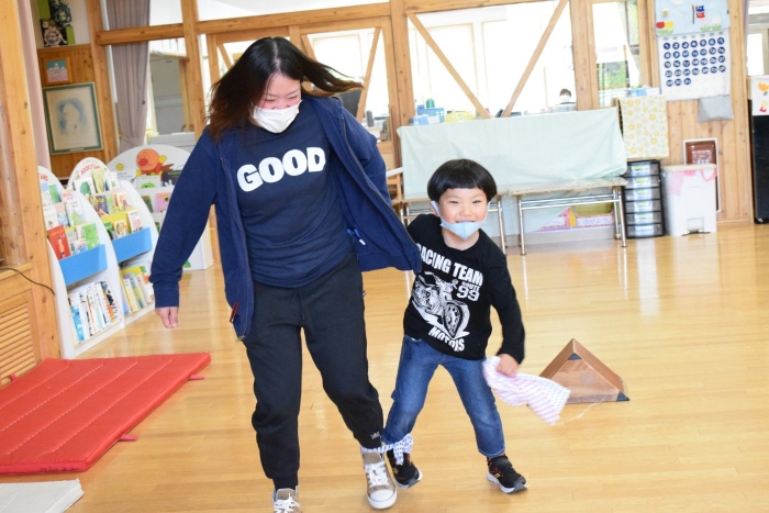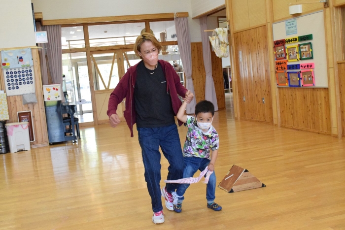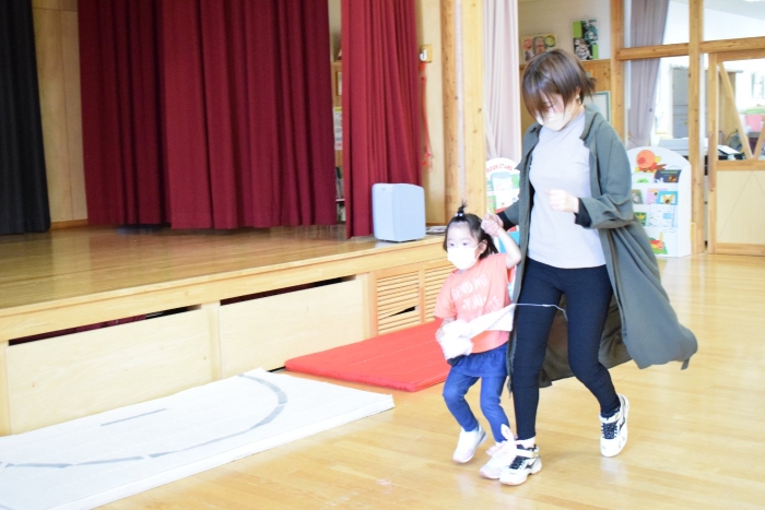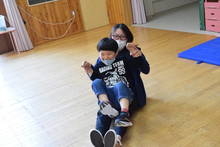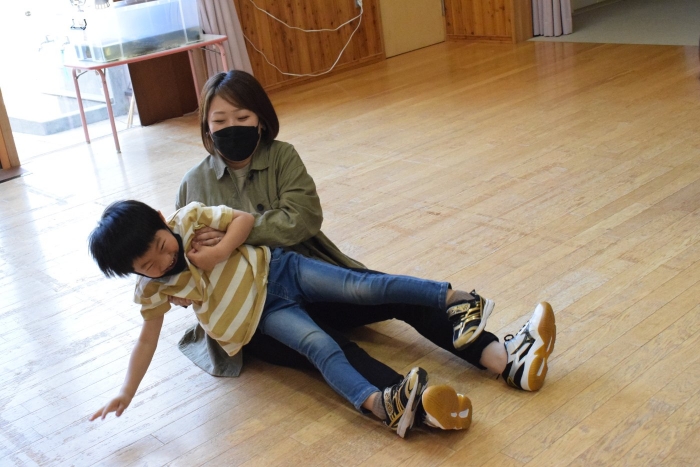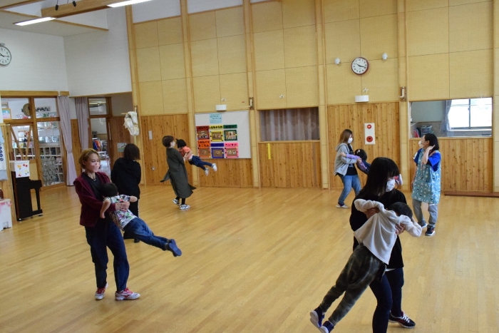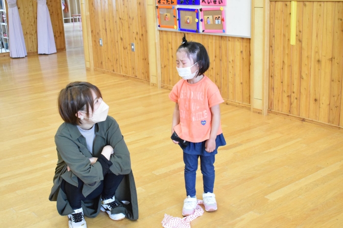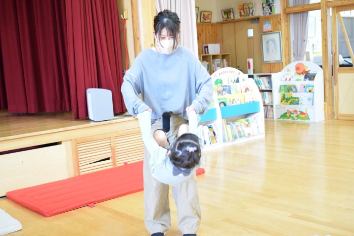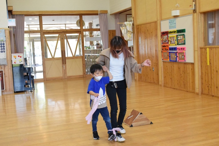 親子活動では「バスに乗って♬」「タオル取りゲーム」「手押し車」「二人三脚」「ペンギン歩き」「でんぐり返し」などハードな運動もあったりして、お母さんたちはハアハア言っていたようですがお子さんと十分にスキンシップをとったりして体を動かす楽しさも感じていただけたのではないでしょうか。