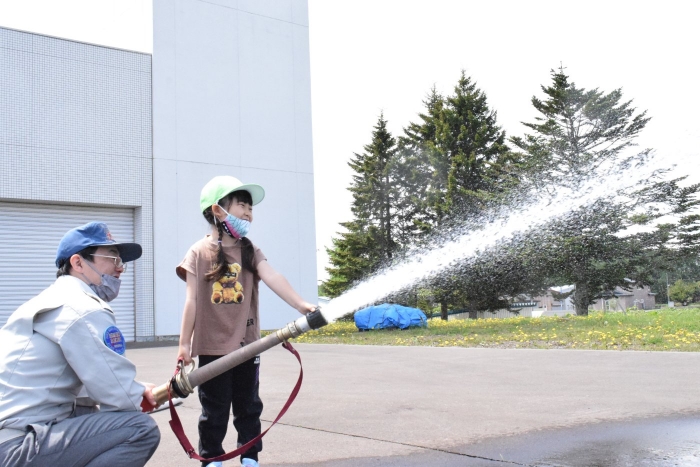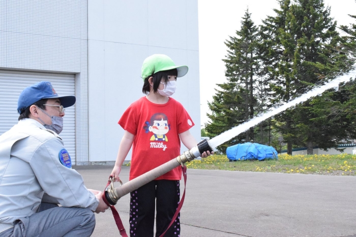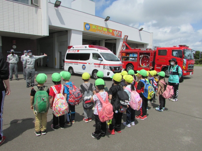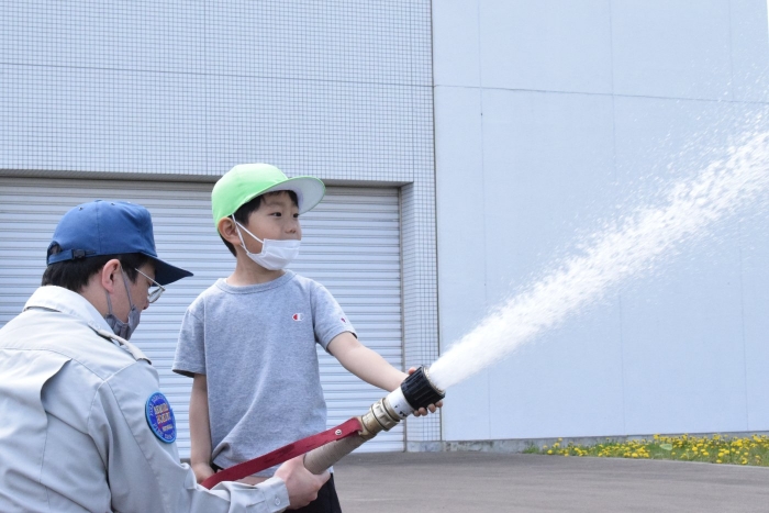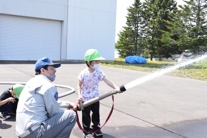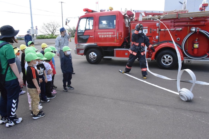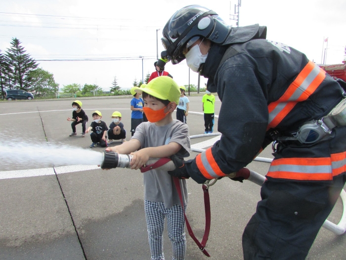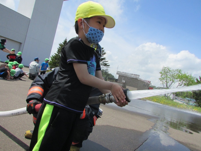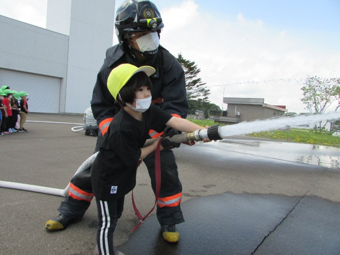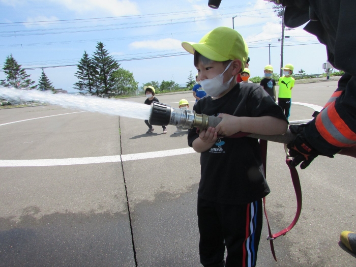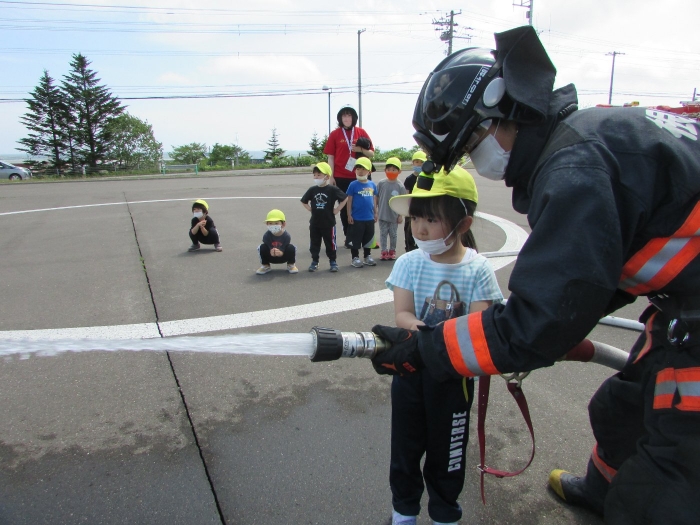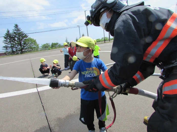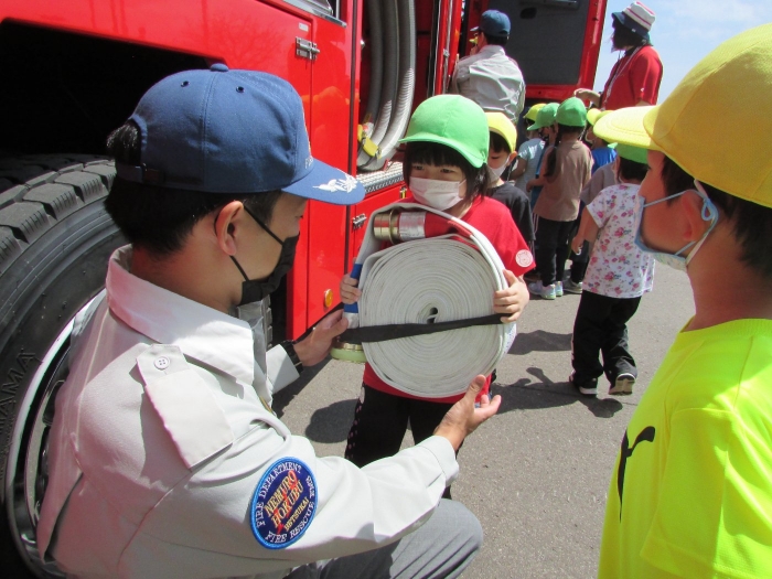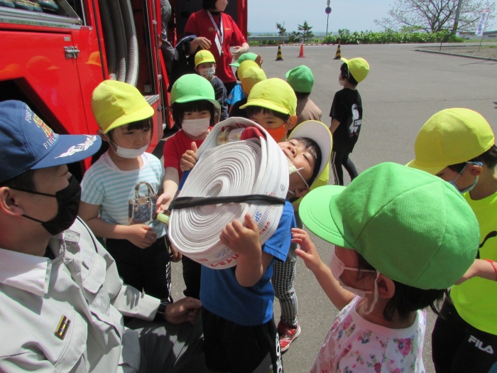 春も終わりごろではありますが、ももさんとさくらさんは徒歩遠足に出かけました。お天気にも恵まれ、消防署見学をしてからみなと公園へのルートでは、地域の方々に声を掛けていただいて親しみをもってお話しする姿がありました。消防署では署内を見させていただいたり、放水体験もさせていただく事ができました。