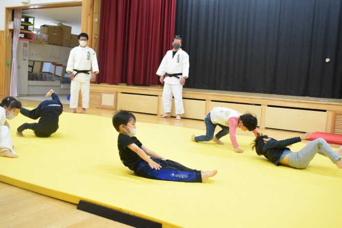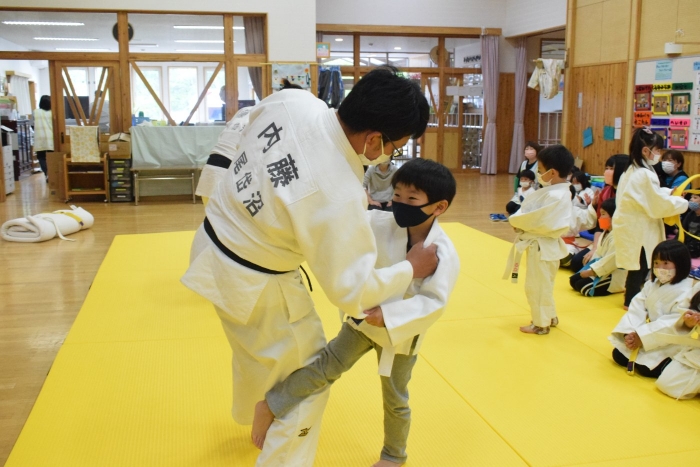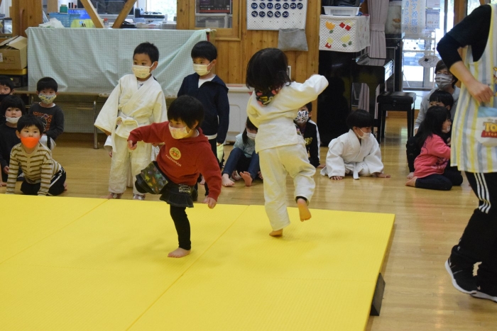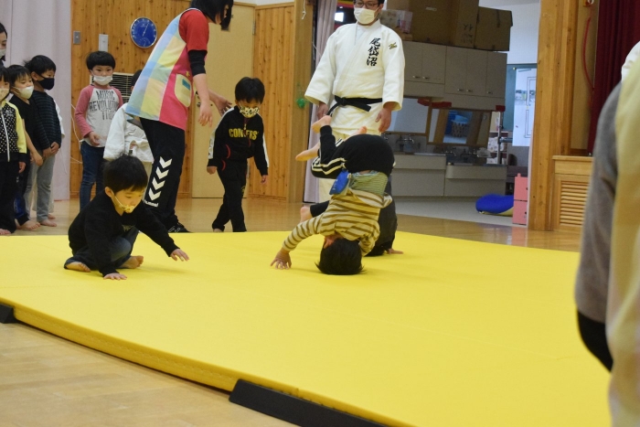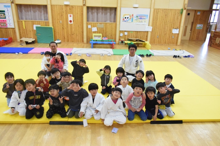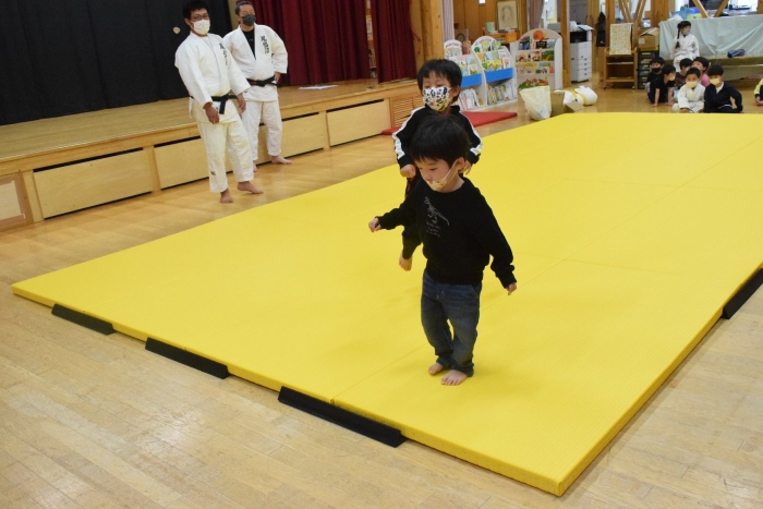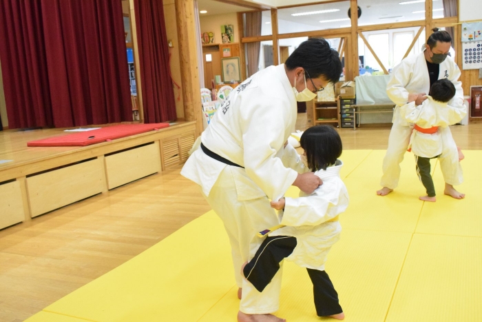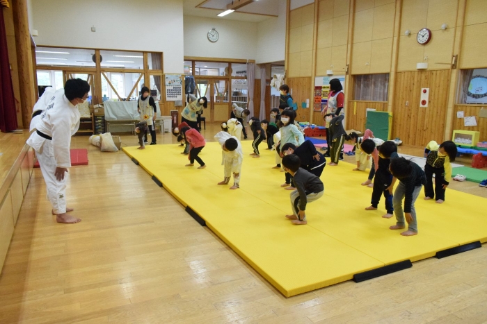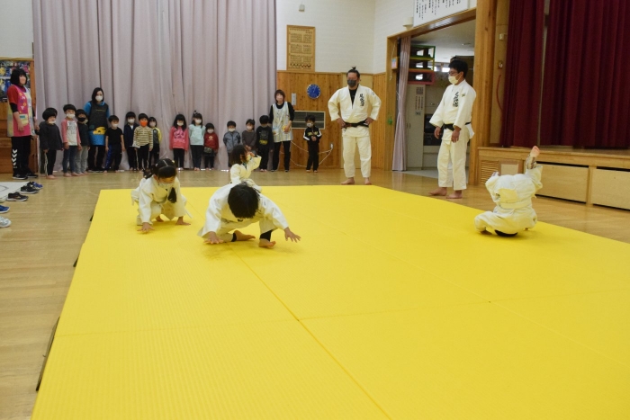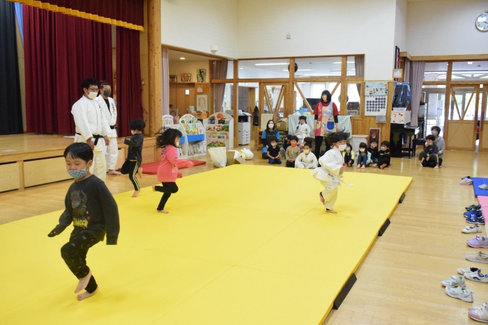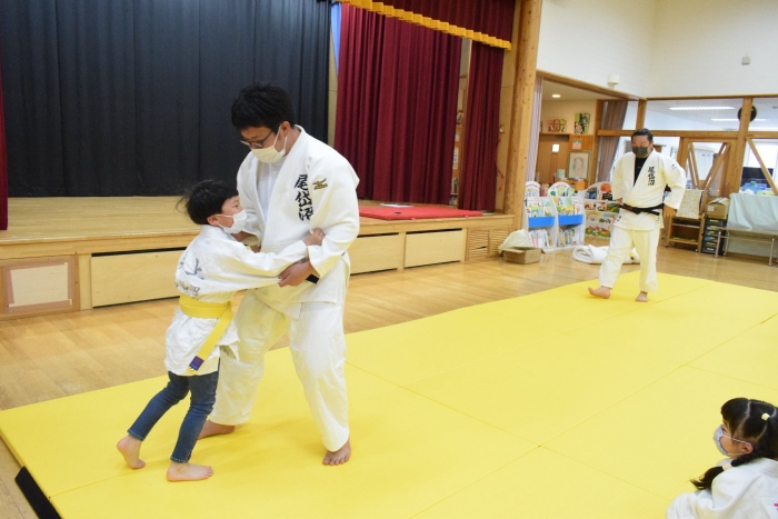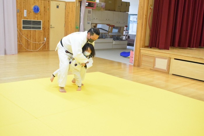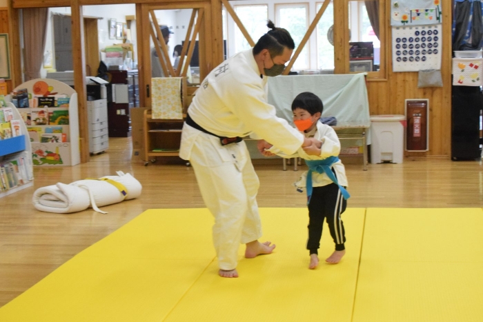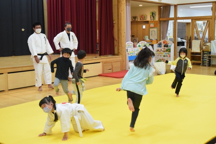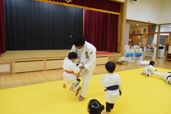 子どもたちに柔道の楽しさを感じてもらおうと尾岱沼柔道スポーツ少年団より2名の指導者の方が来てくださり、熱血指導をしていただきました! 園児もすでに4名の子が少年団に入っており、柔道着姿も凛々しく、みんなのお手本として頑張ってくれましたよ。「できなくても最後まであきらめない気持ちが大事!」「本当に強い人は弱い人をやっつけない」など人として大事なことも教わりました。 体は小さくても技を覚えたら大きな人でも投げ飛ばせるということがわかり、終わってみたら入団希望者が殺到!(笑)。毎週火曜日、金曜日の19時から東公民館で練習をしてるので見に来てください!とのことでした。関心のある方はぜひどうぞ!