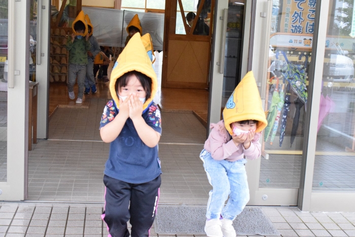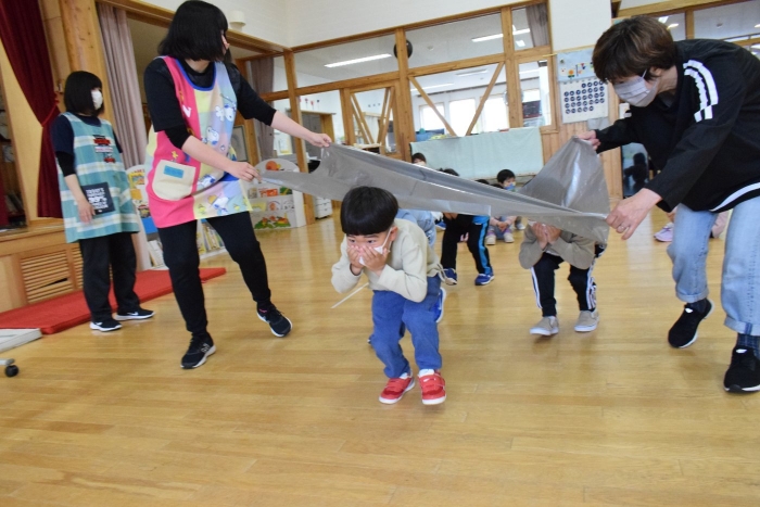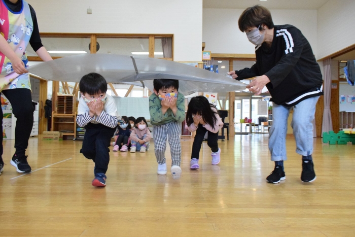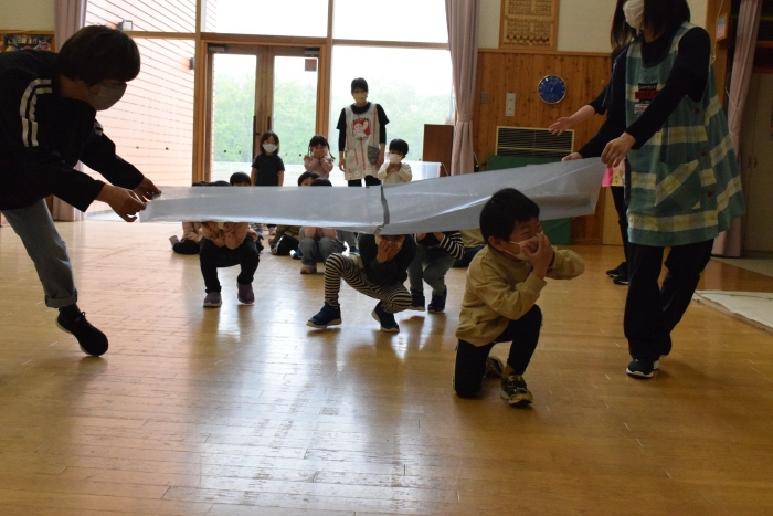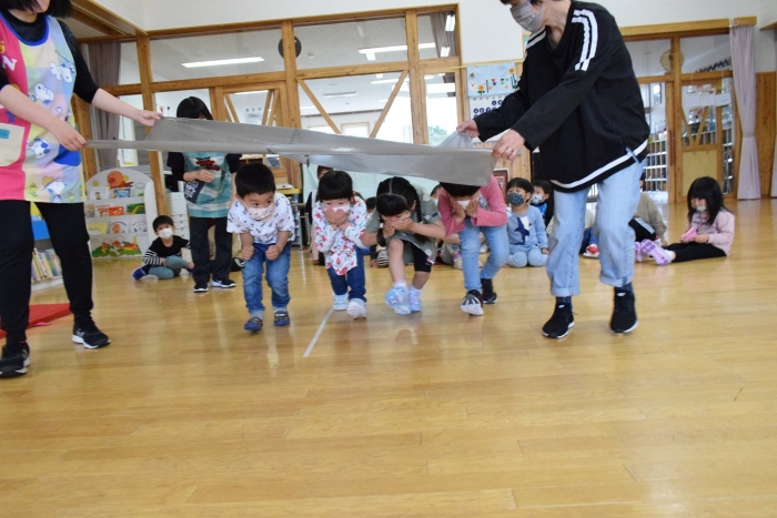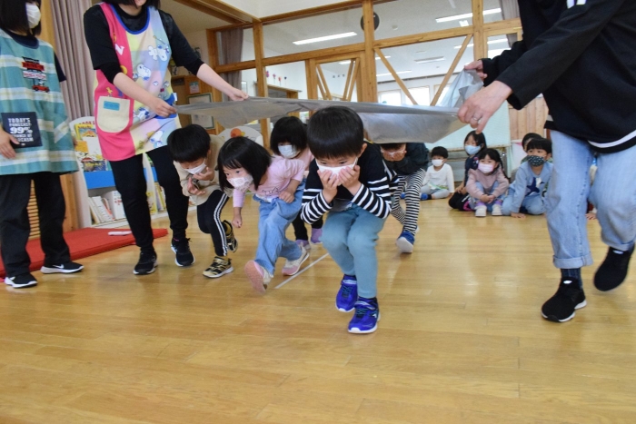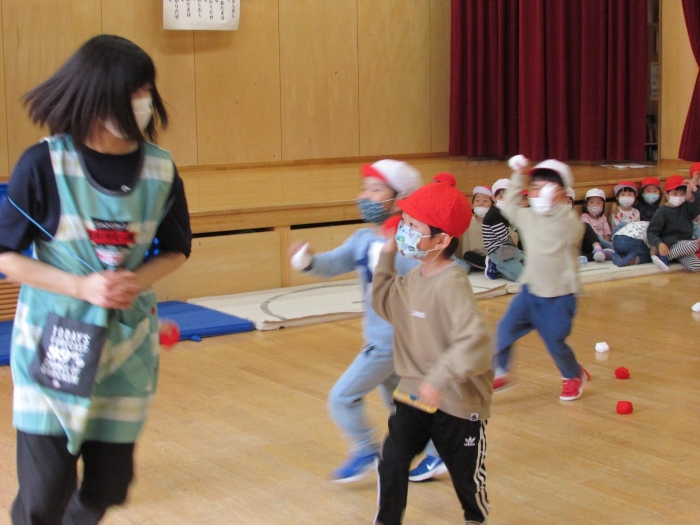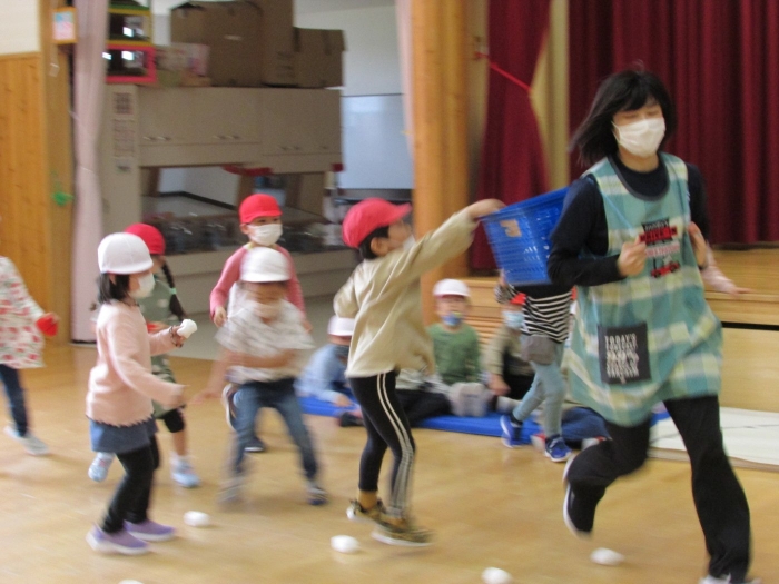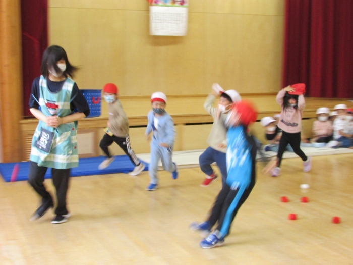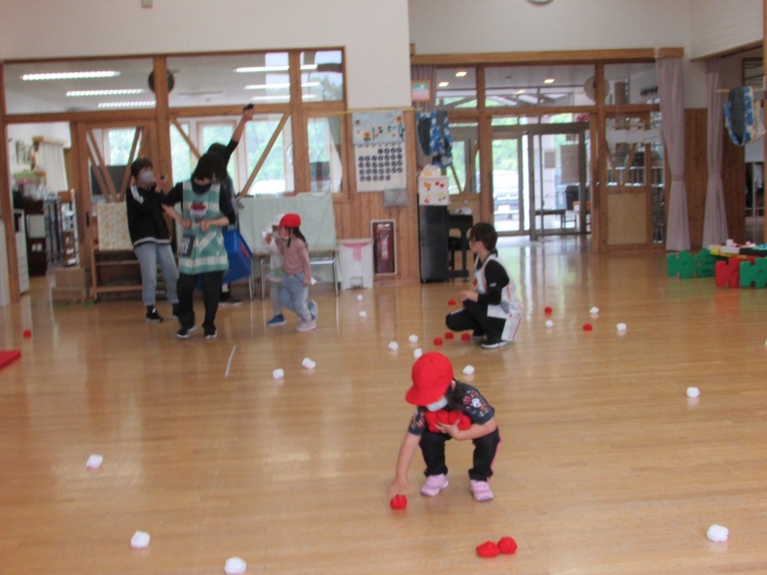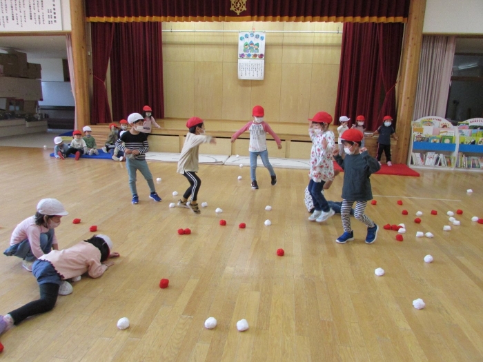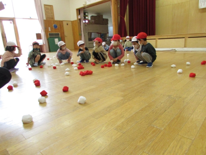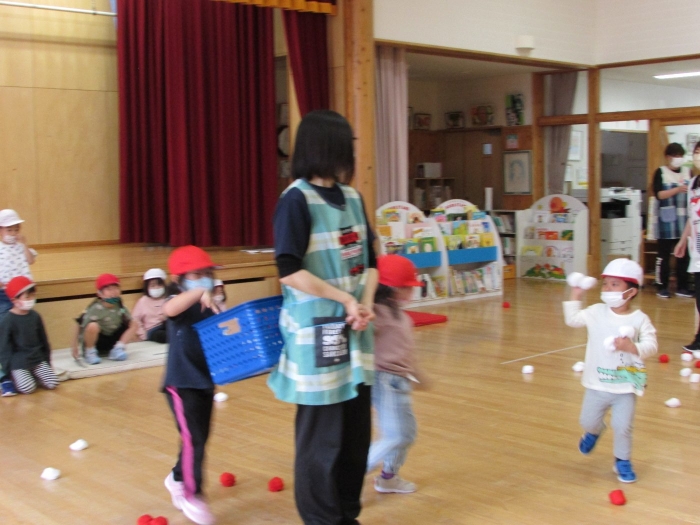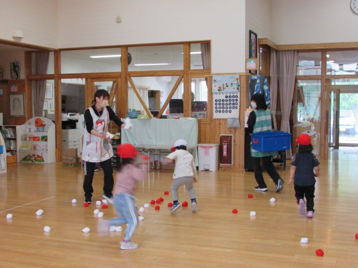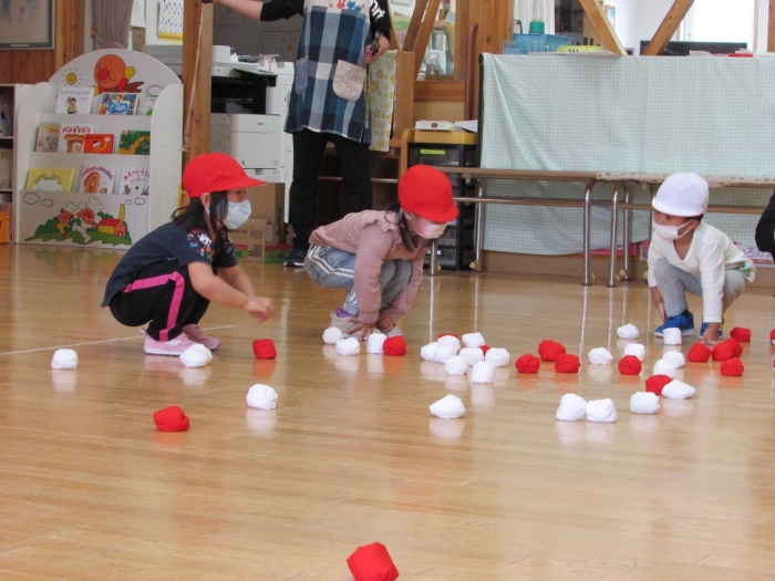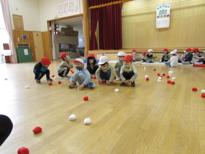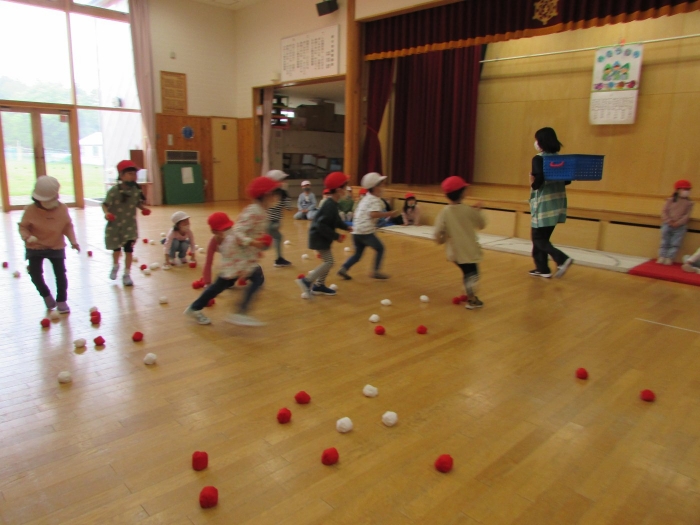 運動会での新種目、『追いかけ玉入れ』をみんなでやってみました。動くカゴを追いかけて赤組は赤玉、白組は白玉を入れます、たくさん入った方の勝ち!まだ紅白分けはしていないので今日は仮の紅白で挑戦。間違えて違う色の玉を入れないように気を付けて!一個ずつ入れる子、いっぺんにたくさん入れる子、そこは性格?作戦?