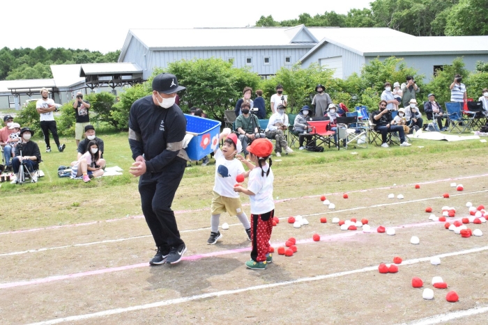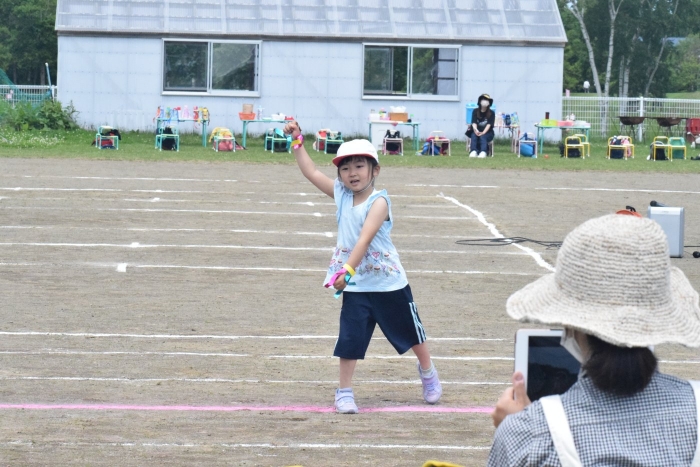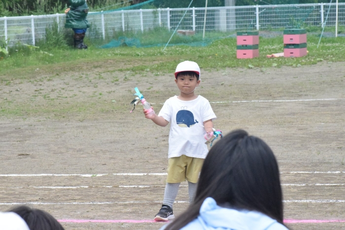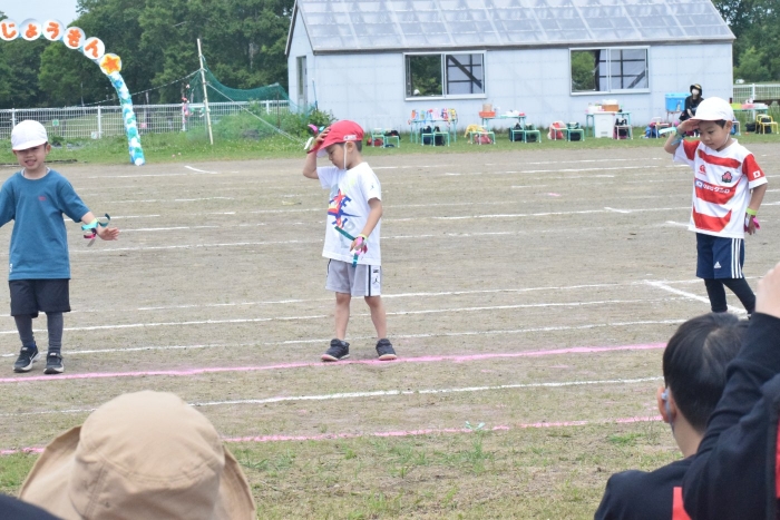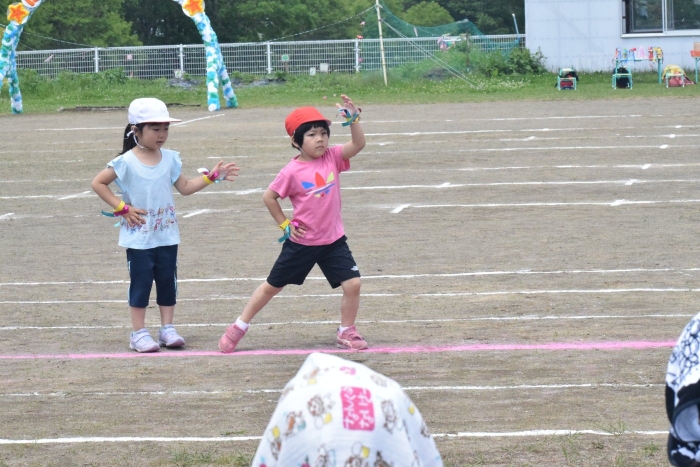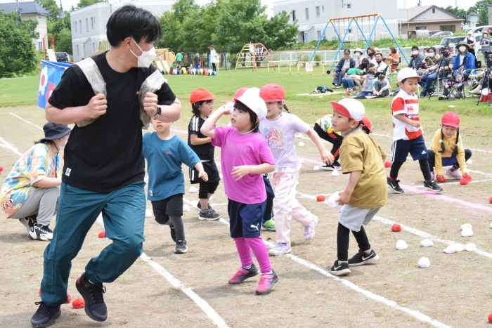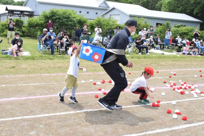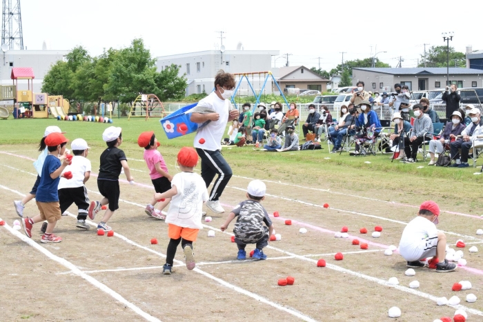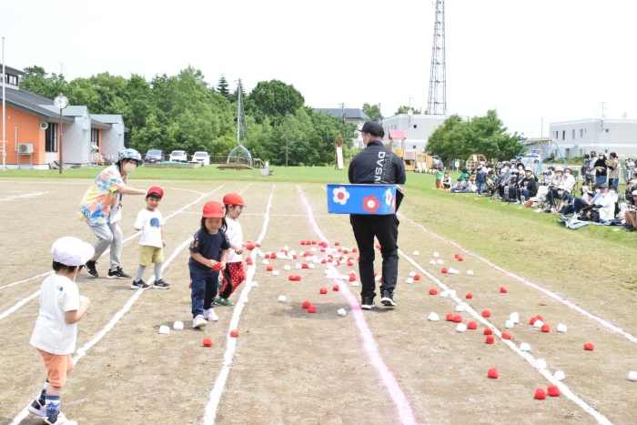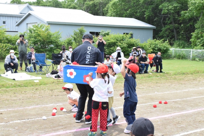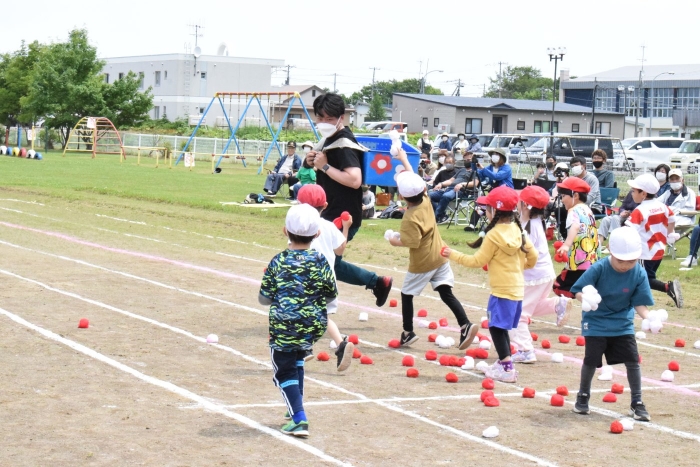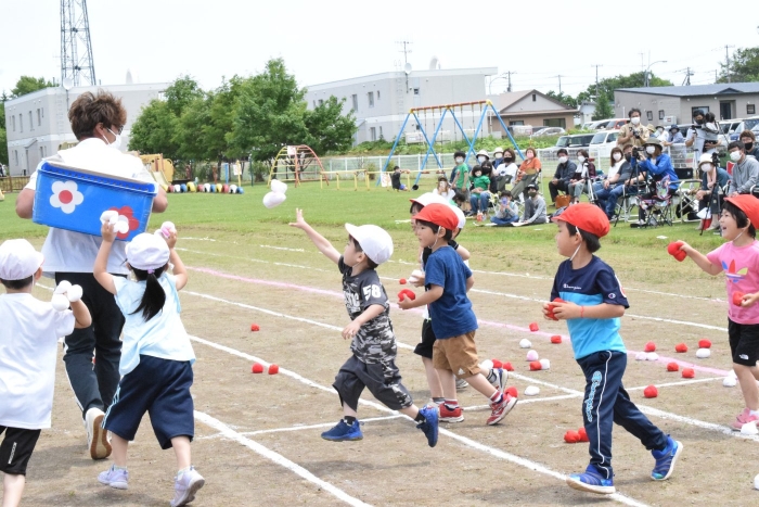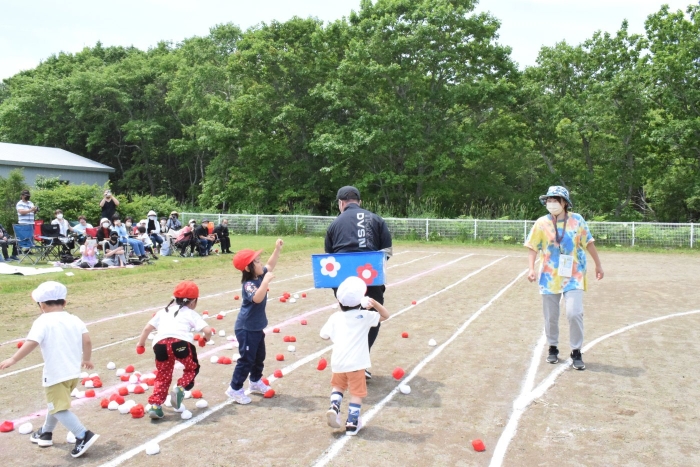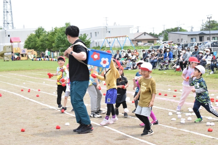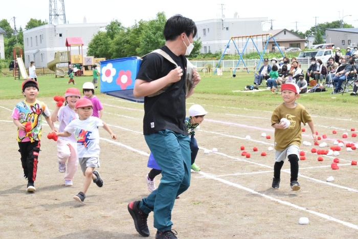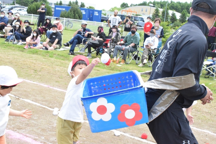 例年の玉入れから、今年はちょっとハードな「追いかけ玉入れ」に挑戦。お父さんたちにお手伝い頂いて楽しい競技になりました。思ったよりもたくさん入っていて、練習の成果が出ていたようです。お手伝い頂いたお父さん方、お疲れさまでした。ありがとうございました。