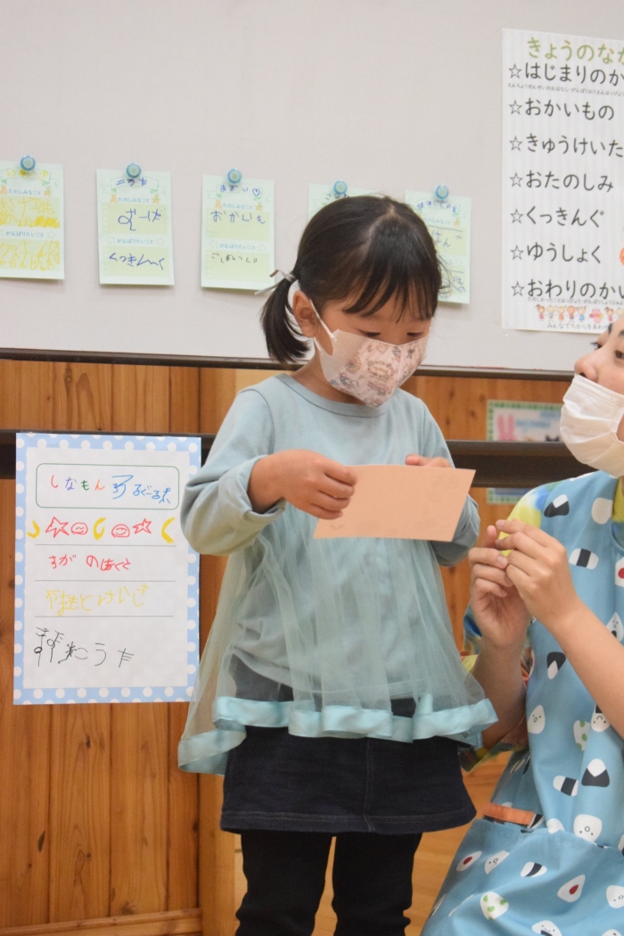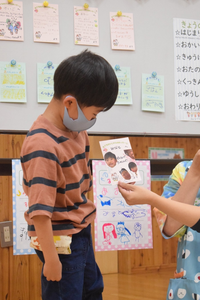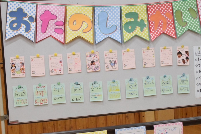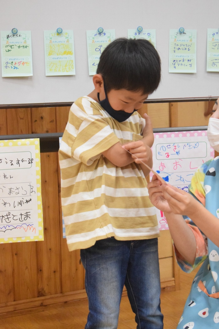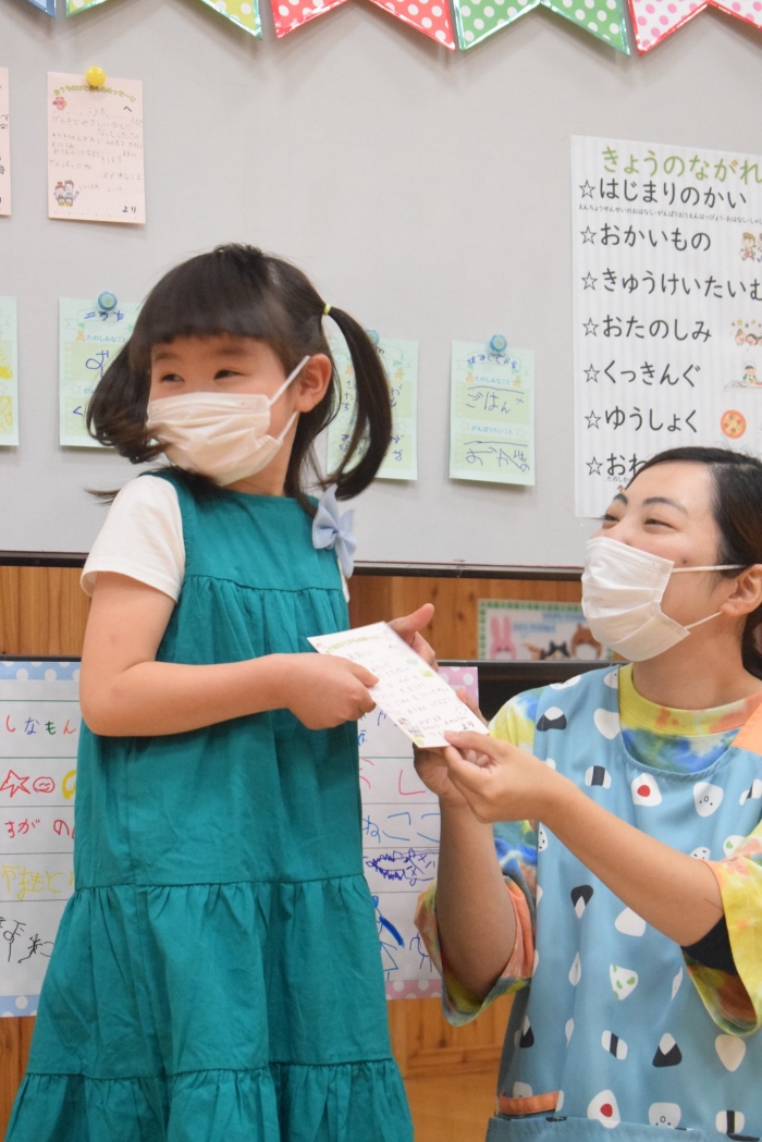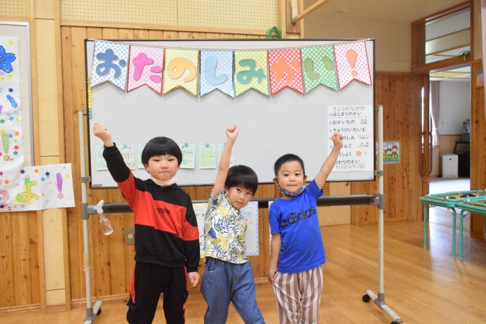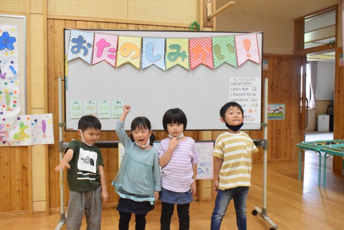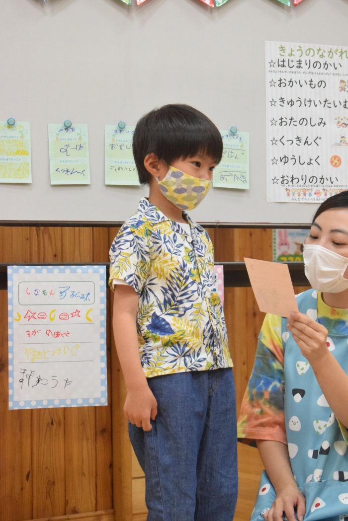 年長さんになったらできる一大行事の一つに『お楽しみ会』があります。年長さんになると随分といろいろなことができるようになります。その力をこの『お楽しみ会』で発揮し、自分自身でも感じ、自覚し、自信と優しく強い心を培ってほしいと願っています。一学期最後を締めくくる行事としてご家族の皆様にもご協力をいただきました。感謝いたします。うめさん、ももさんからもエールをもらいました。この行事のねらいである「家族と離れ、自分の力や友達と力を合わせ物事に取り組む」に向けて今日一日、頑張りましょう!そしてたくさん楽しみましょう!