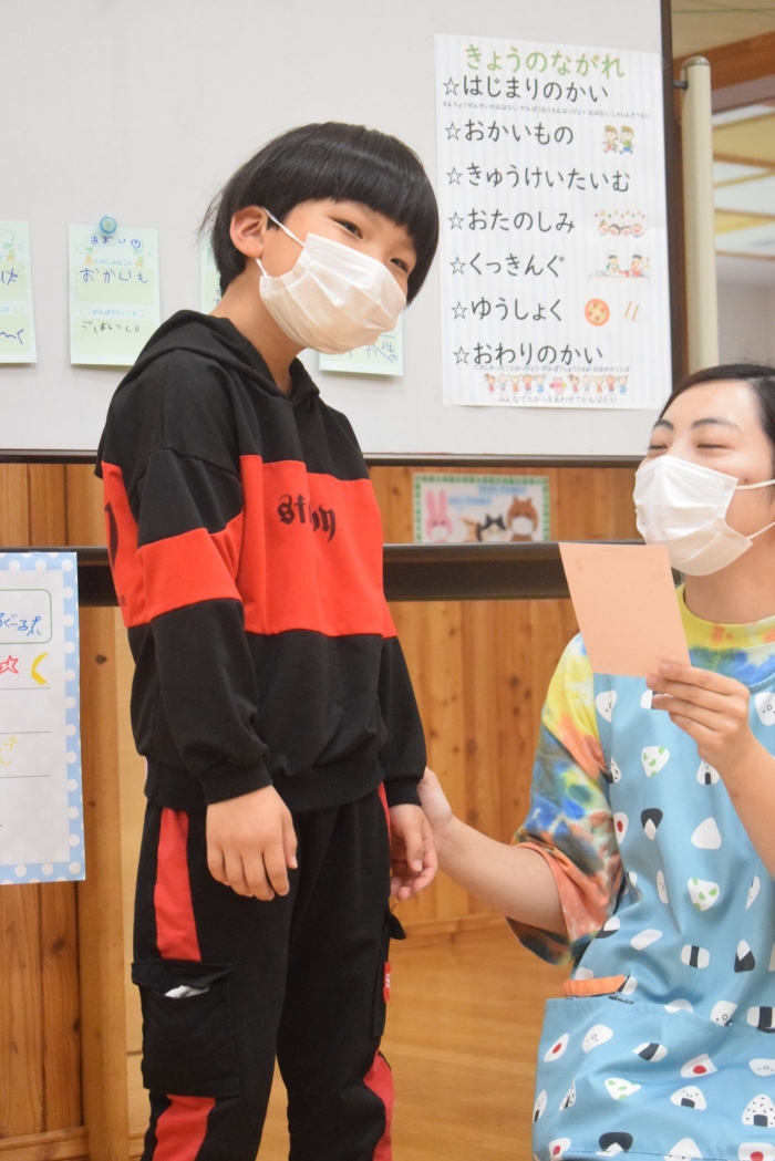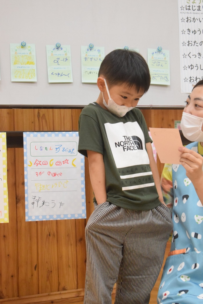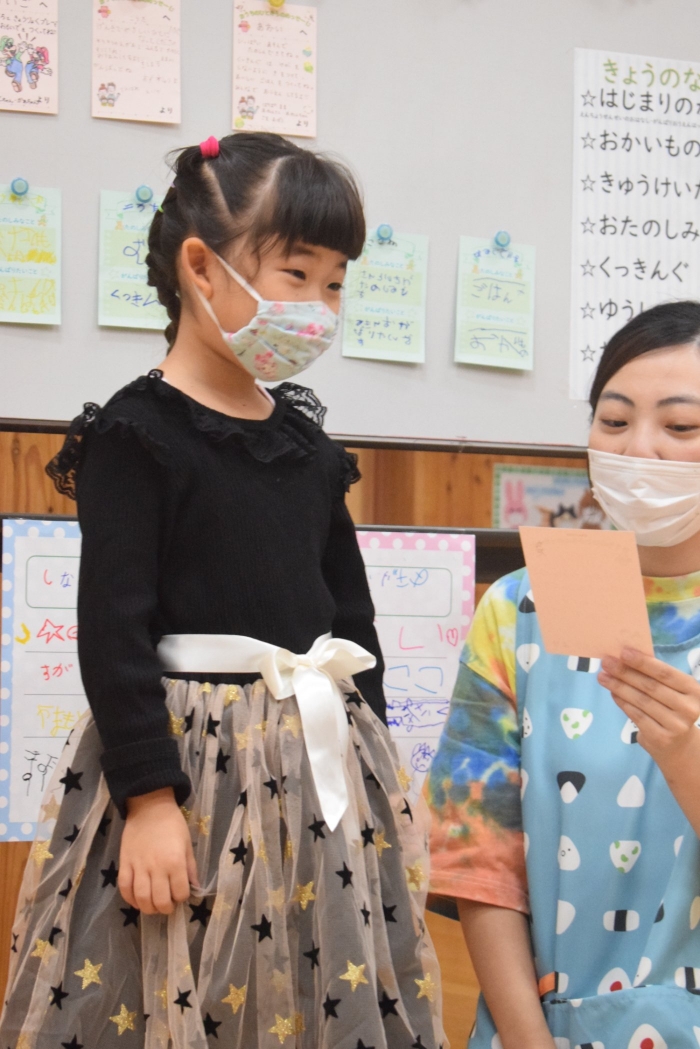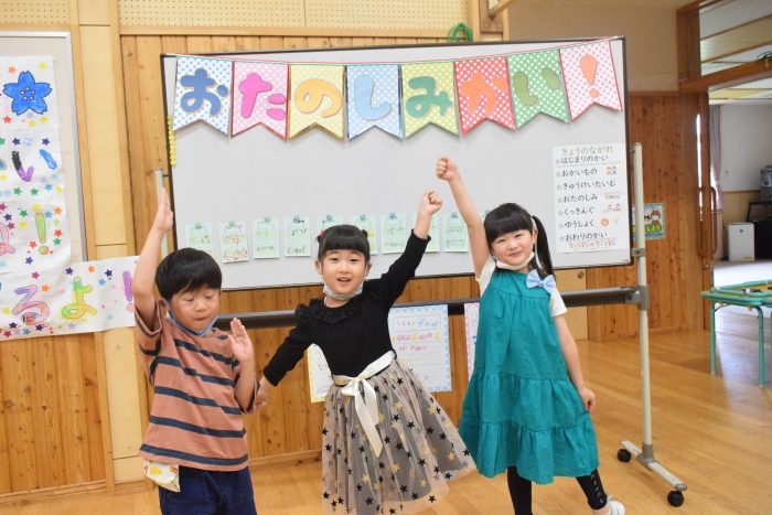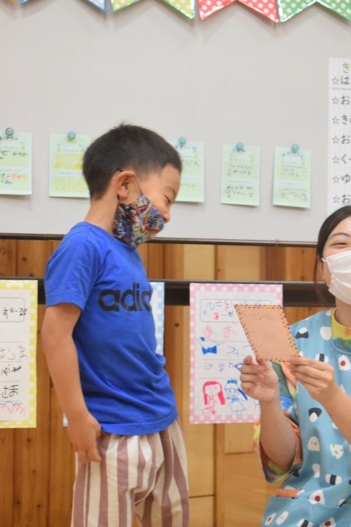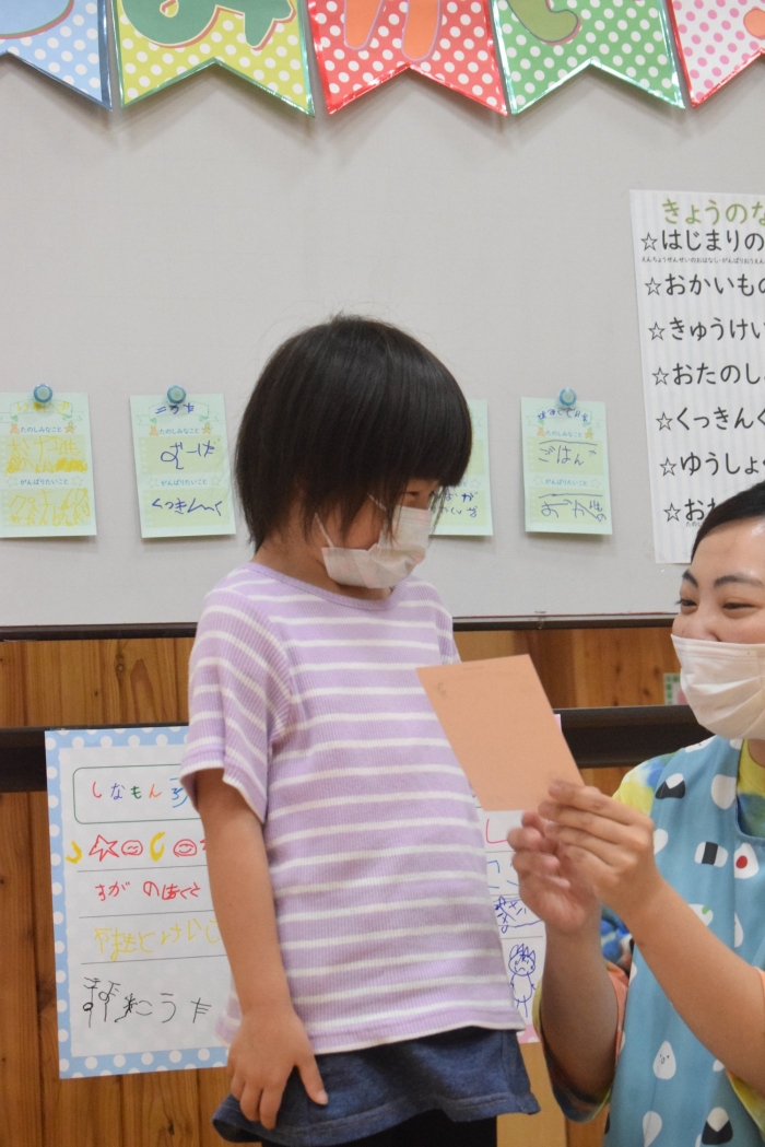 年長さんになったらできる一大行事の一つに『お楽しみ会』があります。年長さんになると随分といろいろなことができるようになります。その力をこの『お楽しみ会』で発揮し、自分自身でも感じ、自覚し、自信と優しく強い心を培ってほしいと願っています。一学期最後を締めくくる行事としてご家族の皆様にもご協力をいただきました。感謝いたします。うめさん、ももさんからもエールをもらいました。この行事のねらいである「家族と離れ、自分の力や友達と力を合わせ物事に取り組む」に向けて今日一日、頑張りましょう!そしてたくさん楽しみましょう!