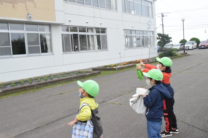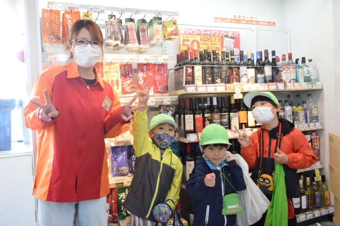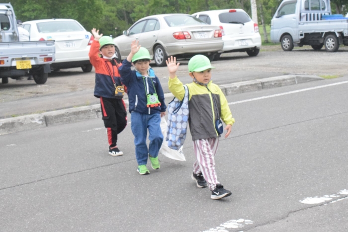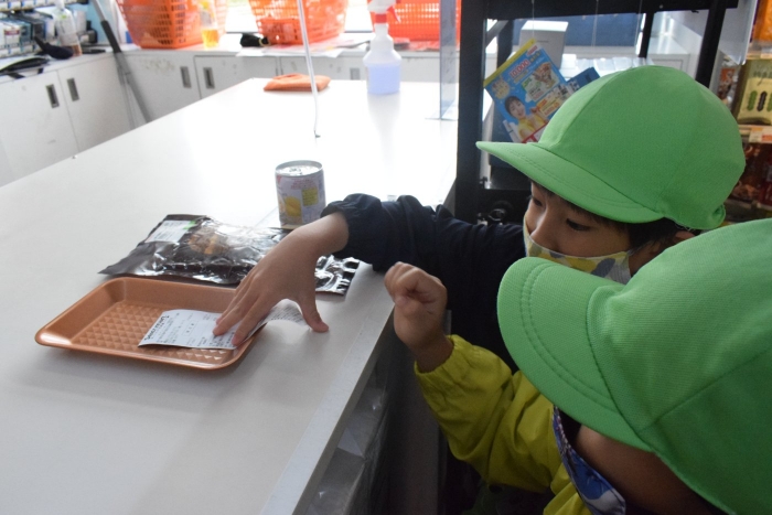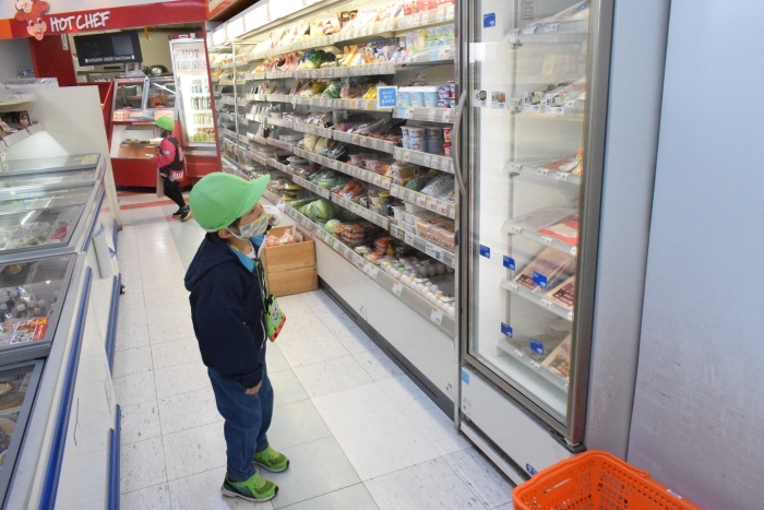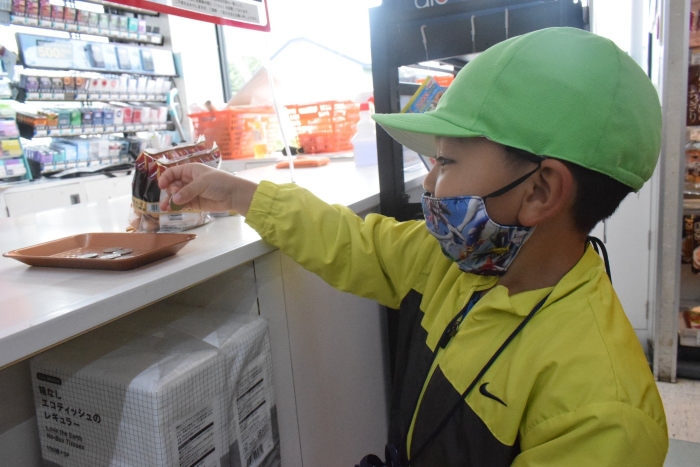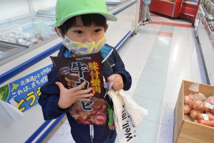 シナモングループ、ティラノサウルスグループ、ノコギリザメグループの3グループに分かれてお楽しみのセイコーマートへのお買い物。途中の出会いも楽しみの一つ。たくさんの人達に見守られて無事自分の担当の物を買うことができました。めでたしめでたし。