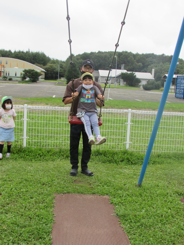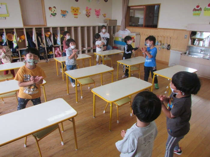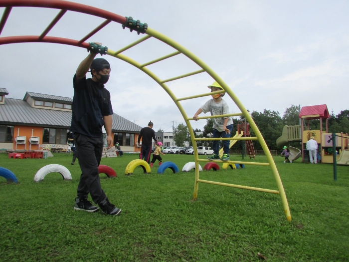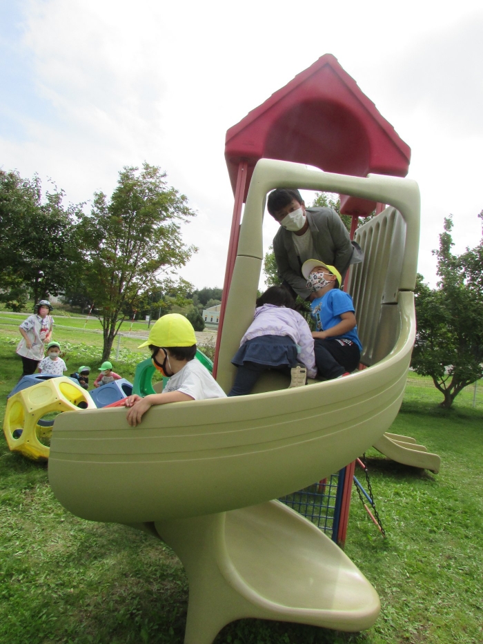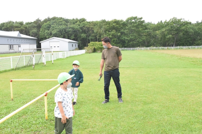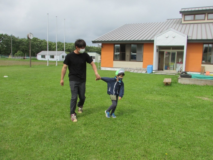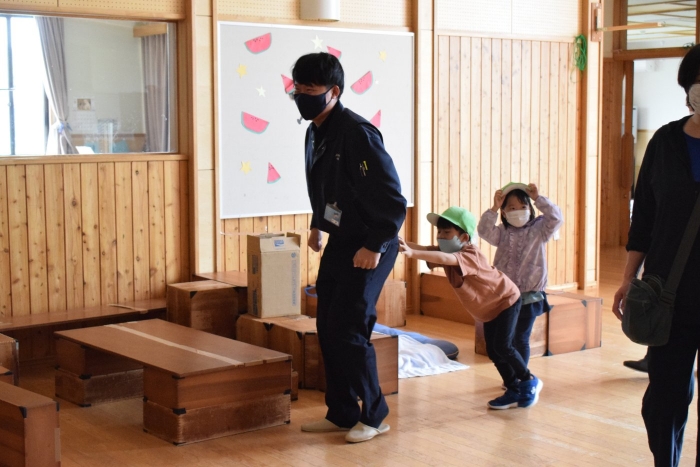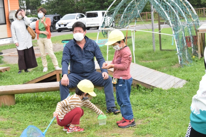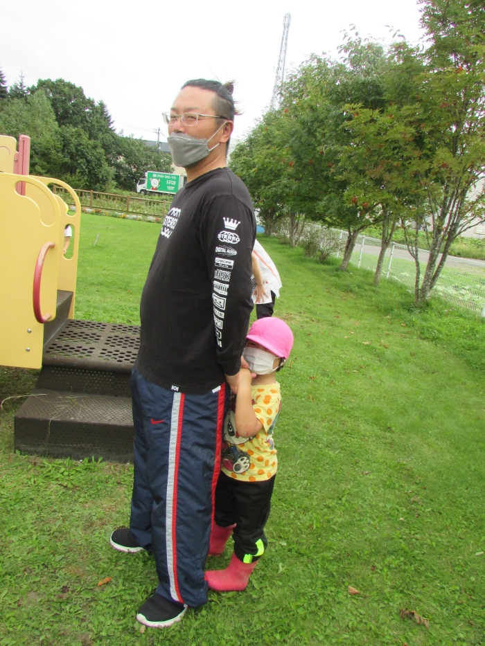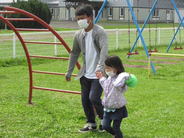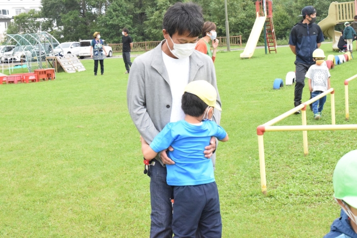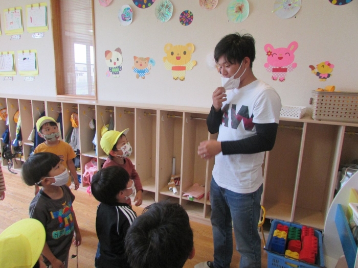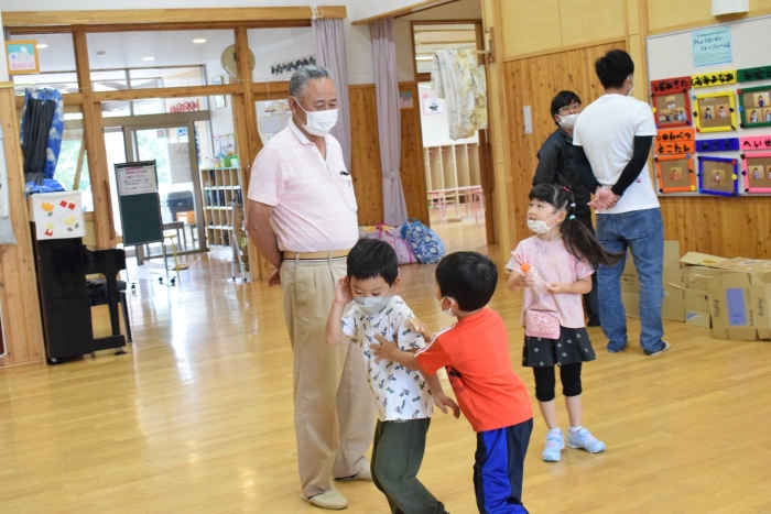 今日から7日までの期間、日頃幼稚園に来る機会の少ないお父さんや祖父母の方に幼稚園に来ていただき、朝の会や遊びの様子を参観していただく機会を設けました。朝の会や外遊びの様子を通して、お子さんの成長や幼稚園教育で培っていきたい力などをお話させていただきました。子ども達は幼稚園で会うお父さんやおじいちゃん、おばあちゃんが新鮮で、頑張っている姿を見てもらいたくて張り切って活動に参加していました。お子さんの幼稚園での様子を見て感じたことなどがありましたら、お母さんに伝えて連絡帳でお知らせ頂けると嬉しいです。よろしくお願いします。