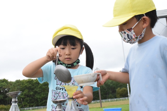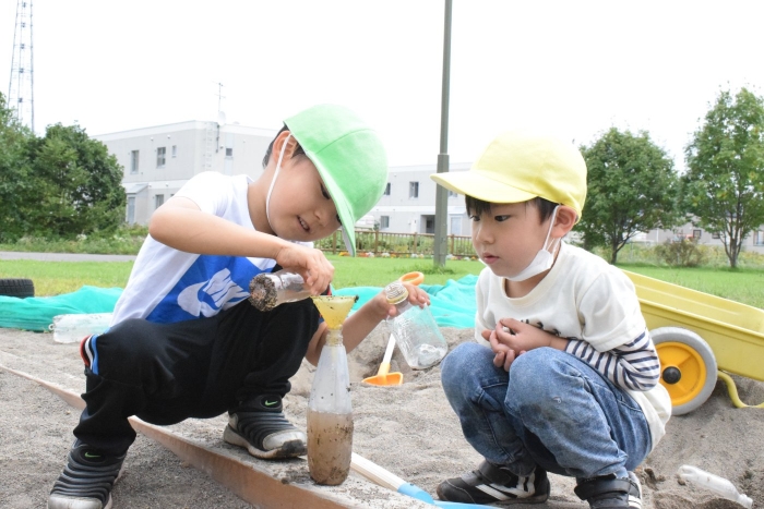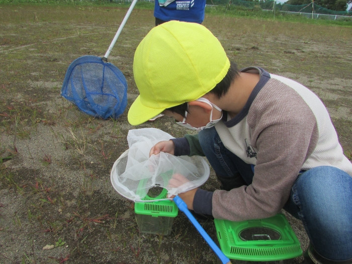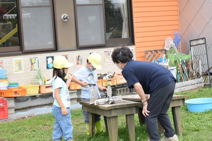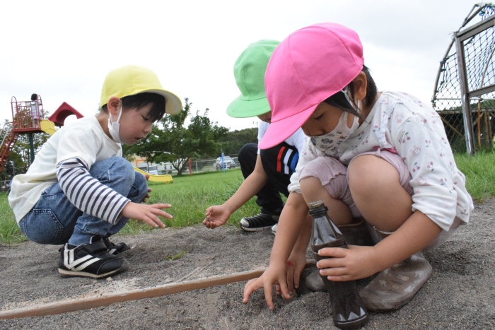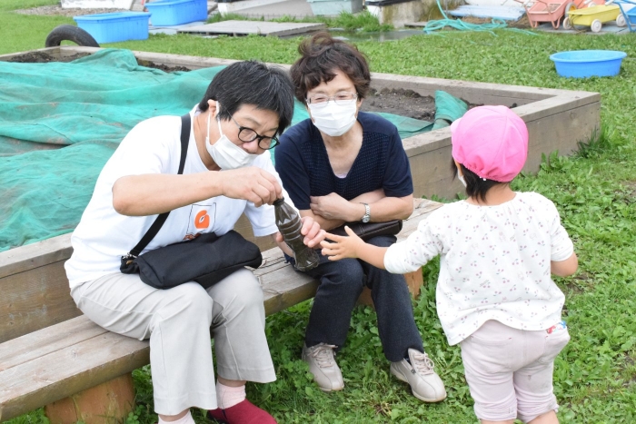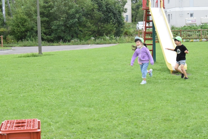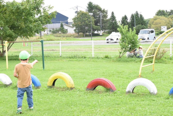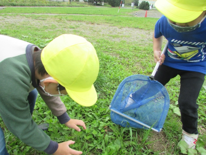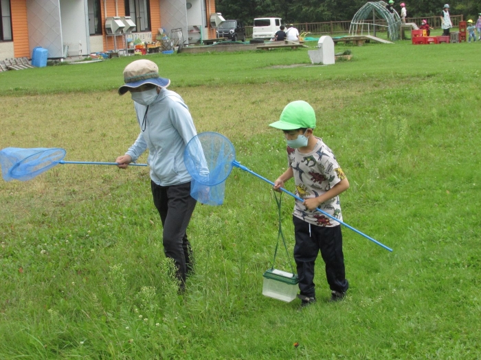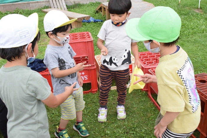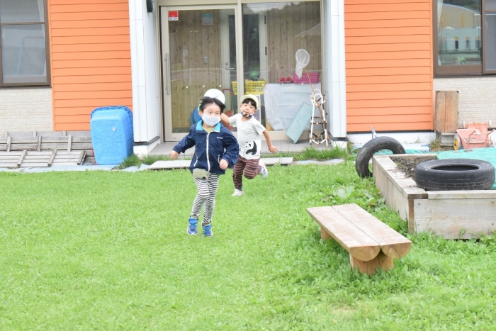 今日の外遊びでは、虫探しやカエル探しも相変わらずの人気。虫派とカエル派がいて、バッタや小さいカエルを虫かごいっぱいに捕獲していました。今は捕ることに楽しみを感じているようです。