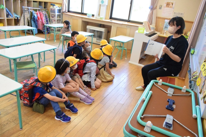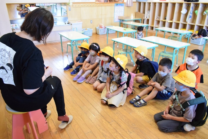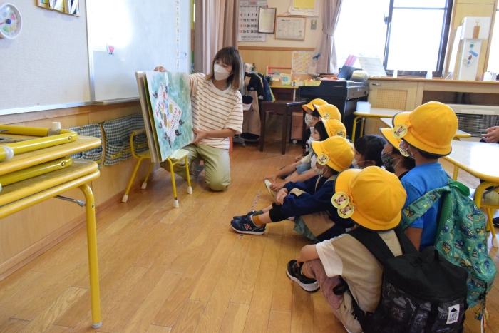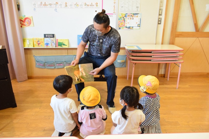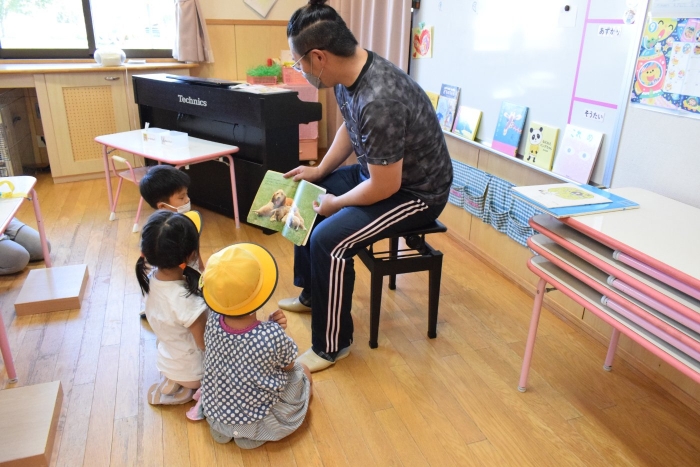 保護者読み聞かせ 2022年09月07日(水) 行事 今回はお父さんも読み聞かせに来てくれました。 さくらさんは『おじゃましまーす』 魚が出てくるだけでテンション上がって。 真剣に見入ってます。 ももさんは大型絵本『おしゃれなおたまじゃくし』 お母さんとしっかり向き合って。 大きな絵本に釘付け。 うめさんは『みんなきてきて』『このゆびとーまれ!』 冷や汗をかきながら。 2冊も読んでくれました(^^♪