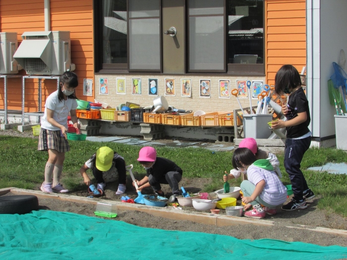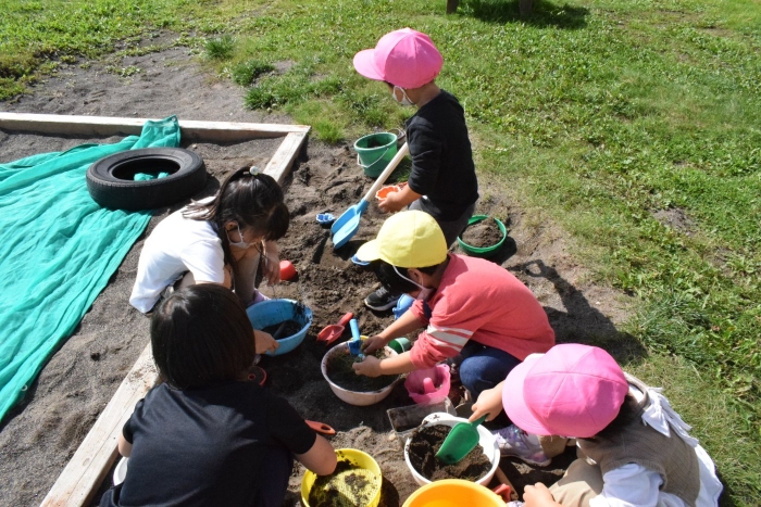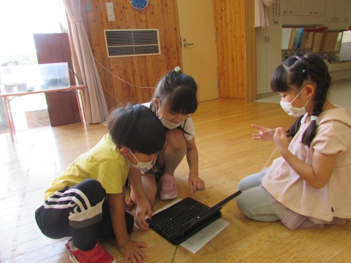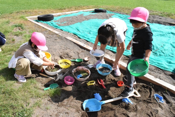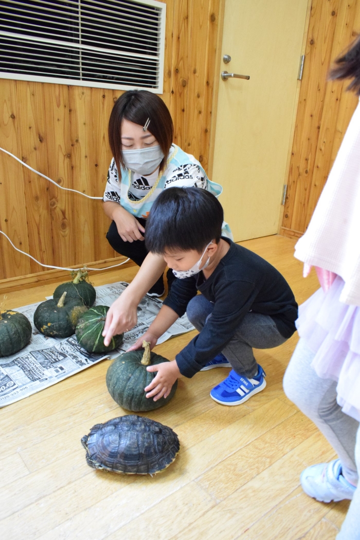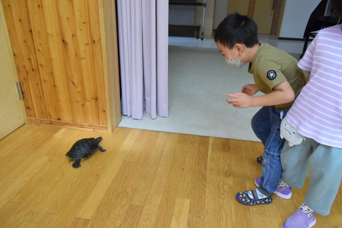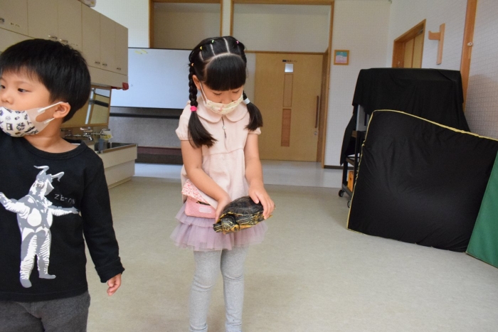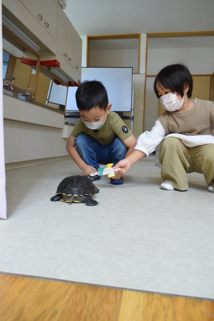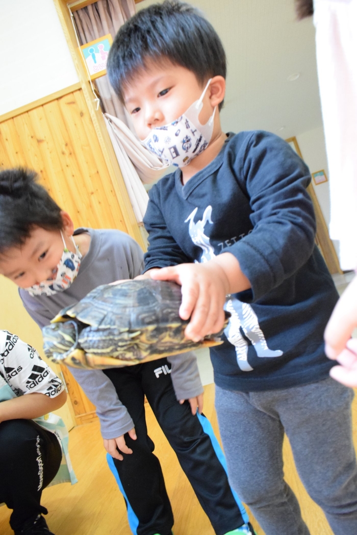カメのリアンちゃんのお部屋の掃除中。みんなのアイドル『リアンちゃん』日に日に大きくなっていくような・・・。みんなとの触れ合いも大好き!? カエルやチョウチョ、キリギリス、バッタ、ミミズ・・・いろいろな生き物と触れ合ってきた子どもたち。生き物との触れ合いは情緒面にも大きな効果が期待されます。命あるものとの関わり方を自然に学ぶ気大切な機会です。