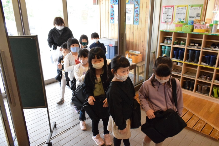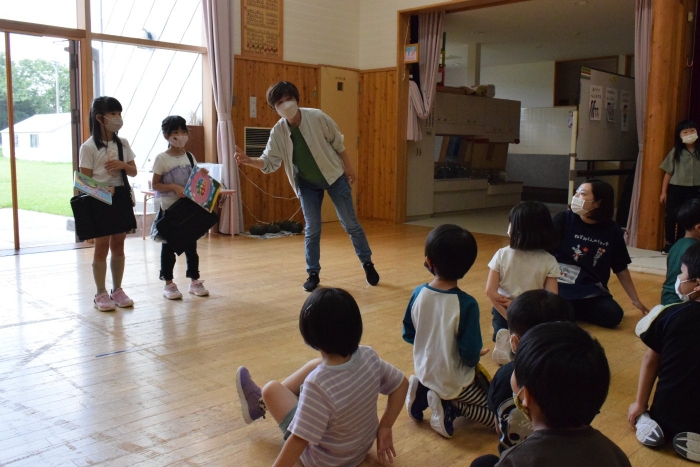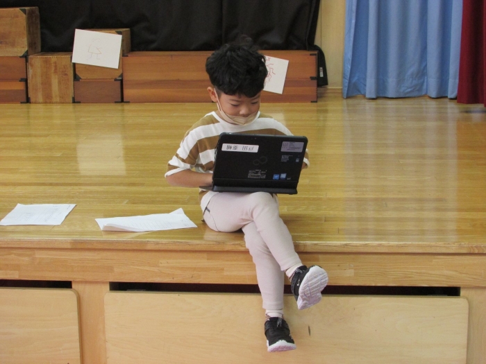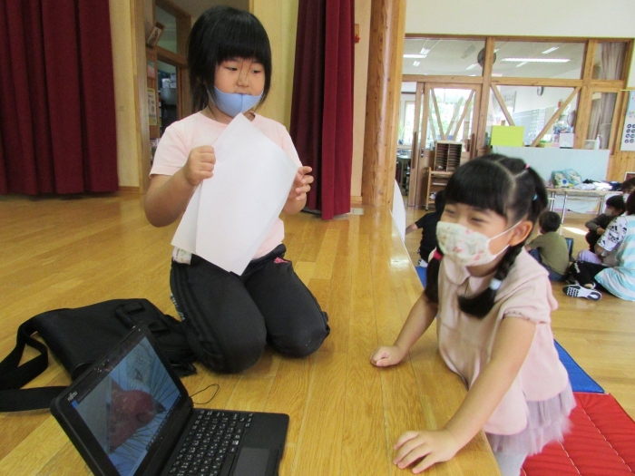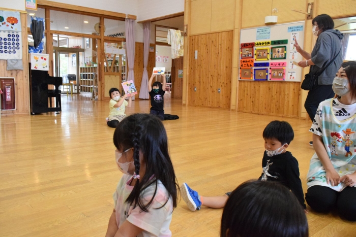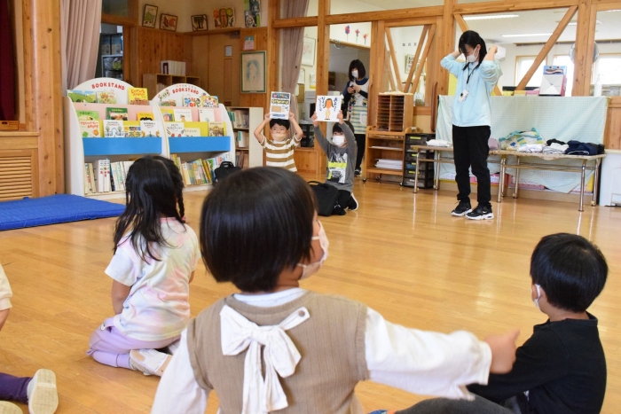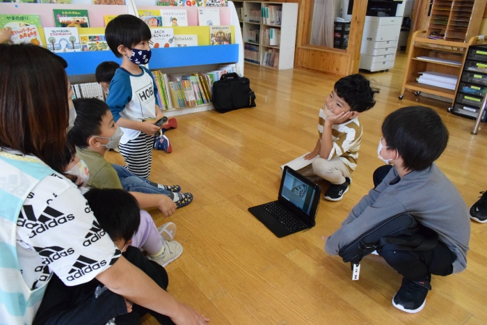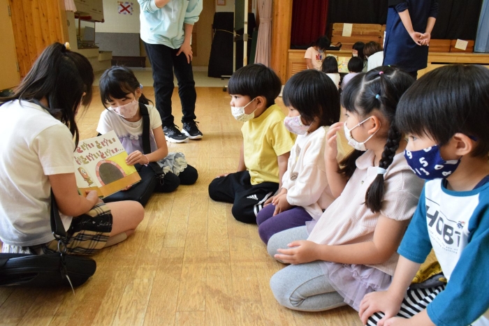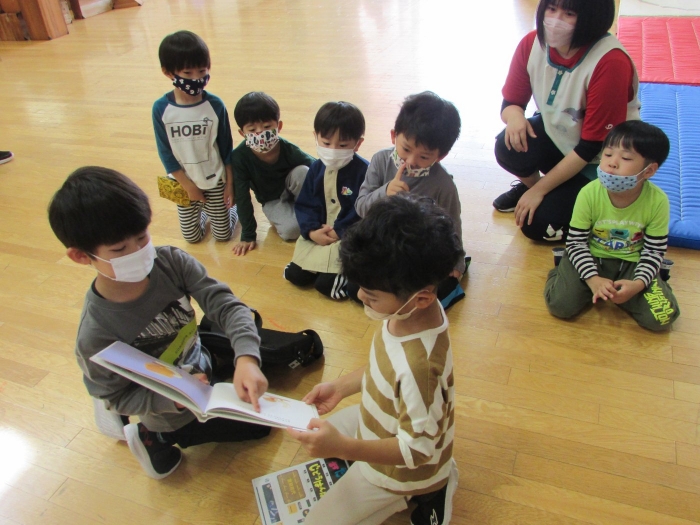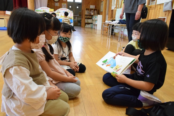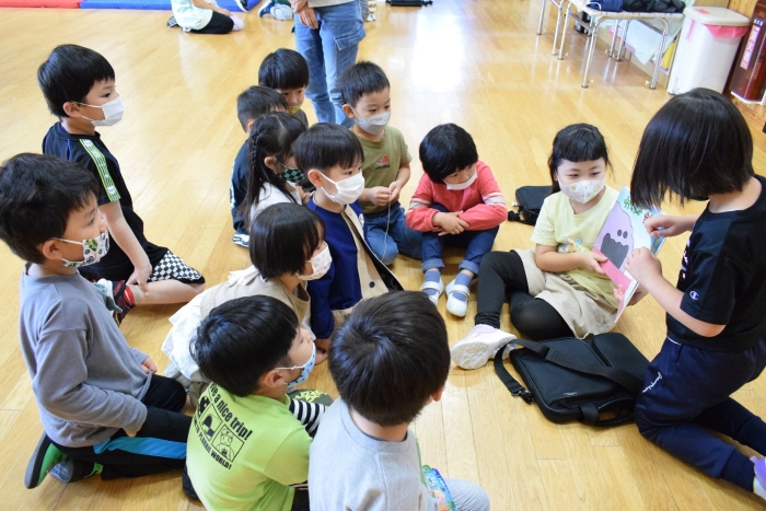 4つのブースに分かれて自分が見たい絵本の所に行って読み聞かせをしてもらうシステムで、園児たちは興味のある絵本のブースに集まり集中してお話を聞いていました。一年生は少し緊張もあったようですがスラスラと読む姿に園児たちからあこがれの眼差しが。絵本の後はクイズも用意してきてくれて、一年生が持っているタブレットに目が釘付けでした(^^)/ さくらさんは、来年は自分たちもタブレットを持つことができることに期待が大きいようです。