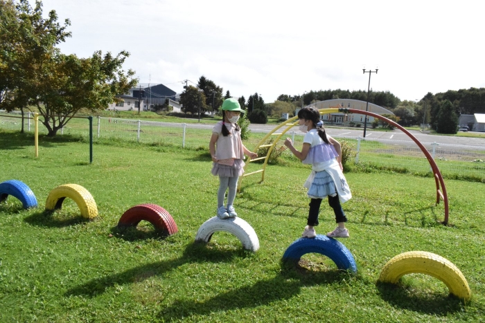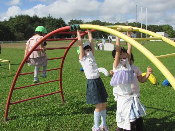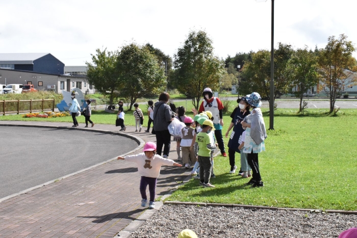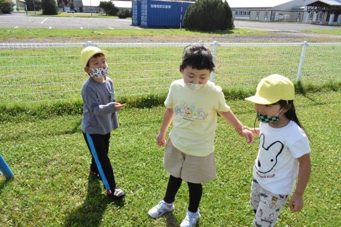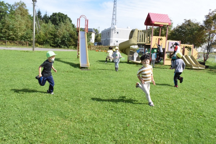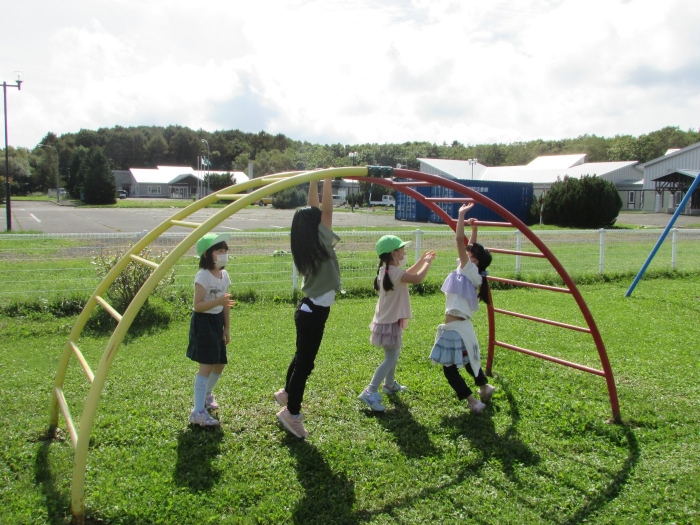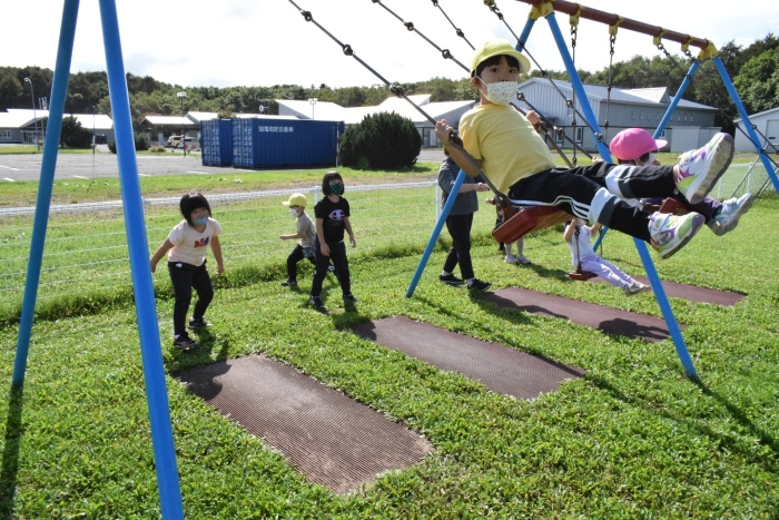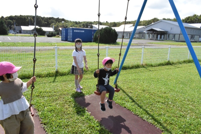 お勉強の後は外で一緒に遊びの時間(^^)/ ブランコや砂場で「幼稚園でよくやってた!」と懐かしさと自分たちの成長を感じながら短い時間でしたが園児たちもとも触れ合うことができ、実りある交流ができました。