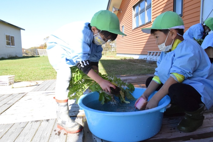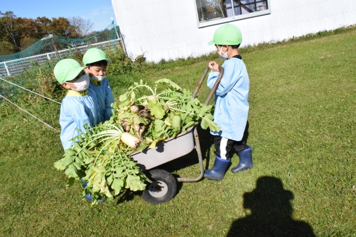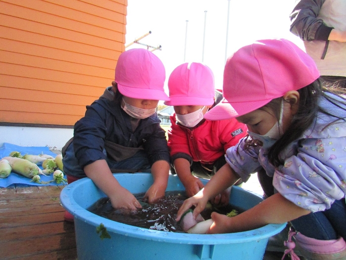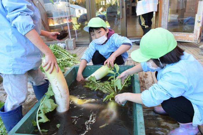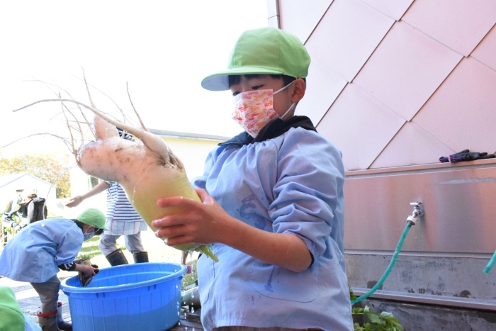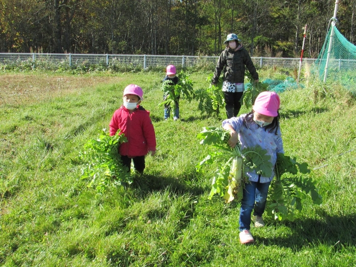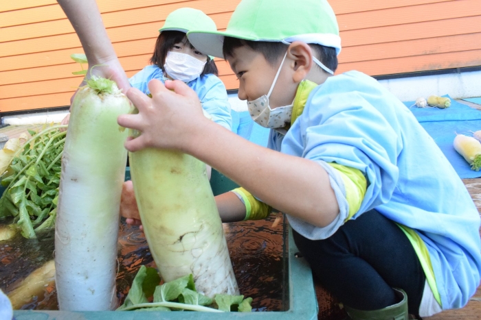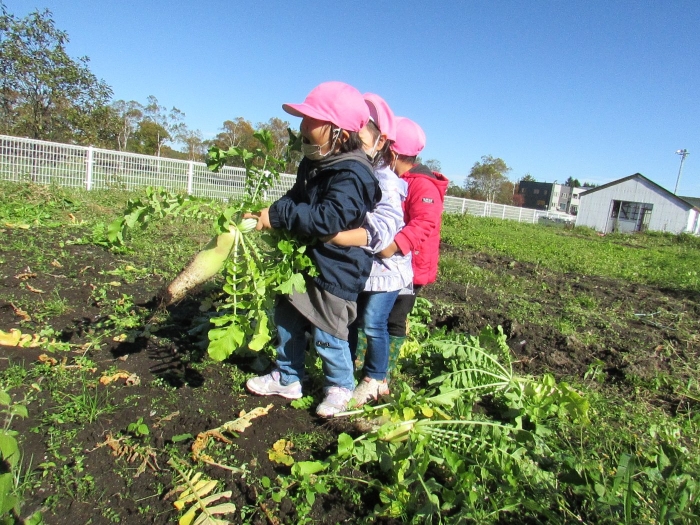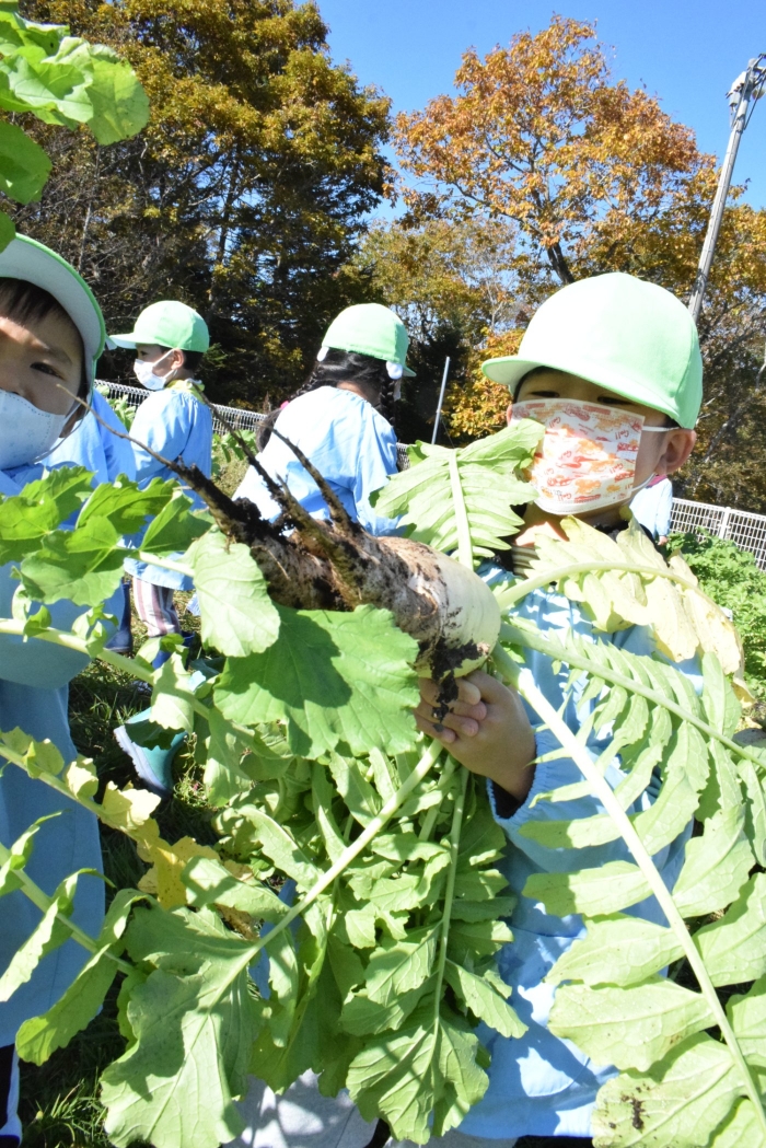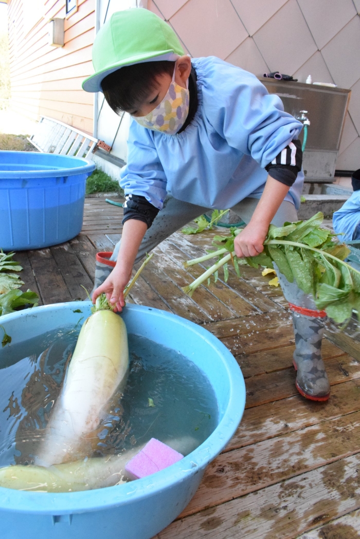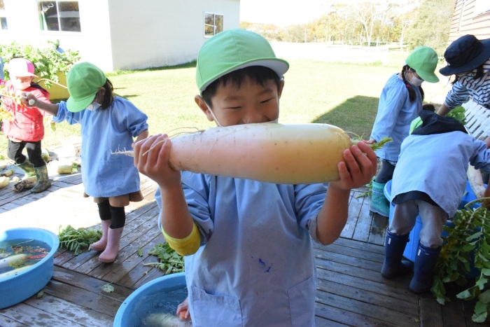朝の遊びで大根抜きがブームになっていましたが、今日は本物の大根抜きをやりました。畑の作物はほとんど収穫したので残っていたのは大根だけ。鹿よけのスズランテープの効果か鹿の被害に遭うこともなく大きく育った大根たち。いろんな形が出て来ておもしろ大根大集合です!(^^)! この大根で、26日に漬物の先生を迎えてさくらさんが大根の漬物作りに挑戦します。美味しくできるかな?今から楽しみです。