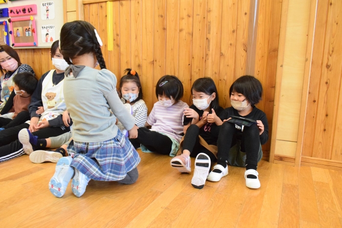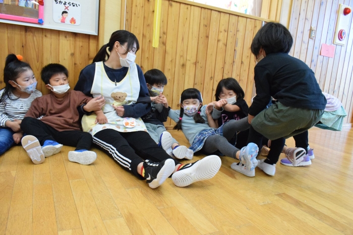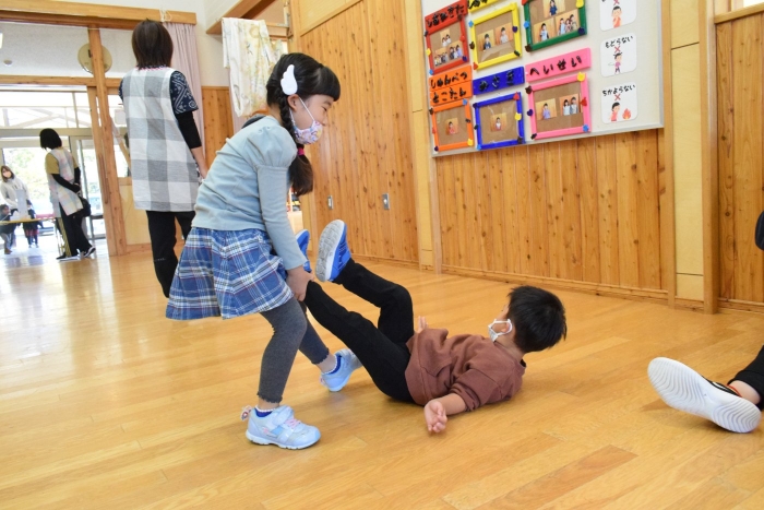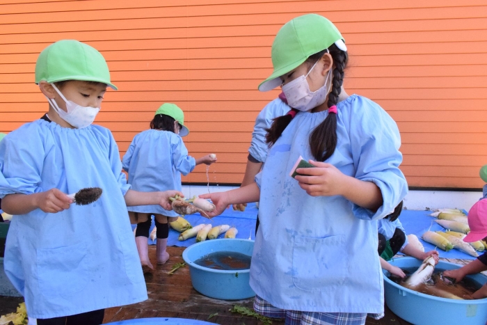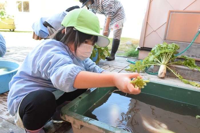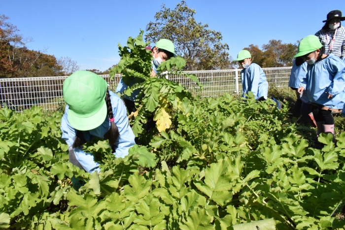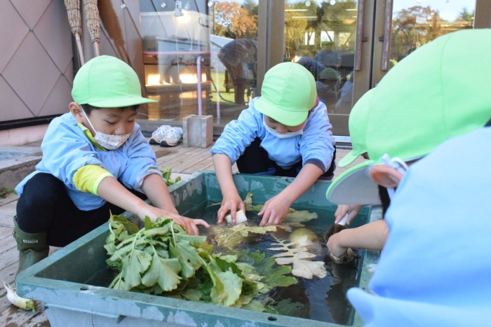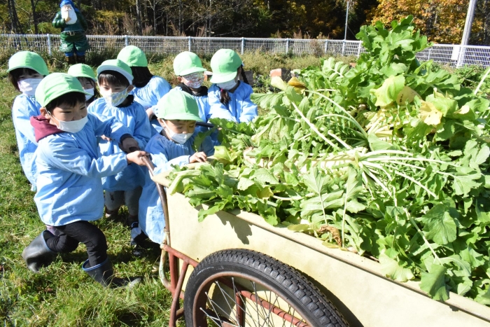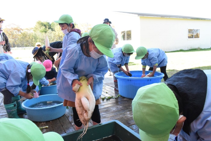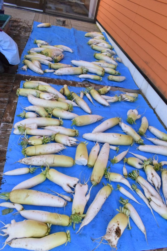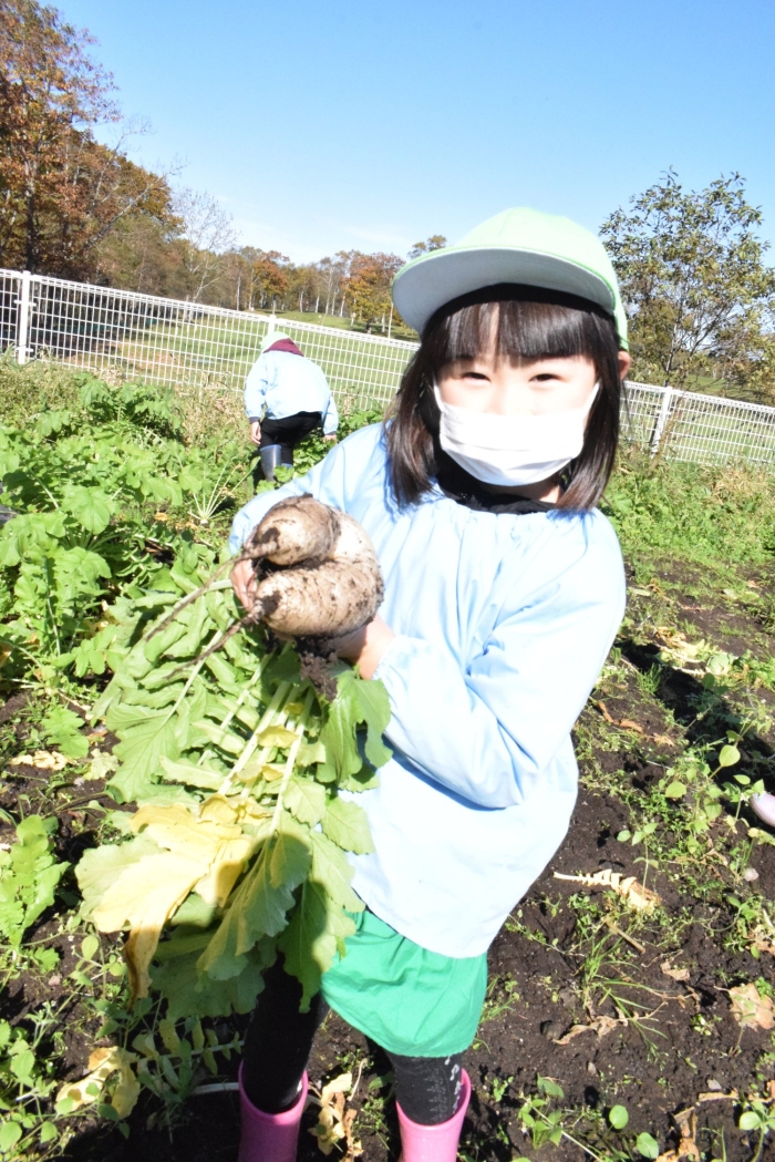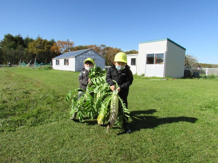 朝の遊びで大根抜きがブームになっていましたが、今日は本物の大根抜きをやりました。畑の作物はほとんど収穫したので残っていたのは大根だけ。鹿よけのスズランテープの効果か鹿の被害に遭うこともなく大きく育った大根たち。いろんな形が出て来ておもしろ大根大集合です!(^^)! この大根で、26日に漬物の先生を迎えてさくらさんが大根の漬物作りに挑戦します。美味しくできるかな?今から楽しみです。