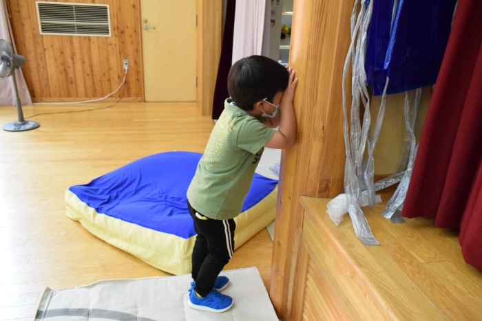 ももさんは昨日Nちゃんがやりたいと言っていた『かくれんぼおにごっこ』今日みんなで遊ぼう!と話していましたが本人がお休み(>_<)、でもやりたくてお部屋でみんなで(3人ですが・・・)ルールを確認し合ってから遊びました。お互いの顔が見えるように座ることで友だちのお話も聞けるようになっています。