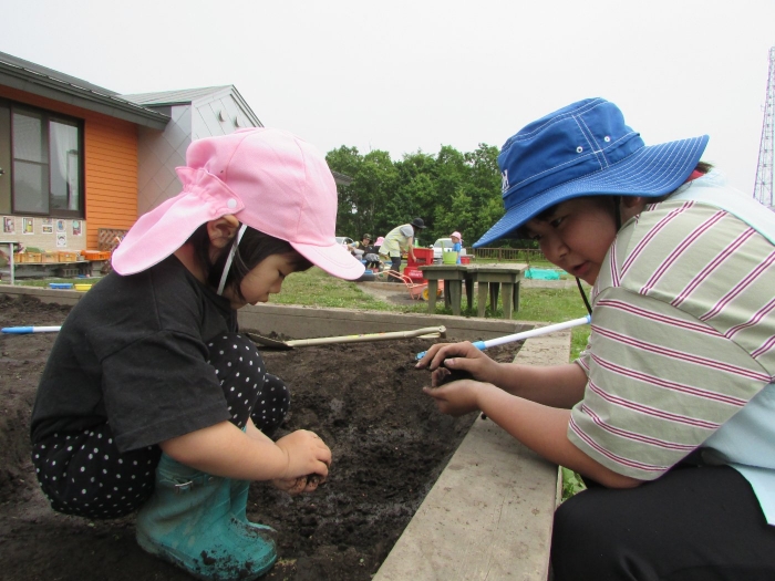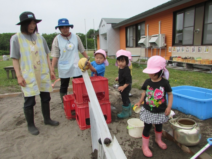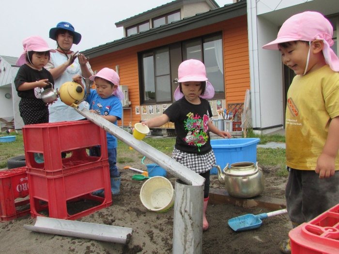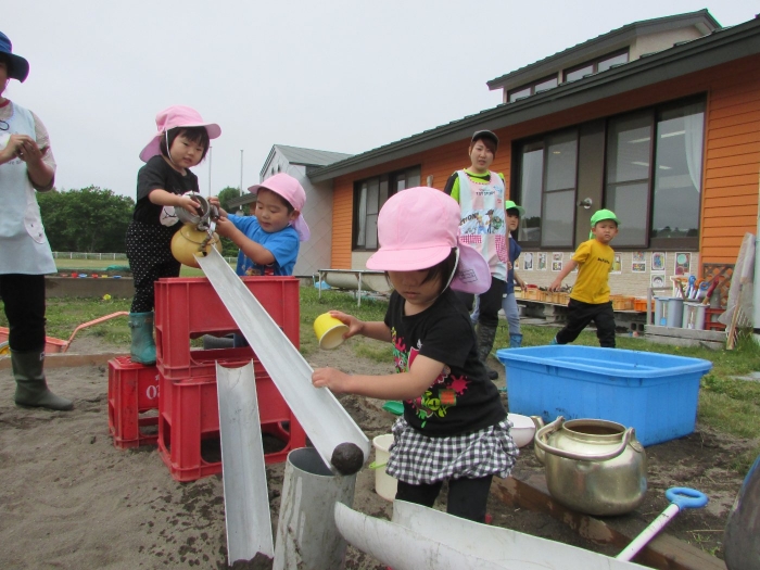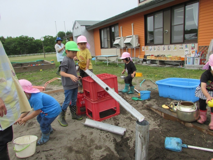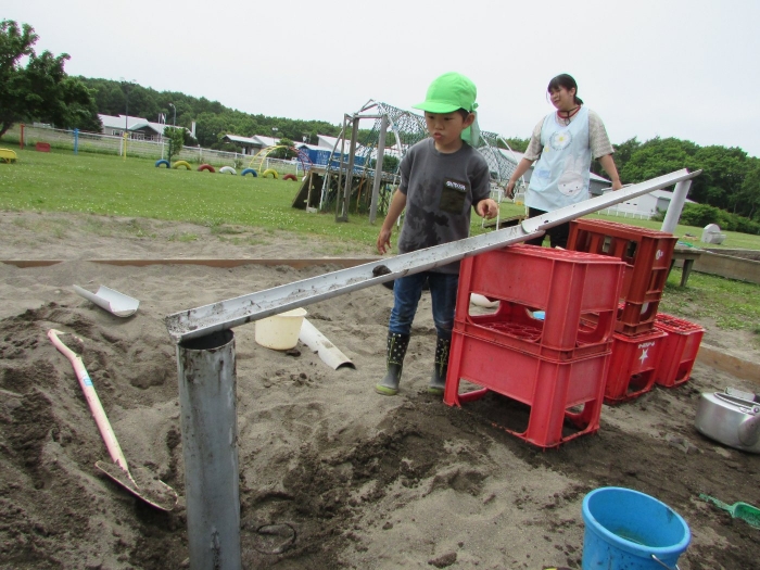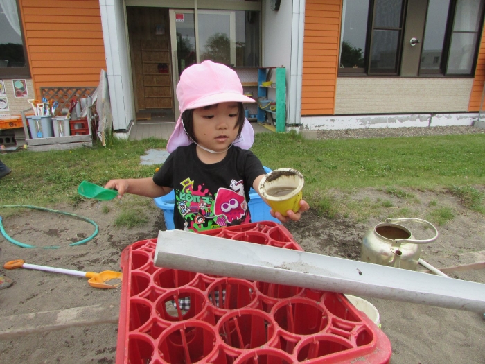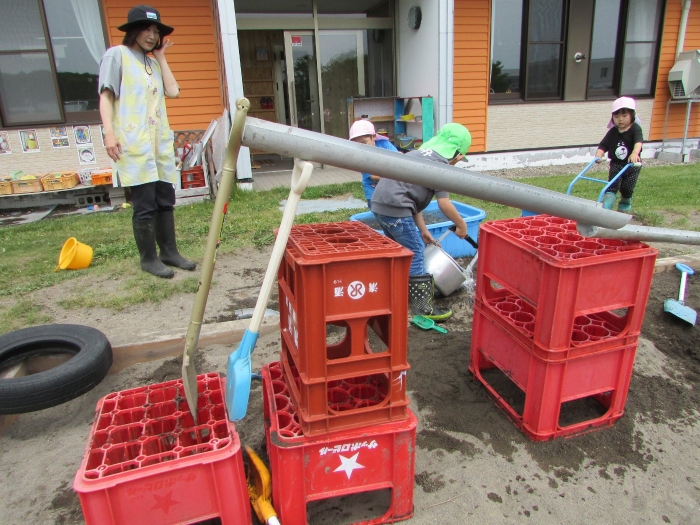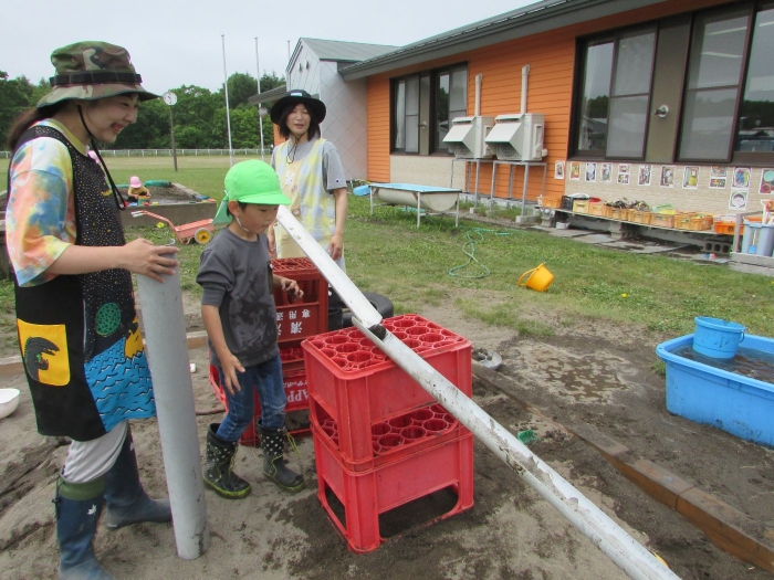 外では砂場で塩ビ管や水を使って大々的に工事が始まりました。泥団子を流してみたり、角度をつけて流れを急にしてみたりしながら水の流れや砂に吸収される不思議さを感じているようでした。