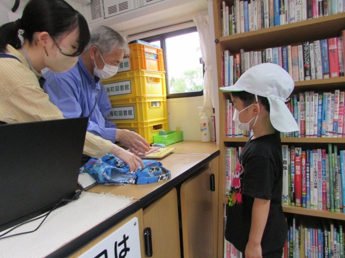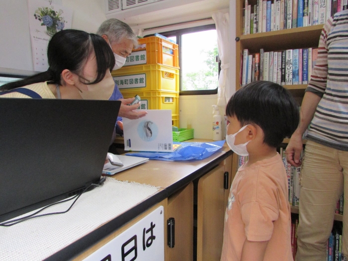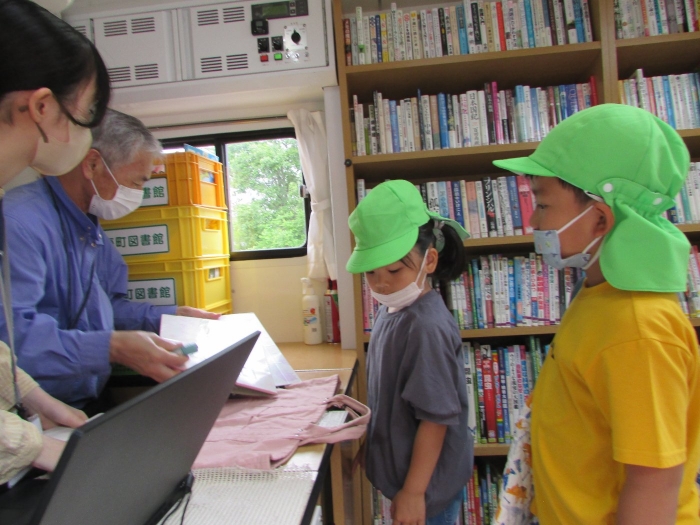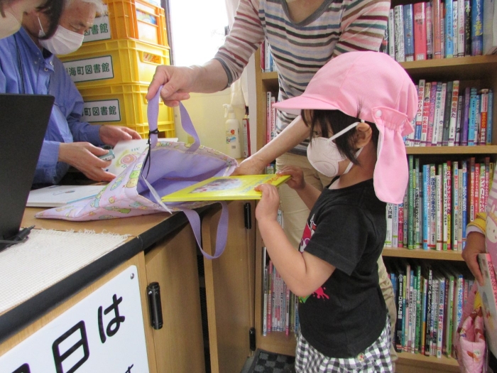 今年度初めてのはくちょう号での絵本貸し出し、うめさんは絵本バスに乗れるのが楽しみで張り切って乗り込んでいきました(^^)/ 乗ったらまず、消毒します、それからカウンターに居る図書館の方に挨拶をします、そして絵本を3冊選びます、カウンターでカードを出してピッとしてもらったらお礼を言ってバスを降ります。さくらさんやももさんの借りているのを見ながら一生懸命に真似していましたよ。選んだ本はおうちで読んであげてくださいね!