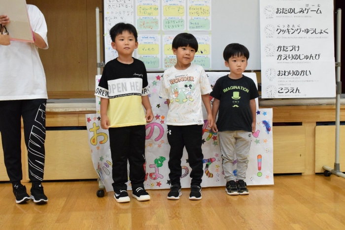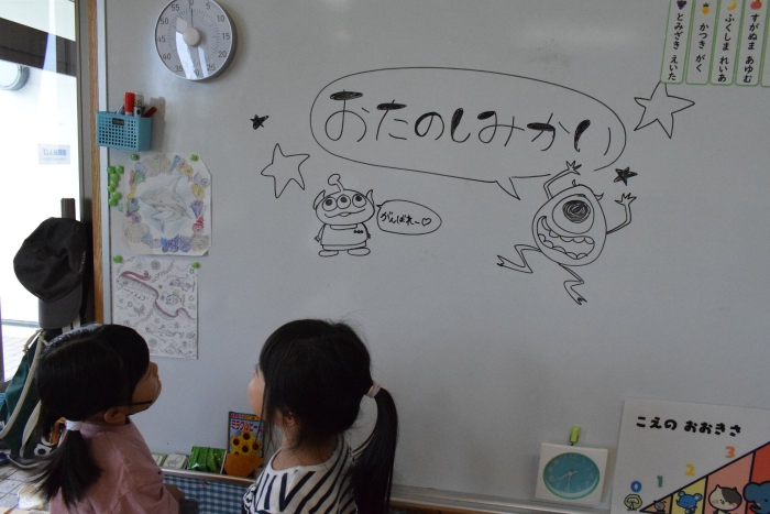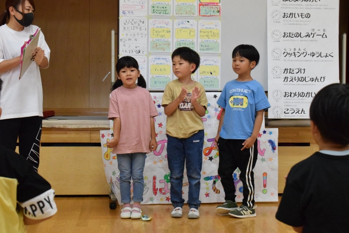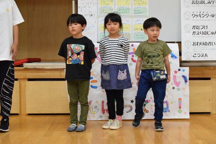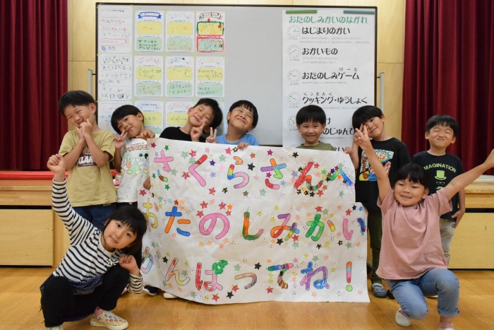今日はさくら組さんの一大行事『お楽しみ会』の日でした。この日はうめさん、ももさんはお休み、さくらさんだけが午後から幼稚園に登園してきました。いつもはお昼寝をしている時間なのですが今日は午前中ゆっくり休んだので元気ハツラツ! 始まりの会では「こんにちは!」の挨拶からスタート!