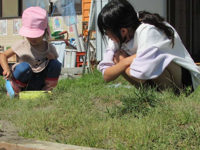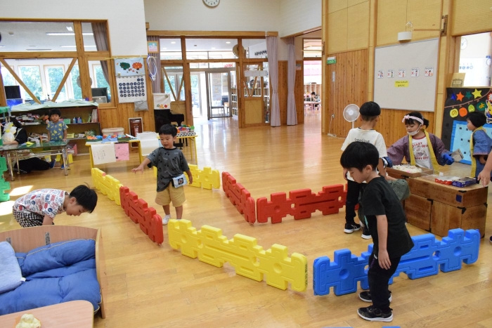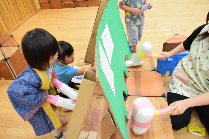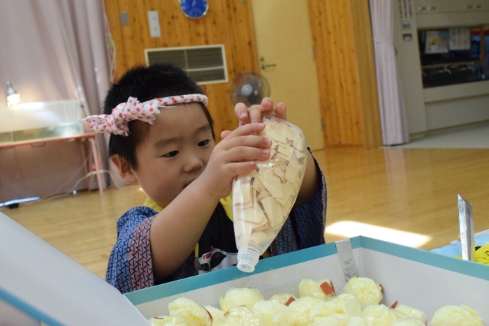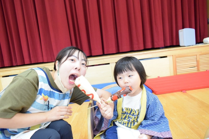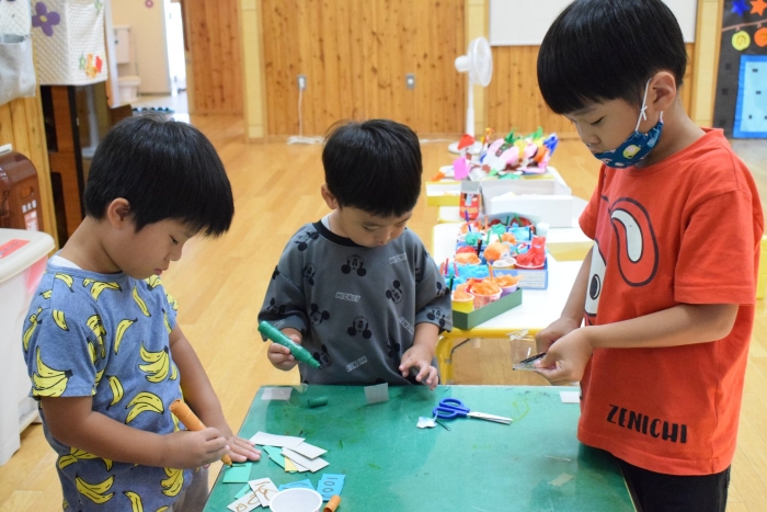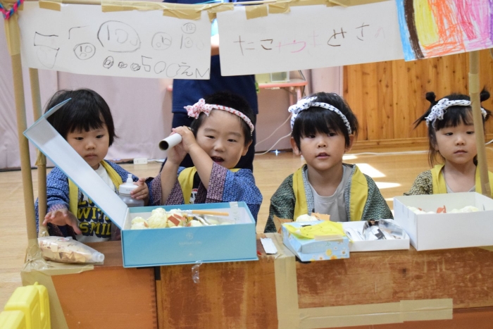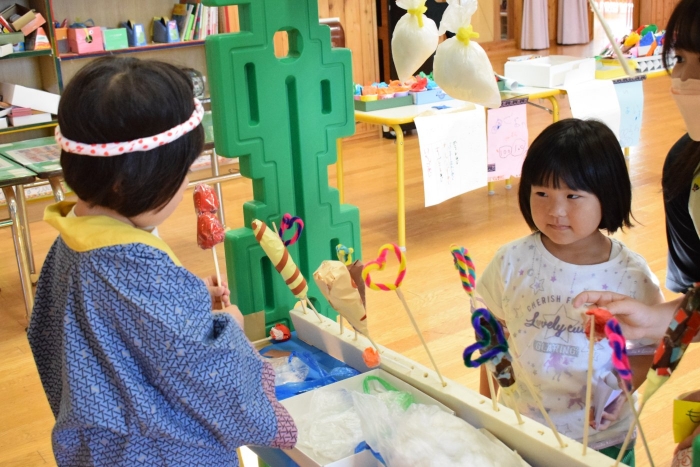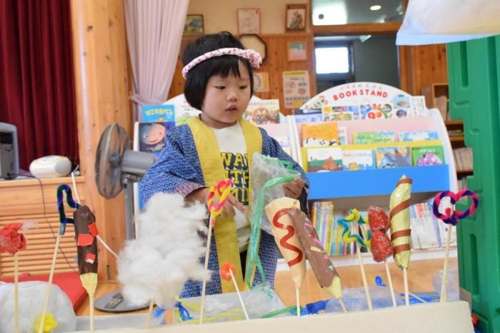 今日の朝の遊びは、昨日中学生が作っていってくれた食べ物を使って縁日ごっこが始まりました。