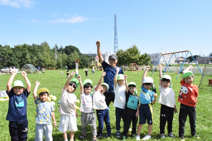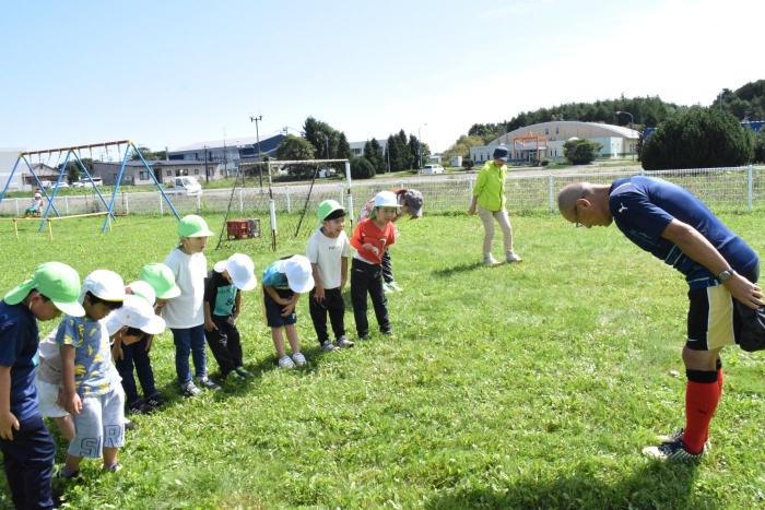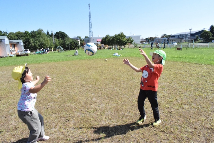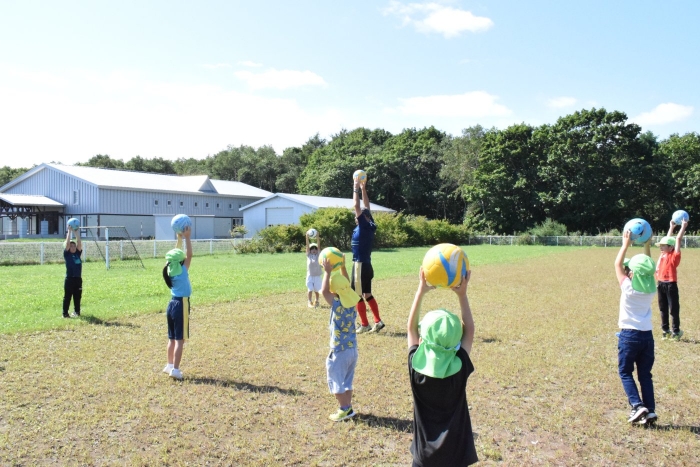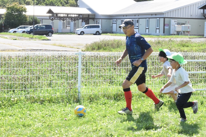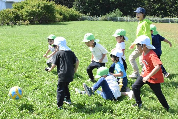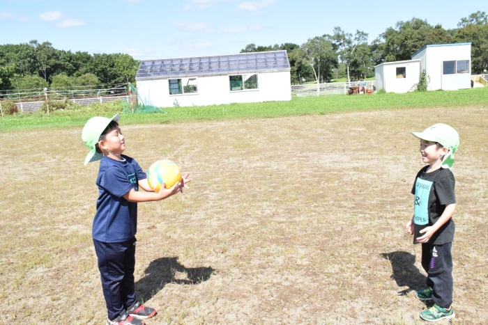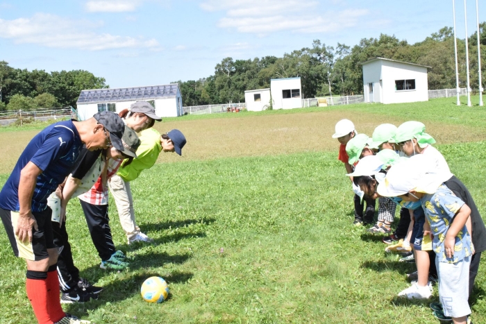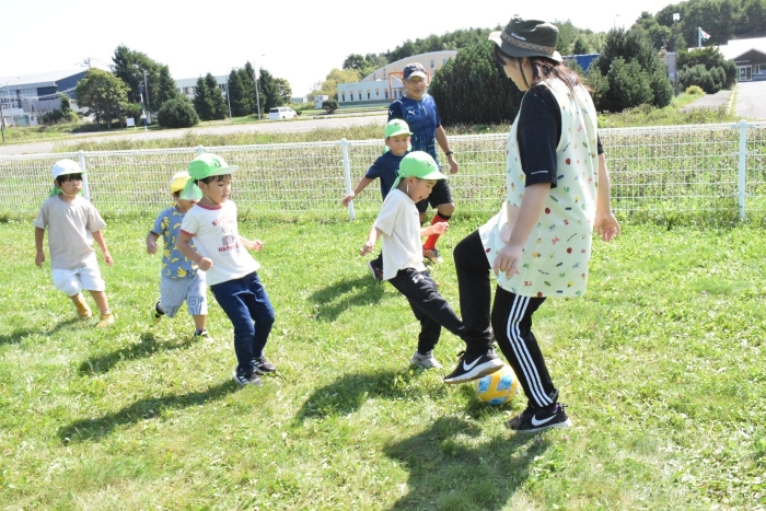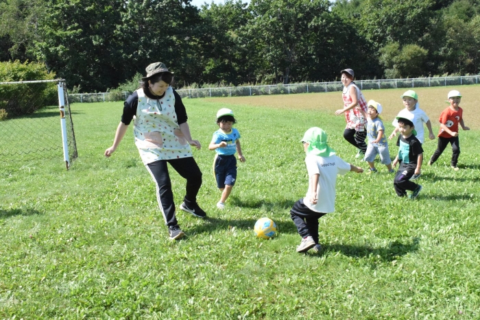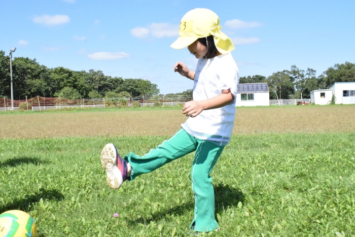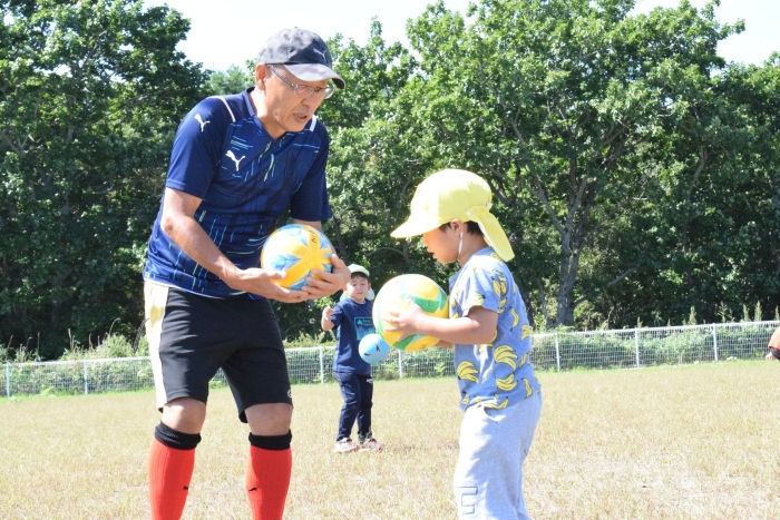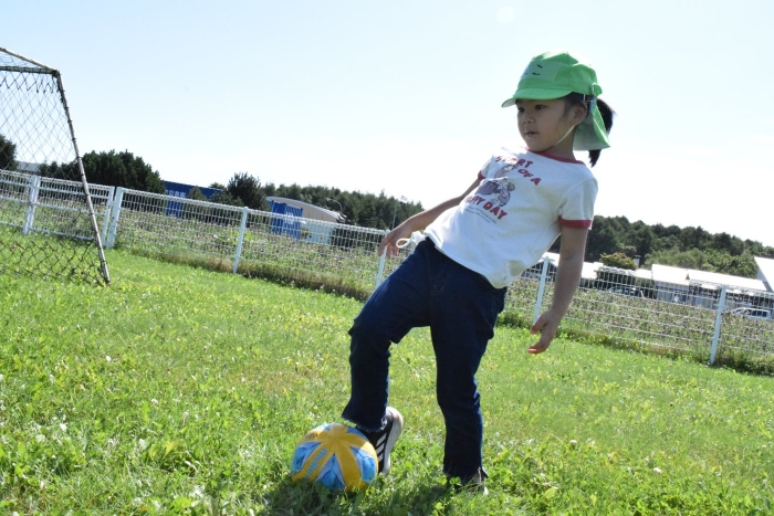 サッカー協会副会長のキッズ委員長さん『ゆうちゃん先生』がももさん、さくらさんを対象にサッカーの指導に来てくださいました。ボールをついたり、転がしたり、投げて受け取ったりなど、体を動かす楽しさはもちろん、挨拶や話を聞く態度など、メリハリのある指導でゲームもやることができました。サッカー教室は1回の予定でしたが余りの楽しさに「またやりたい!」とリクエスト。あと2回ぐらいは来てもらえるように調整したいと思います。