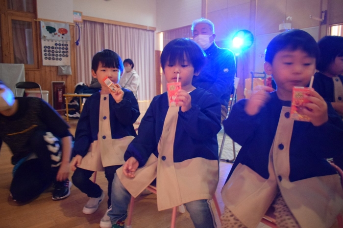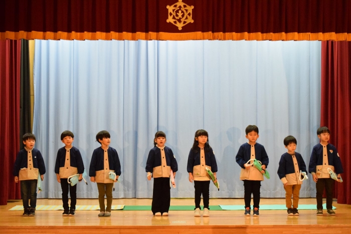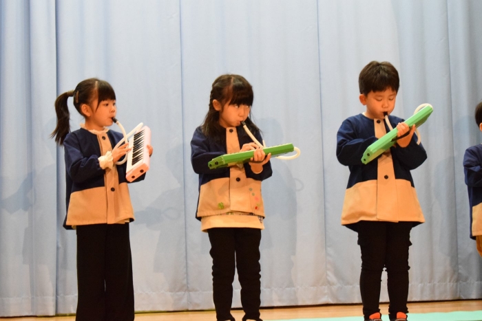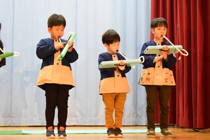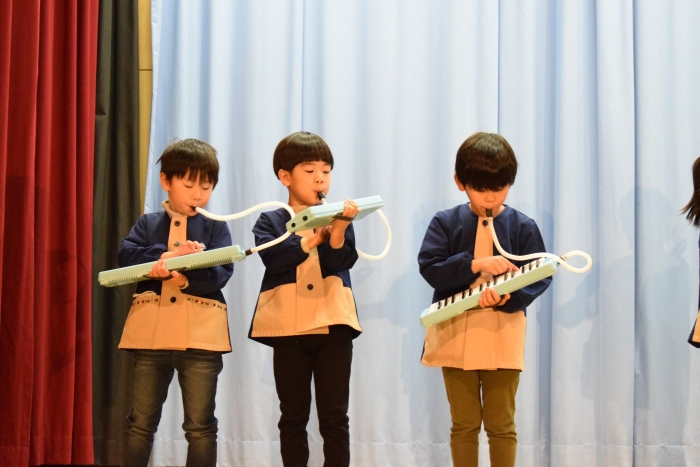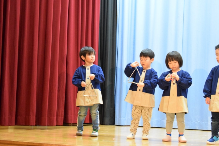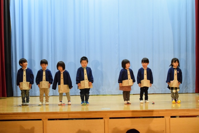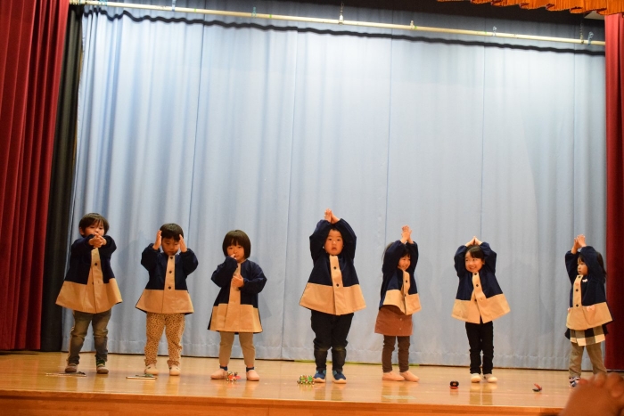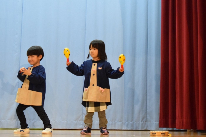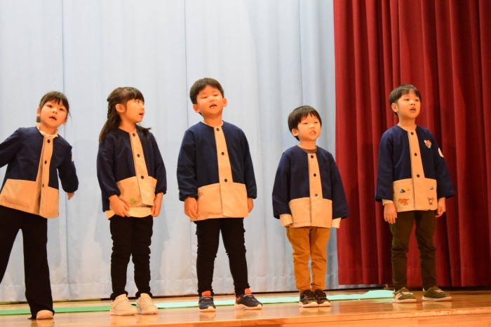 子どもたちは朝から気合が入った表情で登園してきましたよ! いつもと違う雰囲気に戸惑う子もいましたが、ステージに上がると、友だち同士刺激を受けながら精一杯発表をしていました。今日の経験で本番のイメージもついたのではないかと思います。衣装を着けての写真は当日までのお楽しみにしていてください。
