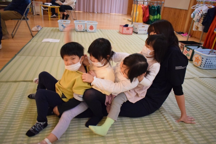 スポットライト係。光の感じを確認しながら。衣装係。園児に衣装を着せてくれます。子どもたちは自分の衣装箱に脱いだ服を入れて準備。