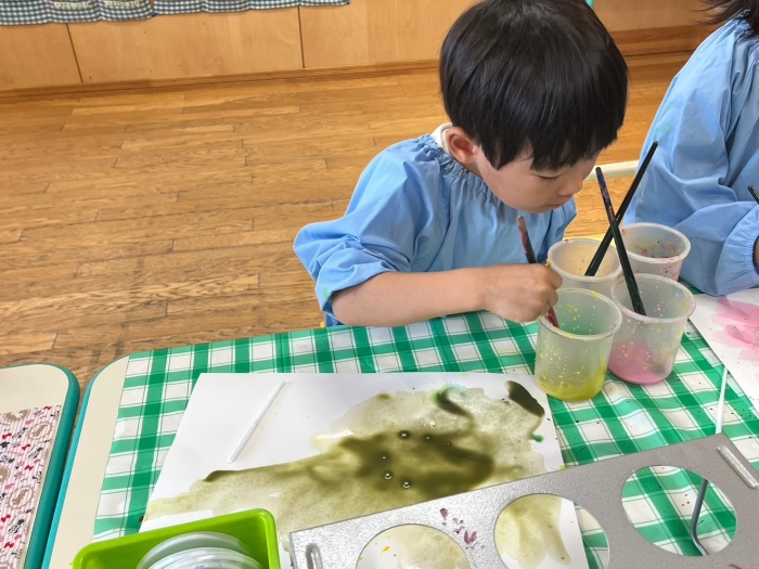 全クラスで絵の具遊びをやりました。「絵の具」と聞いて大喜びのうめさん、ルンルンでさくらさんのお部屋に異動!(^^)! 初めはストローで吹き絵に挑戦、疲れてくると筆や指を使ってペインティングを楽しんでいた芸術家の卵たち!(^^)! 自由に伸び伸びとイメージを膨らませながら取り組み心も解放されたようです(^^)/