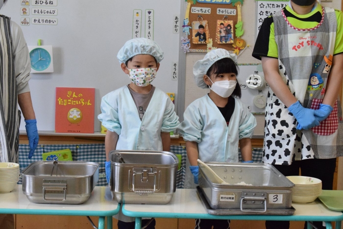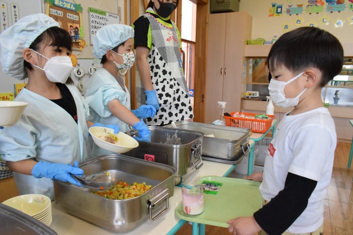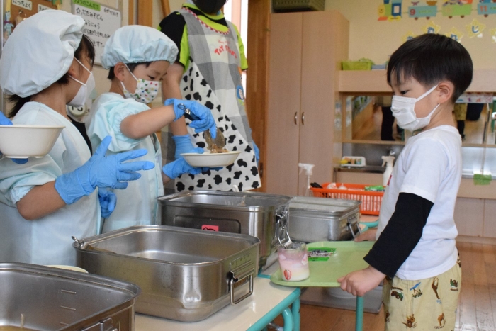 さくらさんの給食当番さんのお仕事がレベルアップ!(^^)! 一人一人に配膳して「このぐらいでいいですか?」と量を聞きます。聞かれたら「いいです」か「増やしてください」「減らしてください」と答えます。言葉のやり取りや自分の食べられる量を考えることを学びます。お当番さんは緊張しながらも配膳が「楽しい!」と意欲満々です。