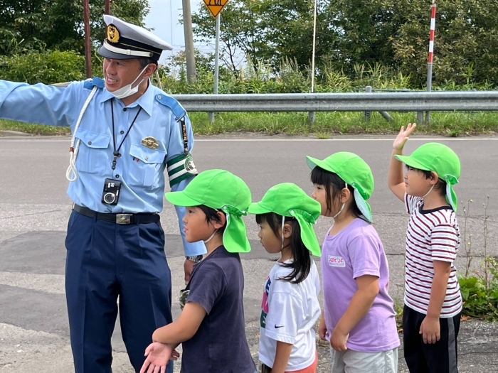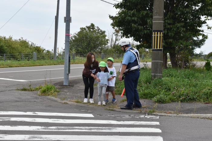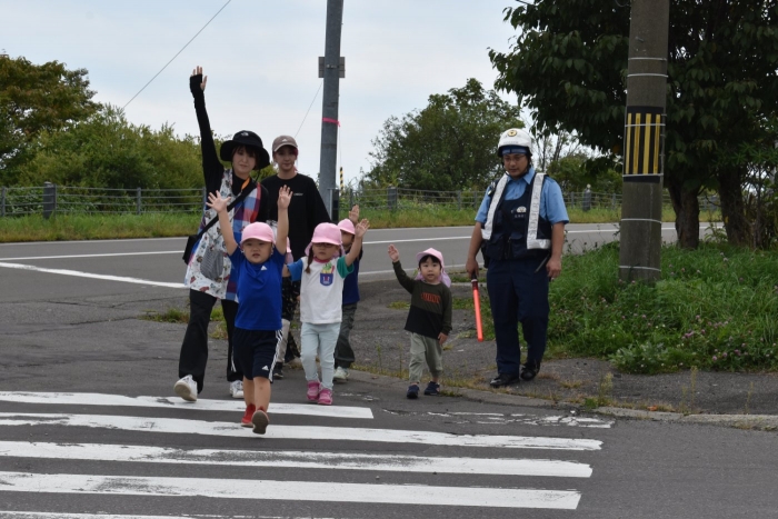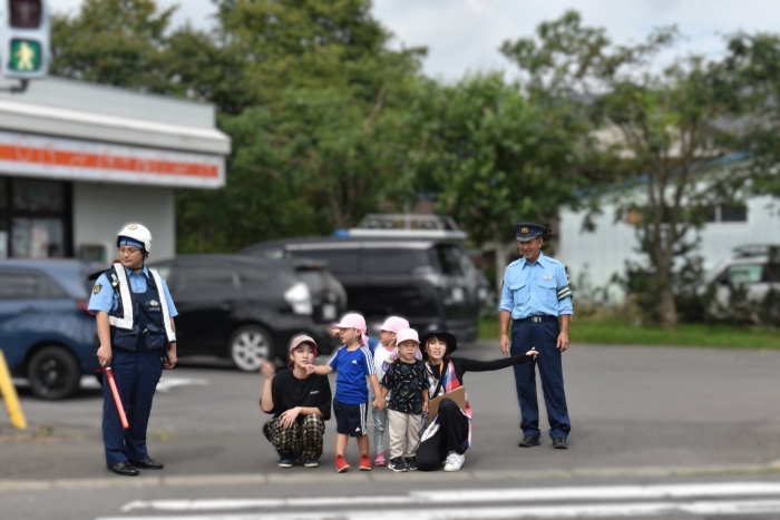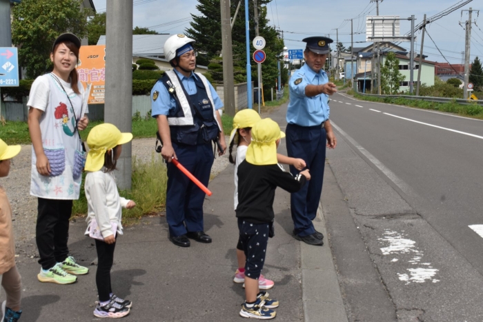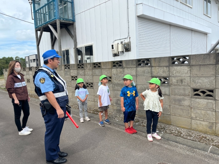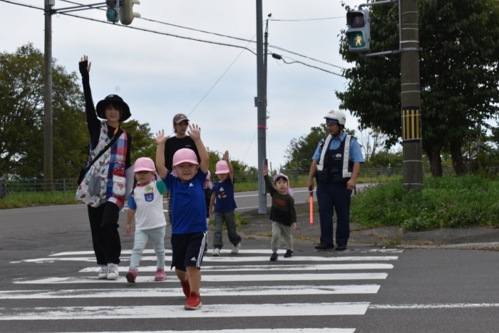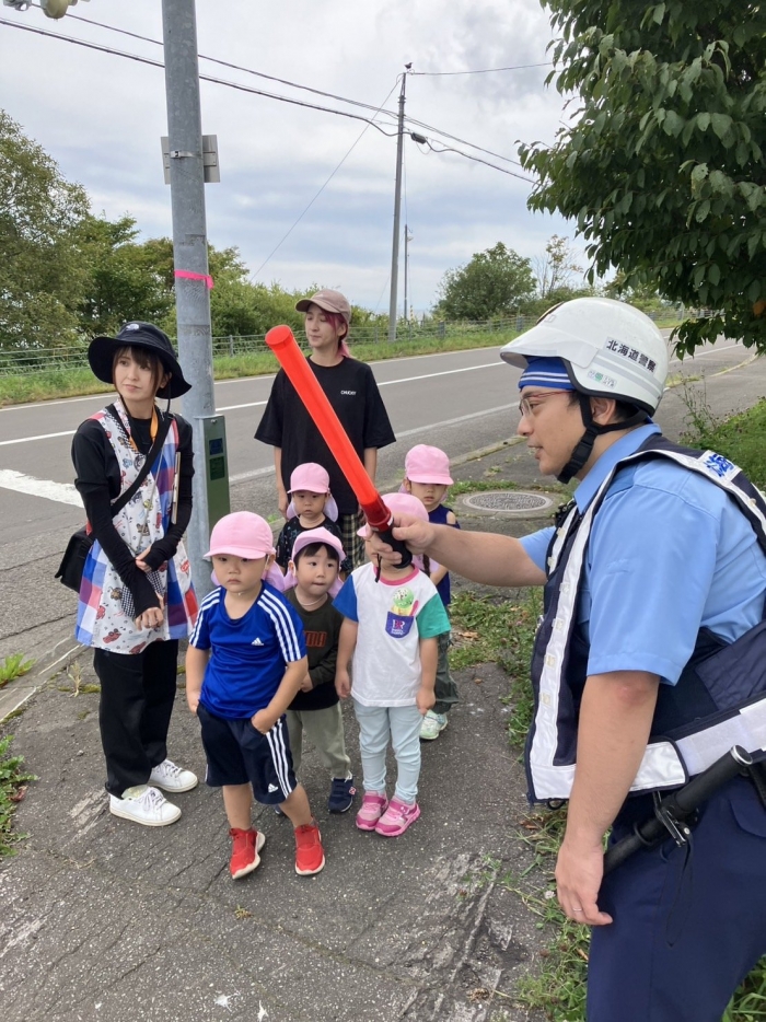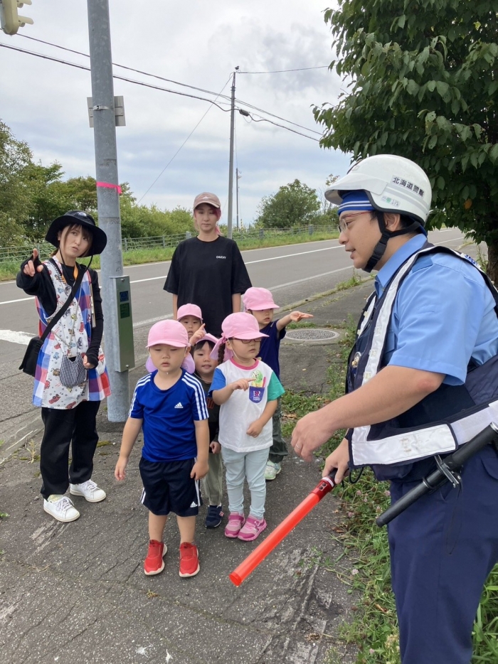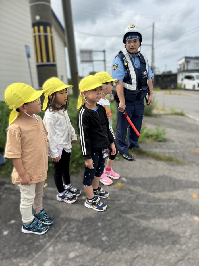 今年度第2回目の交通安全教室「こぐまクラブ」を行いました。今回は,安全に道路を渡るための具体的な方法とや危険について知ること,実際の横断歩道を渡り,信号の見方と安全確認の仕方を学ぶというねらいをもって行いました。特に,来年1年生となるさくら組のお友達は,今日の訓練でしっかりと交通ルールを身につけ,就学に備えなければなりませんね。訓練のために,尾岱沼駐在所と中標津警察署の警察官の方,役場生活環境課のの方,PTA活動部の担当のお母様方が来てくださり,園児への指導と,見守りを行ってくださいました。プレイルームで,事前の説明を聞き,早速外へ。今日の訓練の場所は尾岱沼セイコーマート様前の交差点ですが,そこへ向かうまでの道のりも,すべて交通安全のお勉強となりますので頑張ってくださいね!