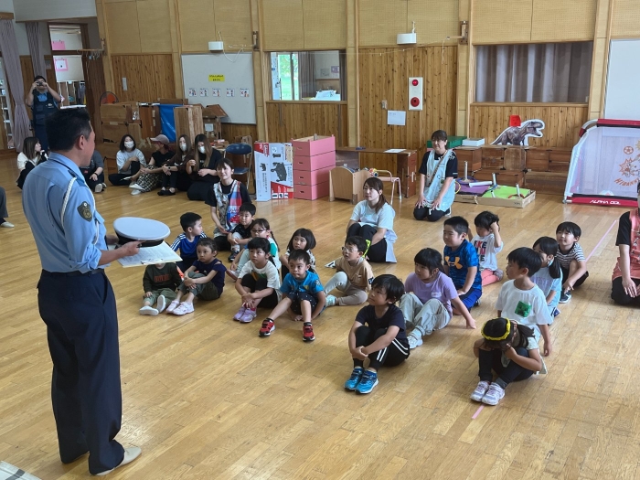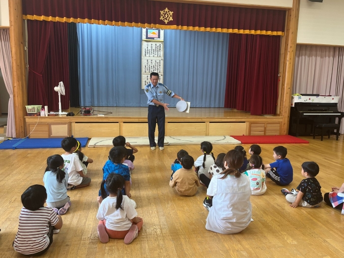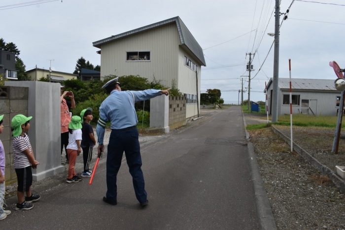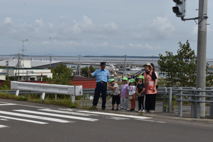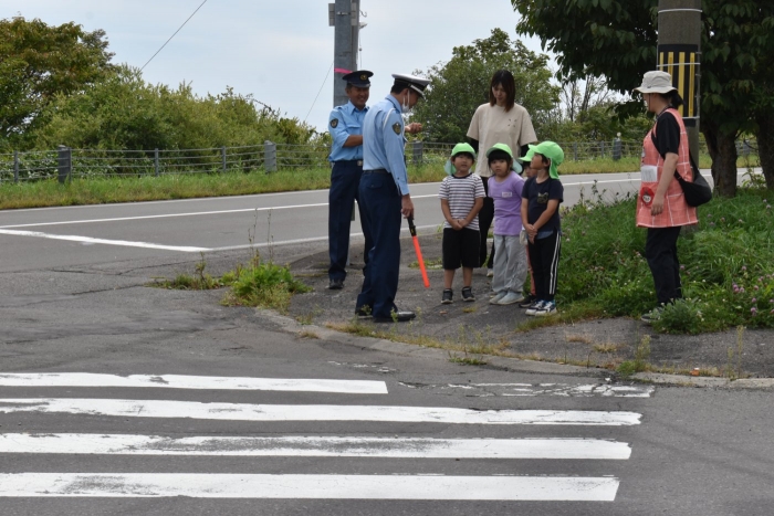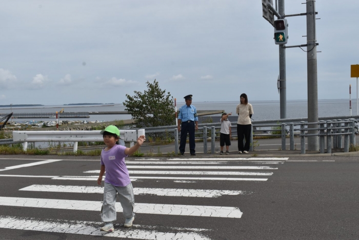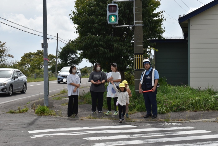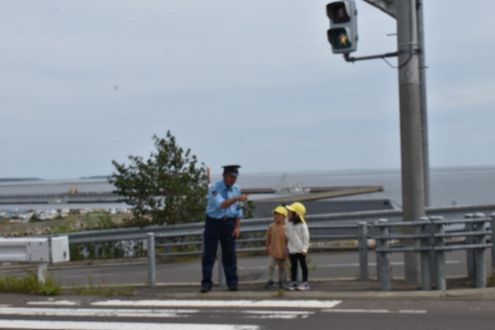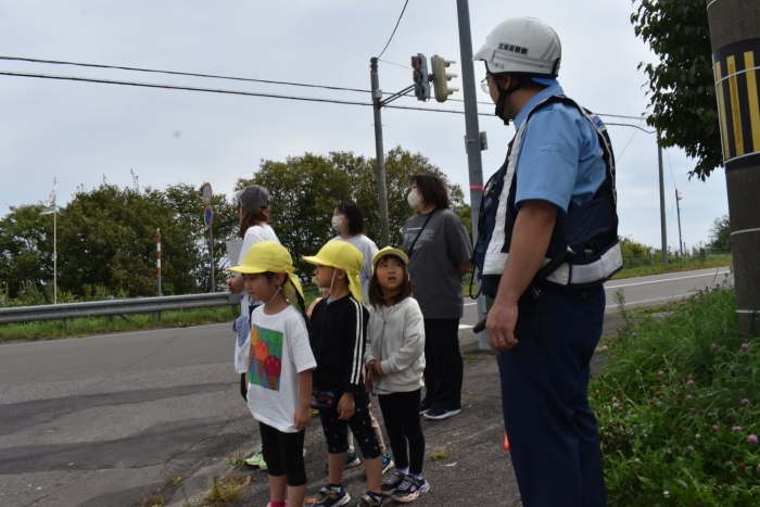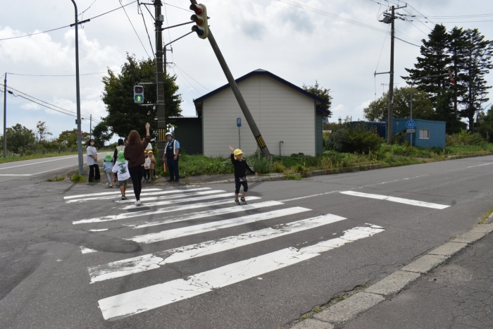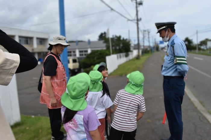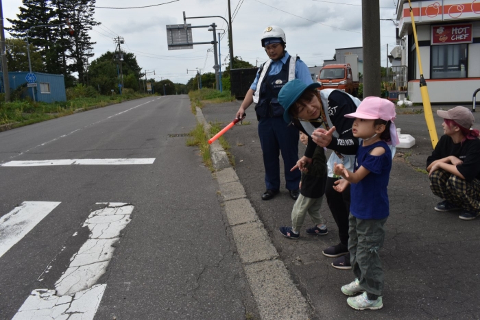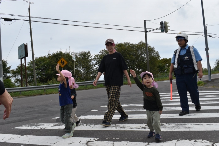 今年度第2回目の交通安全教室「こぐまクラブ」を行いました。今回は,安全に道路を渡るための具体的な方法とや危険について知ること,実際の横断歩道を渡り,信号の見方と安全確認の仕方を学ぶというねらいをもって行いました。特に,来年1年生となるさくら組のお友達は,今日の訓練でしっかりと交通ルールを身につけ,就学に備えなければなりませんね。訓練のために,尾岱沼駐在所と中標津警察署の警察官の方,役場生活環境課のの方,PTA活動部の担当のお母様方が来てくださり,園児への指導と,見守りを行ってくださいました。プレイルームで,事前の説明を聞き,早速外へ。今日の訓練の場所は尾岱沼セイコーマート様前の交差点ですが,そこへ向かうまでの道のりも,すべて交通安全のお勉強となりますので頑張ってくださいね!
