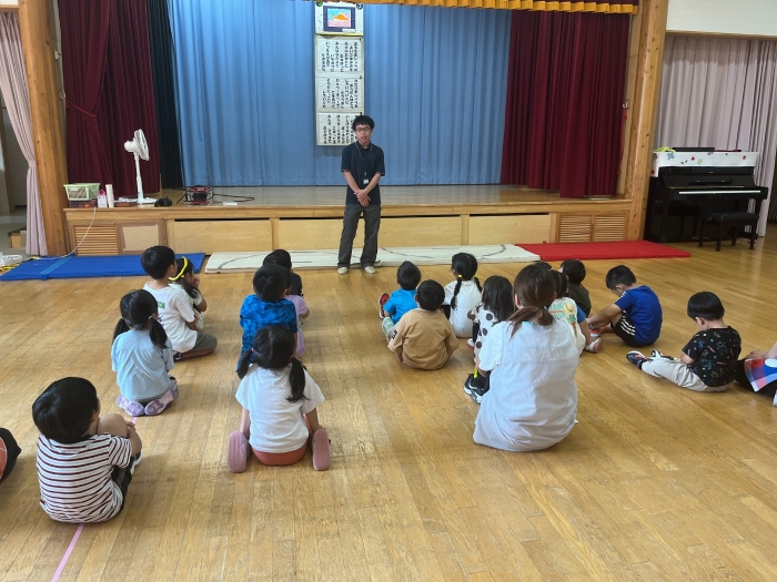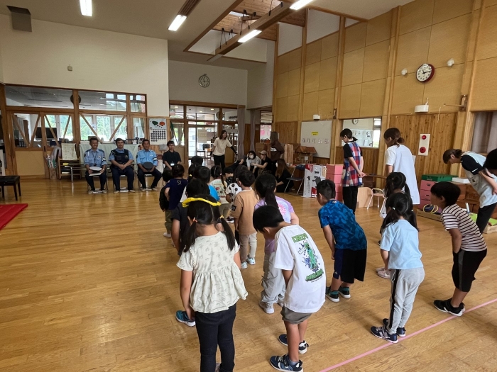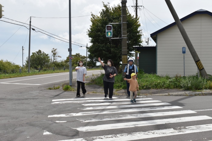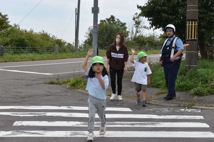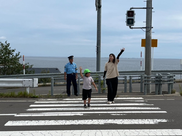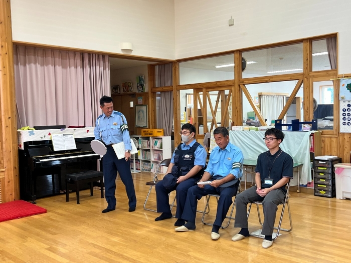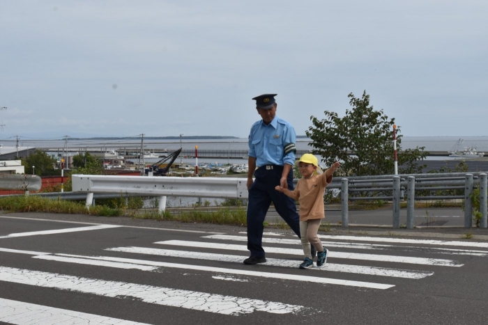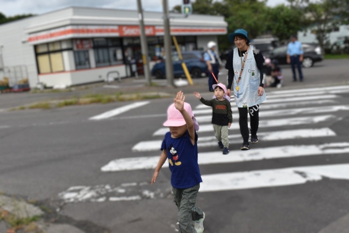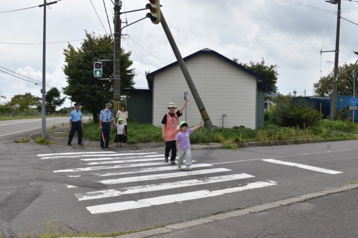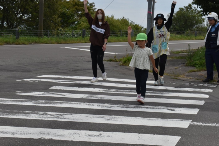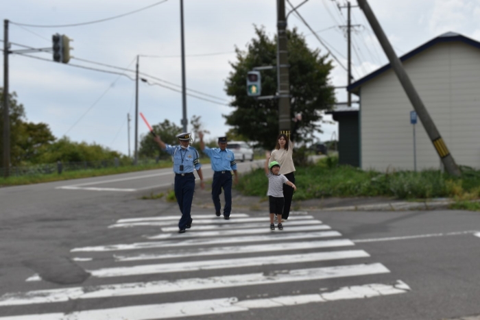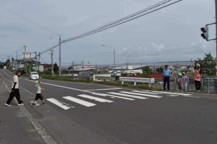 今年度第2回目の交通安全教室「こぐまクラブ」を行いました。今回は,安全に道路を渡るための具体的な方法とや危険について知ること,実際の横断歩道を渡り,信号の見方と安全確認の仕方を学ぶというねらいをもって行いました。特に,来年1年生となるさくら組のお友達は,今日の訓練でしっかりと交通ルールを身につけ,就学に備えなければなりませんね。訓練のために,尾岱沼駐在所と中標津警察署の警察官の方,役場生活環境課のの方,PTA活動部の担当のお母様方が来てくださり,園児への指導と,見守りを行ってくださいました。プレイルームで,事前の説明を聞き,早速外へ。今日の訓練の場所は尾岱沼セイコーマート様前の交差点ですが,そこへ向かうまでの道のりも,すべて交通安全のお勉強となりますので頑張ってくださいね!