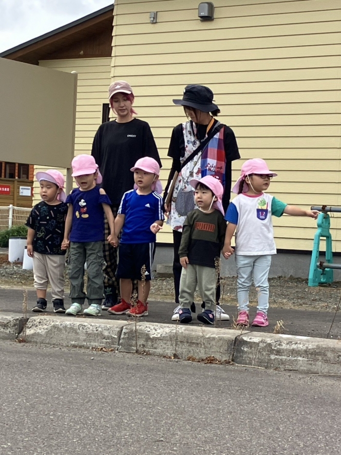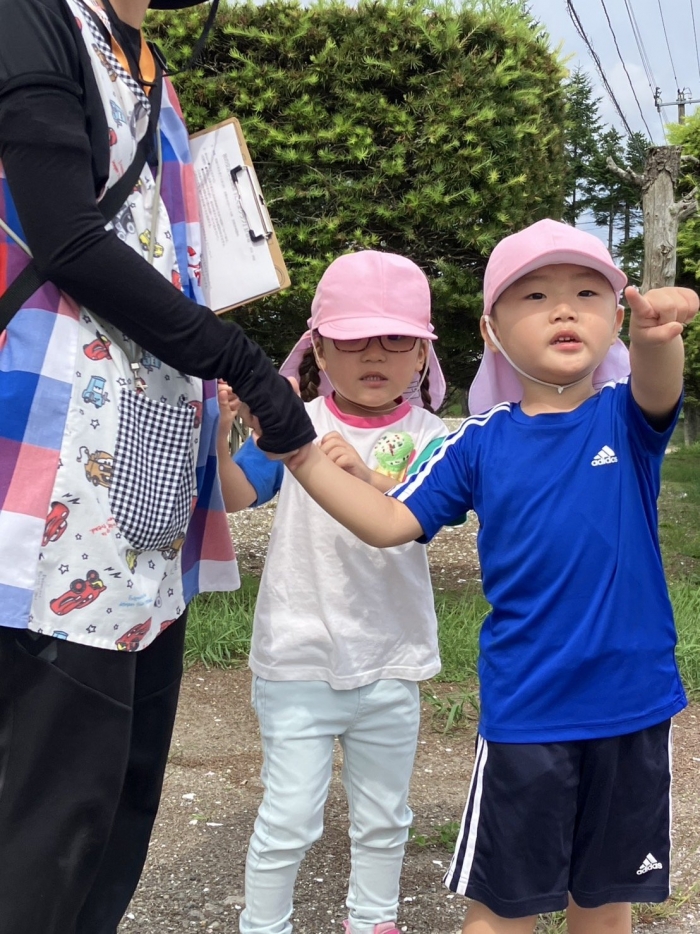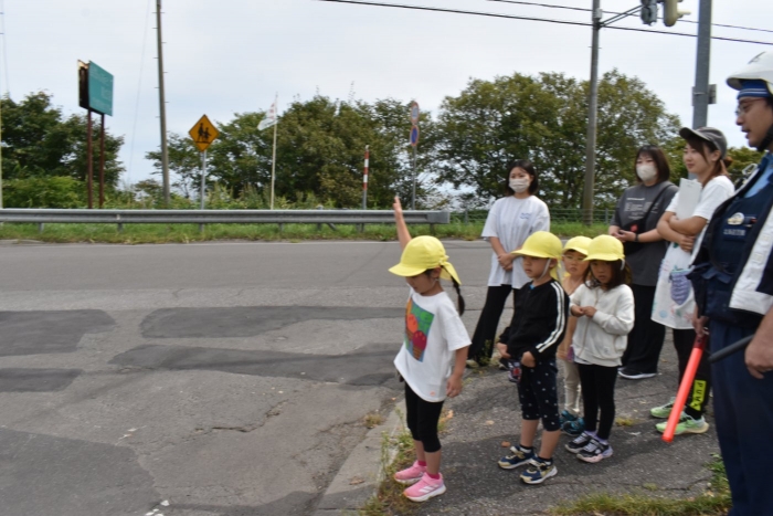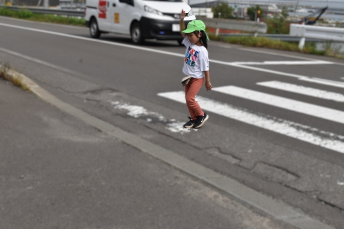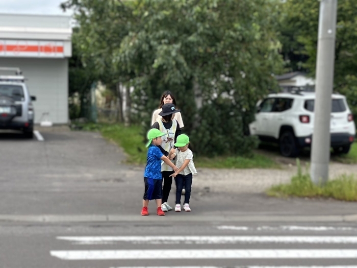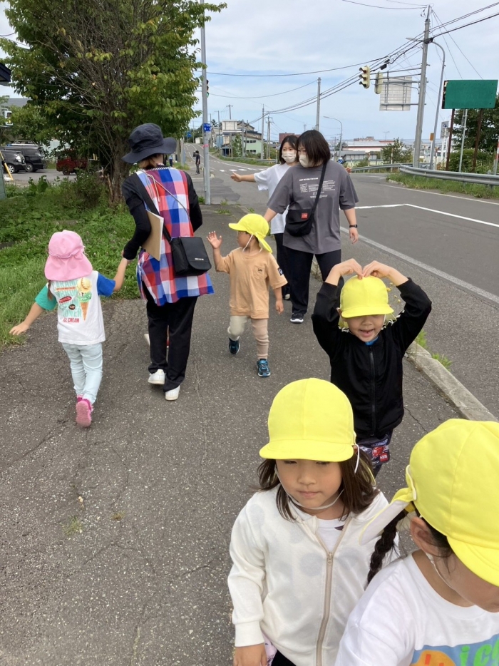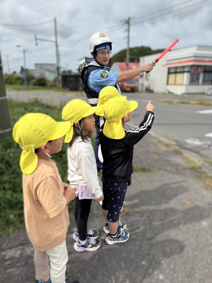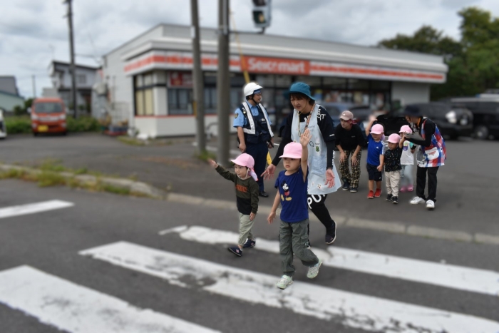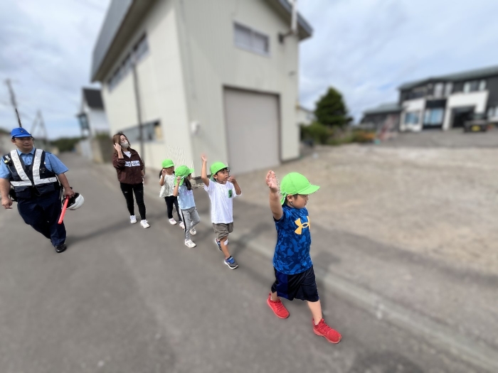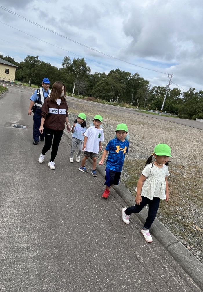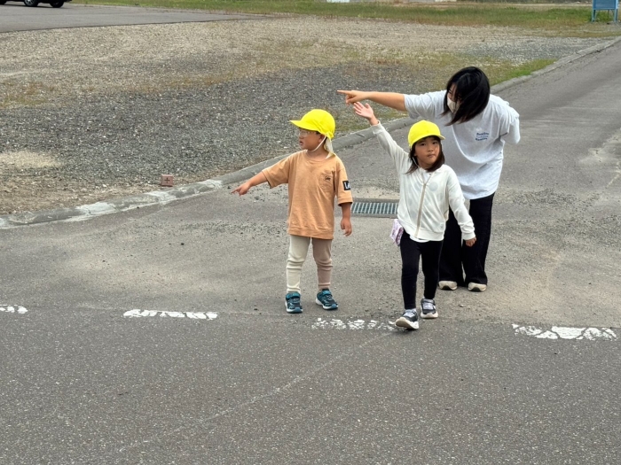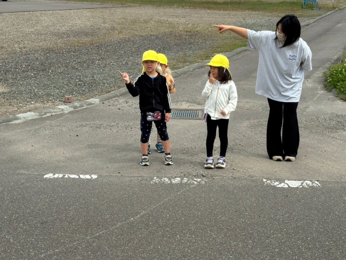 先生方は,子どもたちが道路を歩いているときの様子(道路の危険性を感じているか,信号の見方や横断の仕方を理解しているか,ちゃんと安全確認を自分の目でできているか,目線はちゃんと車を捉えているか)などの姿を,改めて確認することができました。今後も日常保育の中でも,交通安全について意識をしていけるように指導をしていきたいと思います。各ご家庭におかれましても,ちょっとした登降園時などを利用し,親子で歩く練習をしていただけますよう,どうろよろしくお願いいたします。