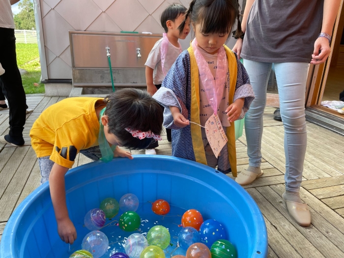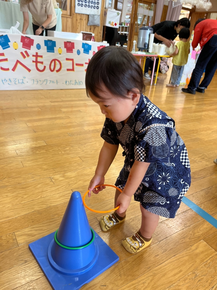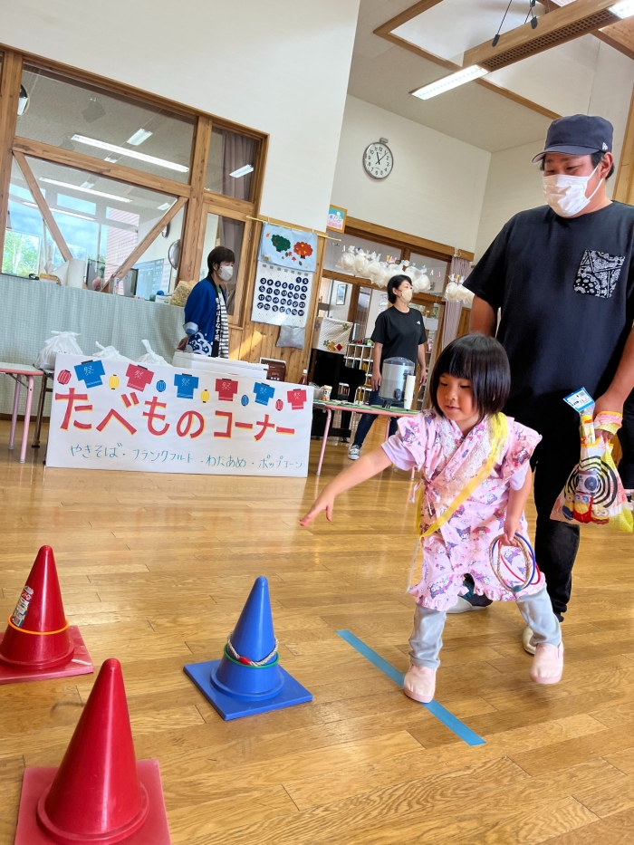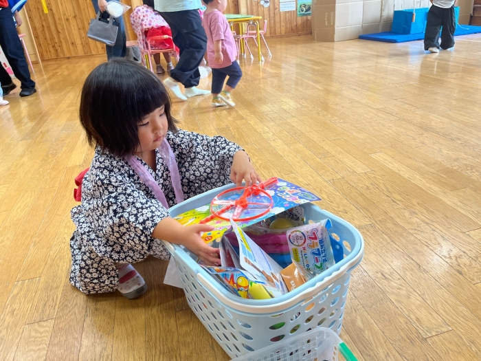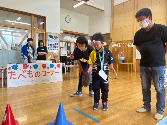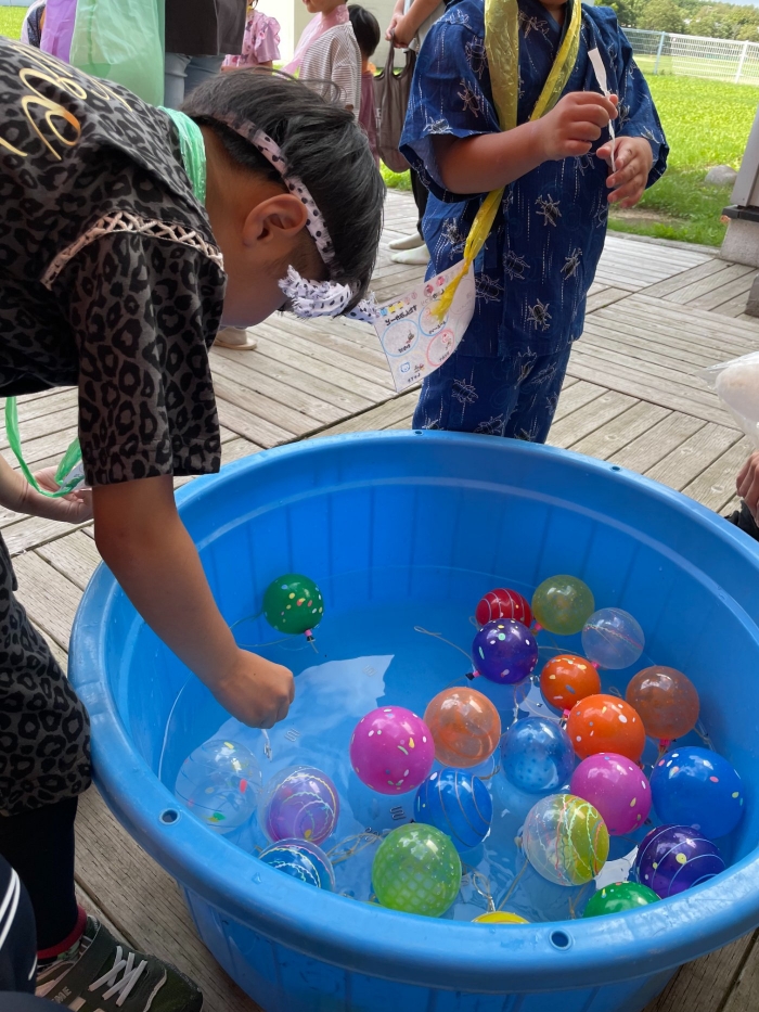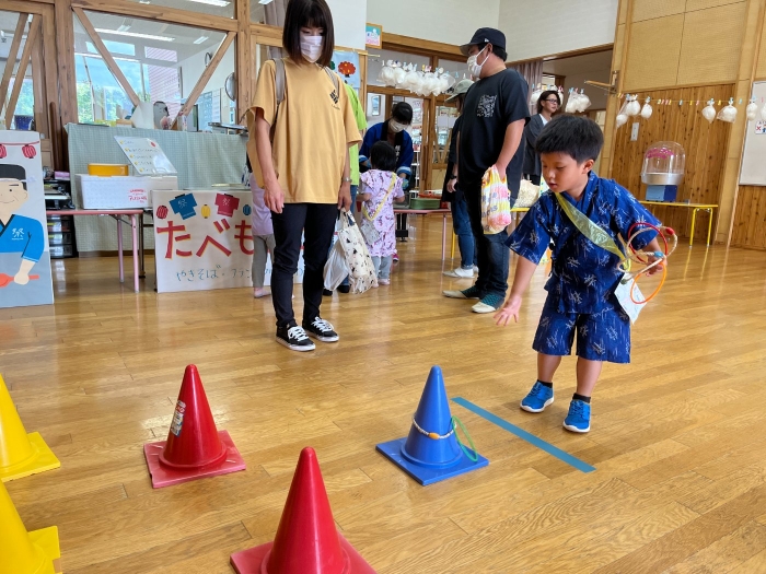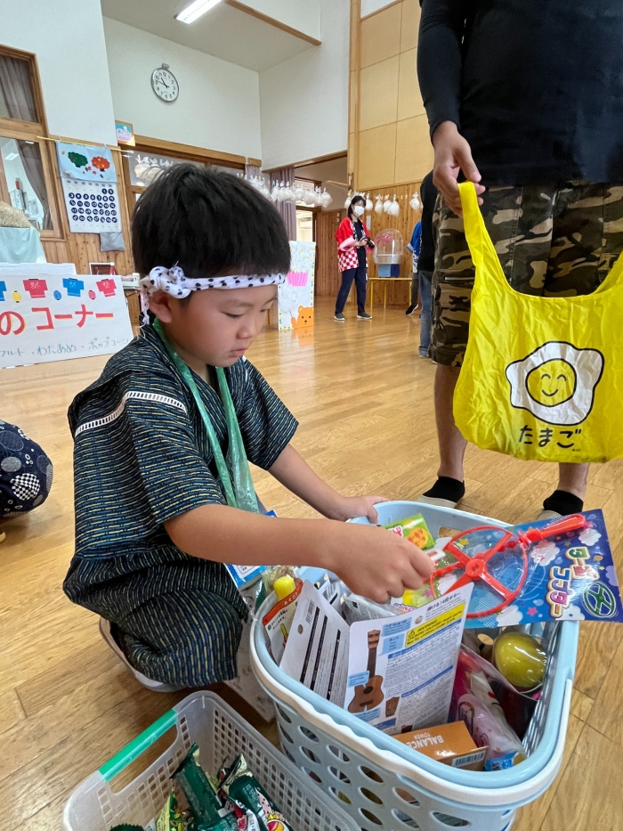 「おまつり、たのしみ~」と期待を膨らませていた子どもたち、浴衣や甚平姿の子も多く、朝からワクワク(^^)/雰囲気はバッチリ! お父さんの参加も多く、ご家族で縁日を回ったり、一緒に遊んだり、給食も食べたりして童心に返ったのではないでしょうか。楽しそうな子どもたちの笑顔にあふれたあきまつり、大成功でした。