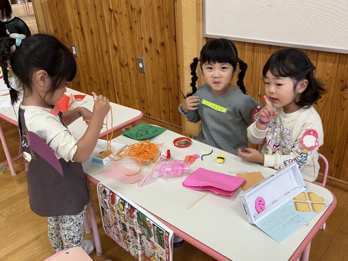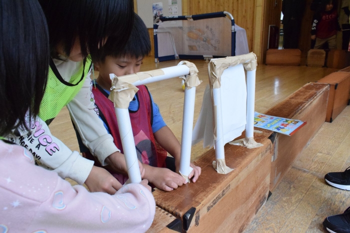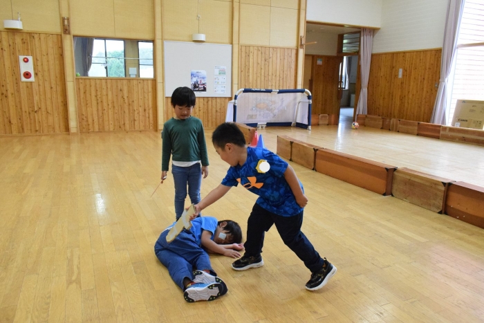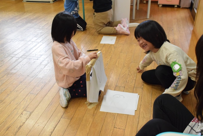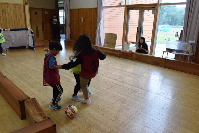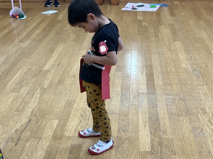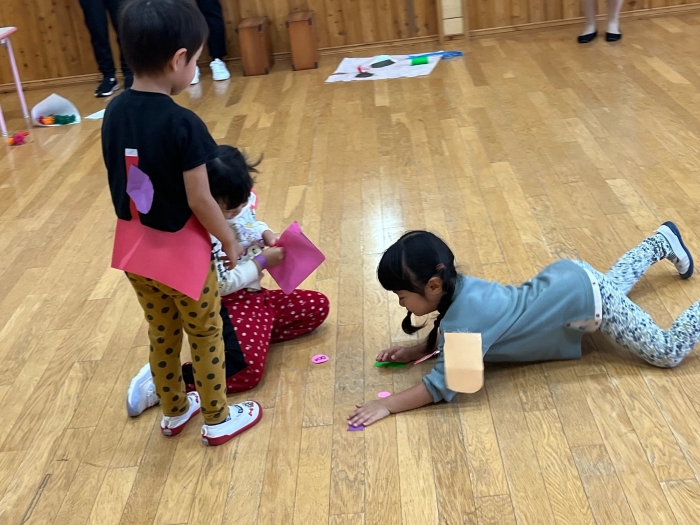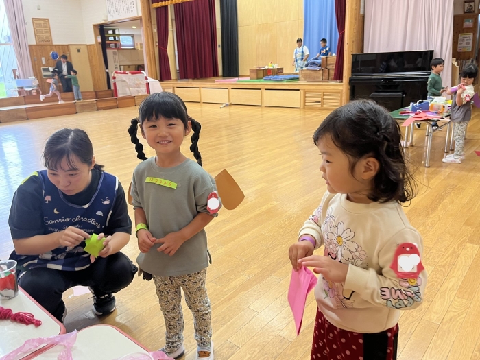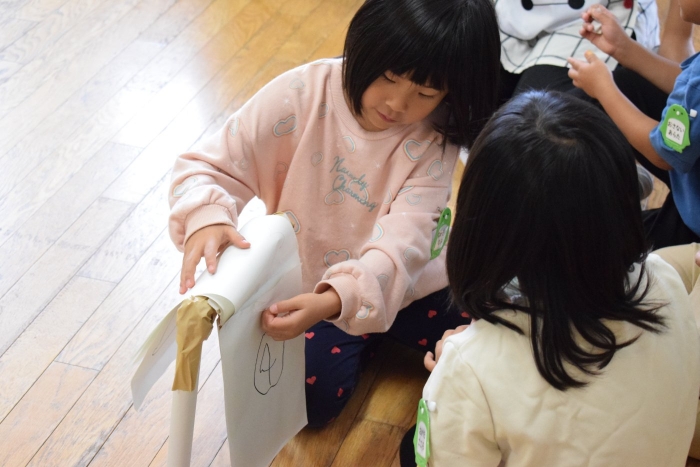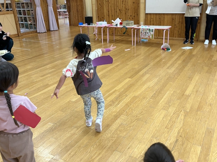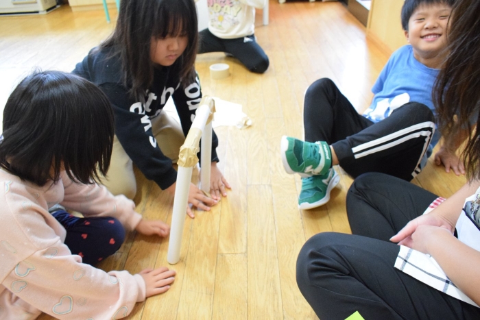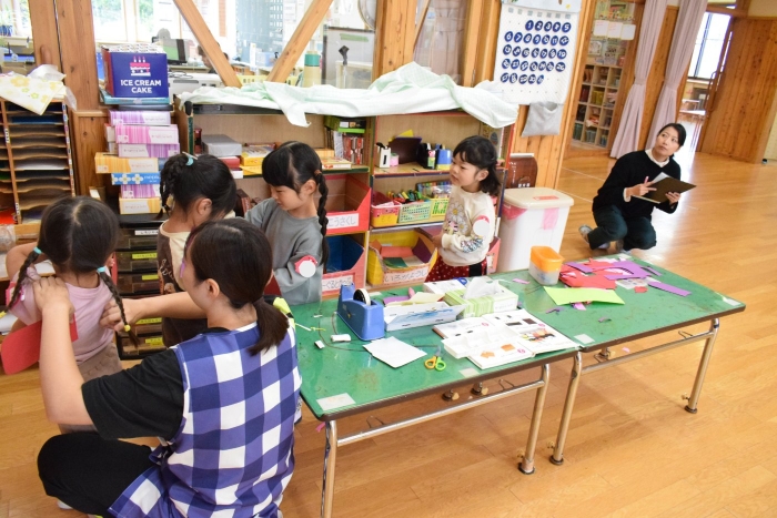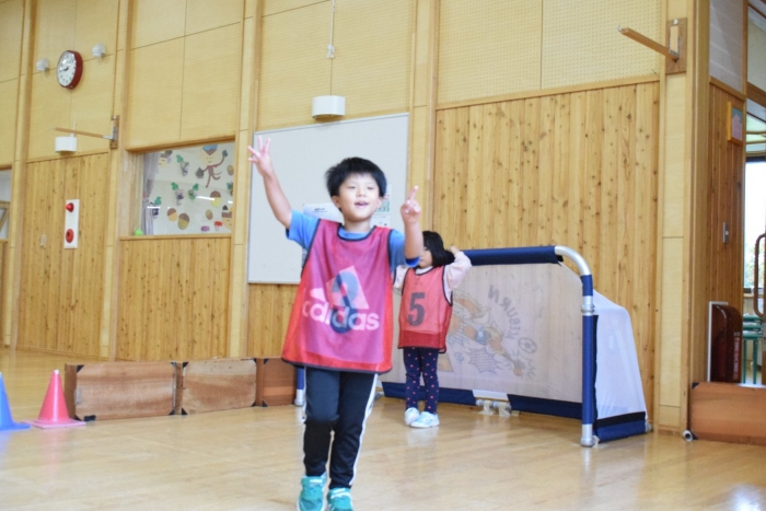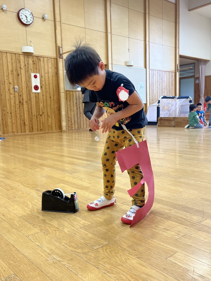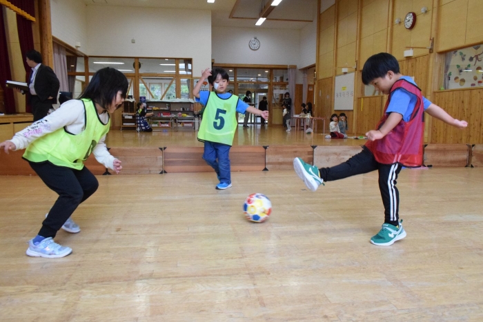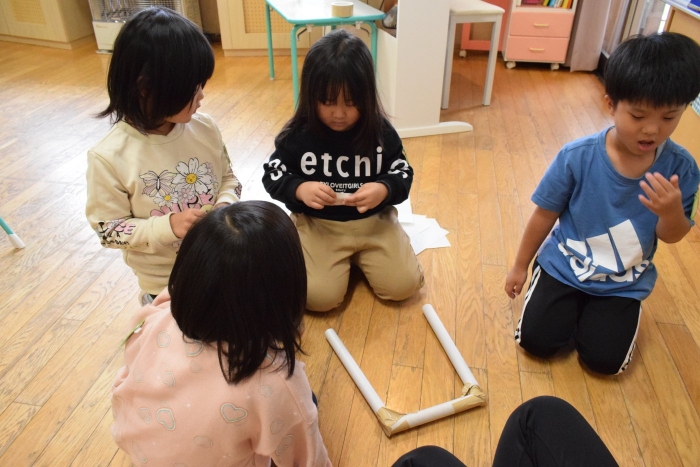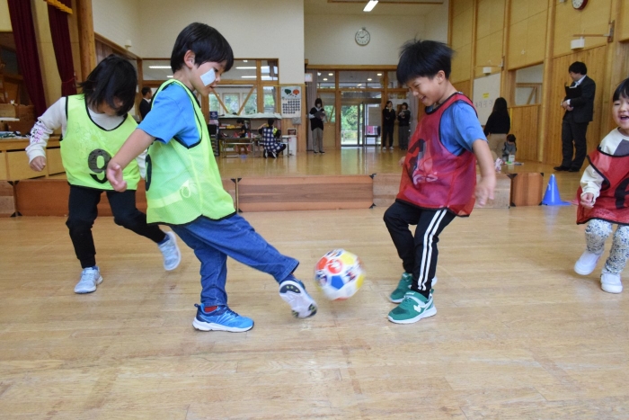 サッカーコートの補修をするももさん、チョウチョになって友達と一体感をもって飛び回るうめさん、サッカーの得点版作りに試行錯誤するさくらさん、など友達との会話を楽しみながら遊びを進めている姿がありました。
