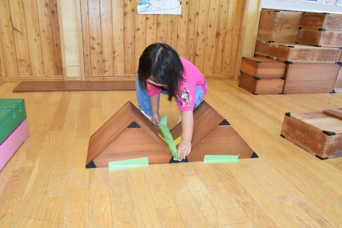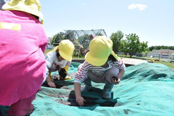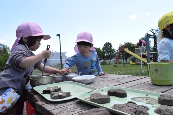 外遊びではまっしぐらに泥に向かう子ども達。やりたい遊びが決まっていて使いたい道具を自分で用意して取り組む姿に遊びに対する意欲が伺えます。同じ場を共有して、友だちのやり方に刺激を受けたり、自分の出来ばえを見せたり、遊びをどんどん広げています。泥んこは洗濯をしてもなかなか落ちないので、できれば泥遊び専用の服を用意していただけると思いっきり汚せて遊びも充実することと思います。よろしくお願いします。