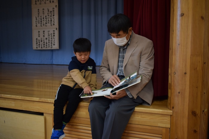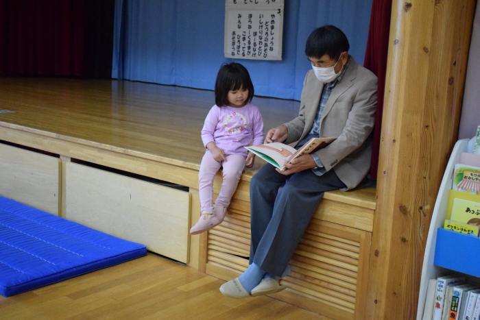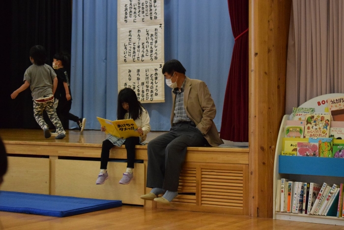 先生たちもお勉強が大事!ということで、今日はもも組さんのクラス公開研修を行いました。教育相談員で畑の先生でもあるH先生に来ていただき、今回はもも組さんの子ども達の様子や先生の関わり方などを見ていただきました。子ども達は芋植えの時にお世話になったので親しみを感じて絵本を読んでもらったり、お話したり、積極的に関わっていましたよ。