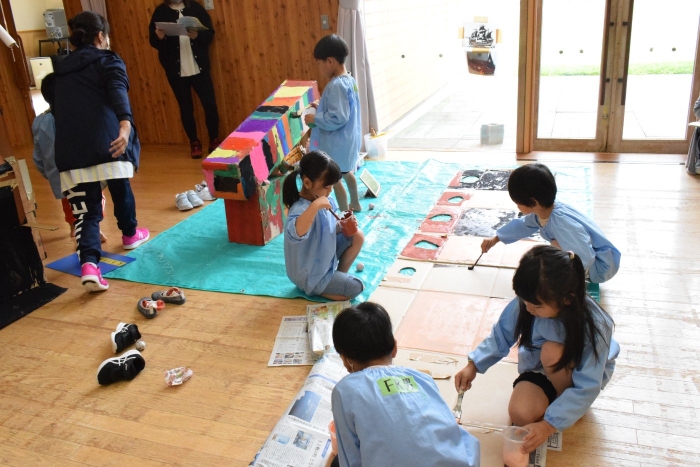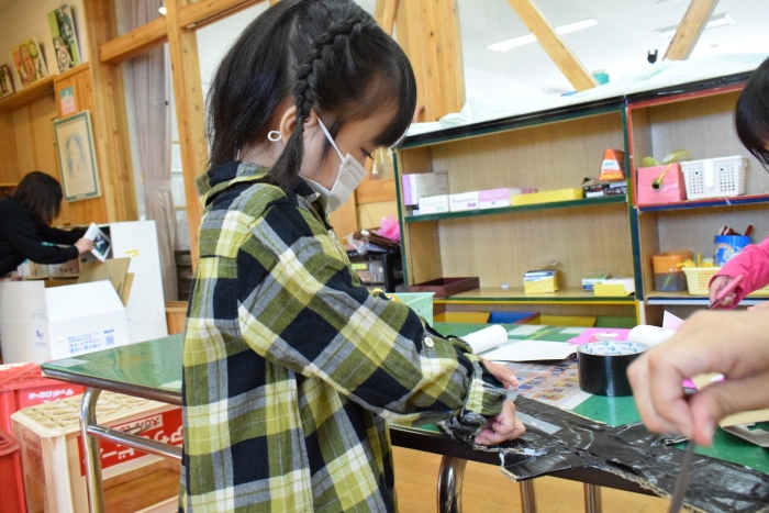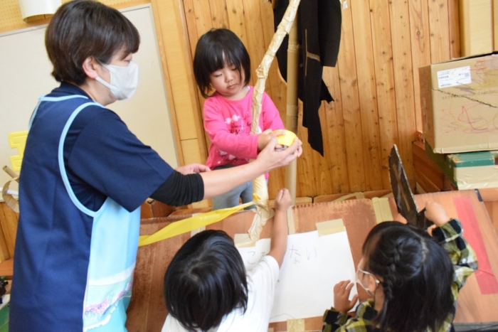 さくらさんが海賊船に色塗りをしているのに刺激されうめさん、ももさんも敵をイメージして段ボールに色塗りをしていました。頭や足までペインティングされていた子もいました( ;∀;) 申し訳ありませんがお風呂に入ったときにチェックしてあげてください(>_<)